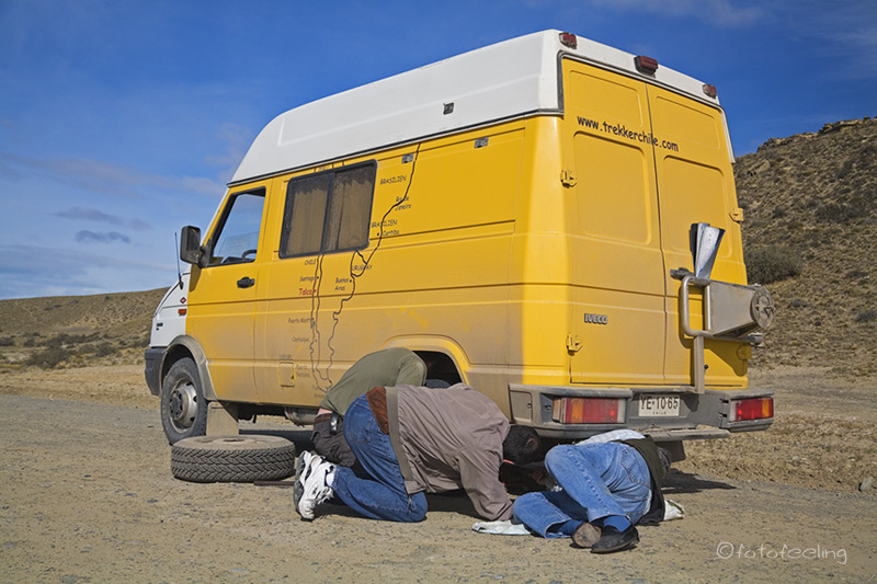 Wir quälten uns nach einer wiederum bitterkalten Nacht aus unseren warmen kuscheligen Schlafsäcken und stapften müde durch den frostigen Morgen im Dunkeln auf den Hügel hinauf. Der Anblick des Paine-Massivs ist jedoch so überwältigend, dass sich das Frieren und frühe Aufstehen mehr als lohnt. Auch an diesem Morgen waren keine Wolken am Himmel, dafür lag aber leichter Nebel über dem See und mit dem wärmenden Kaffee in der Hand war es wieder ein echter Hochgenuss, dem Farbenspiel zuzuschauen. An diesem Morgen entschieden wir uns weiter zu fahren, aber es fiel uns sehr schwer, von dieser einmalig schönen Landschaft Abschied zu nehmen. Wir machten noch einige Fotostopps an einer Flamingolagune und einer Herde Guanakos, die wunderschön vor den Bergen grasten und fuhren dann schweren Herzens wieder nach Cerro Castillo zurück. Dort holten wir uns noch einmal in der Cafeteria die leckeren Empanadas und fuhren weiter nach Puerto Natales, wo wir die schöne Hafenkulisse bewunderten. Da es jedoch noch viel zu früh zum Verweilen war, entschieden wir uns, an diesem Tag noch bis Punta Arenas zu fahren. Auf dem Weg dorthin kamen wir an einer riesigen Gedenkstätte der Difunta Correa vorbei. Überall standen kleine Kapellen - teils mit brennenden Kerzen, davor lagen unzählige volle Wasserflaschen. Da mussten wir natürlich erst einmal anhalten und uns genauer umschauen. Die Legende der Difunta berichtet von einer jungen Frau, die mit ihrem Baby dem Bataillon ihres kranken Mannes zu Fuß folgte. Als ihr das Wasser und die Vorräte ausgingen, starb sie, das Baby an die Brust gebettet. Vorbeiziehende Maultiertreiber fanden sie so und zu ihrem Erstaunen lebte das Kind - von der toten Mutter ernährt. Sie wird interessanterweise besonders von den LKW-Fahrern verehrt, die immer wieder volle Wasserflaschen an den kleinen Kapellen abstellen, um den Durst der Difunta Correa zu löschen. Aber auch andere Dinge werden gespendet, so liegen mancherorts sehr viel Schrott und stellenweise so viele Autoteile, dass man sich fast daraus ein Auto zusammenbauen könnte. Solche Gedenkstätten sahen wir immer wieder vom Norden bis nach Ushuaia mehr oder weniger groß, aber alle sehr gepflegt und gut besucht. Kurz vor Punta Arenas riefen wir Sebastian von Trekker Chile an und erfuhren, dass gerade jemand von Trekker Chile vor Ort war, der mit uns gleich zum TÜV fahren würde. Am TÜV mussten wir zwar etwas warten, aber dann kam unser „Bully“ gleich an die Reihe. Es dauerte ca. 1,5 h, bis unser Auto seine neue TÜV-Plakette erhielt. In einer Werkstatt wollten wir gleich noch den Ölwechsel machen lassen, leider war es schon kurz vor Feierabend und der Filter musste erst noch besorgt werden. So machten wir einen Termin für den nächsten Morgen aus. Wir suchten dann noch ein Reisebüro, zu dem Sebastian das neue Versicherungspapier für unser Auto schicken wollte, aber leider hatte es nicht geklappt. Jetzt stand wieder die Frage nach einer Campsite an. Zuerst wollten wir es bei der Pinguinkolonie versuchen, aber an der Abzweigung von der Teerstraße stand kein Campingschild und auf gut Glück wollten wir nicht mehr so weit (38km) fahren. Also fuhren wir in die andere Richtung zum Park „Laguna Parillar“ und kamen dort mit dem letzten Dämmerlicht an. Der Park hatte feste Öffnungszeiten und wir hatten Glück, noch hineinfahren zu dürfen. Am Parkeingang bekamen wir gleich noch Feuerholz zum Grillen. Eine sehr schöne Campsite mit Feuerhäuschen erwartete uns und wir fühlten uns gleich heimisch. Mit uns war nur ein weiterer Camper da und so hatten wir den Platz fast für uns alleine. Nach einem leckeren Grillgang schliefen wir bald tief und fest. Tageskilometer: Torres del Paine NP - Punta Arenas - Laguna Parilla 500 km Übernachtung: Camping Laguna Parilla (12000 Peso) - Chile Parkeintritt: 1000 Peso |