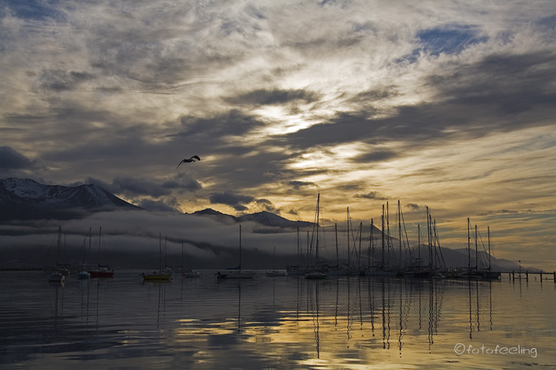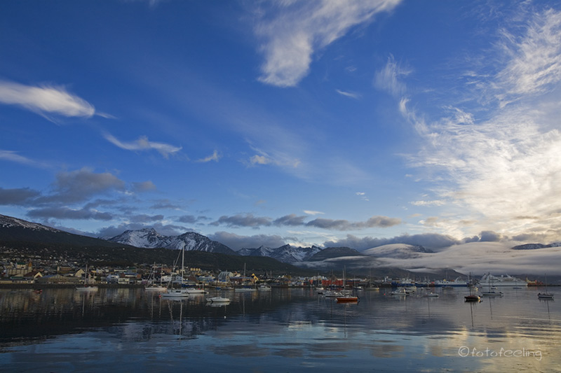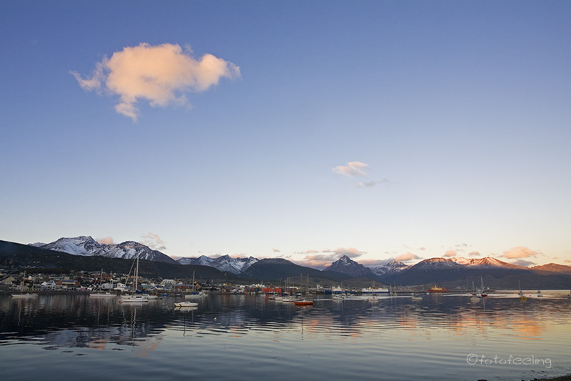 Dicke graue Regenwolken bedeckten den Himmel, aber es war viel wärmer als in den letzten Nächten und über dem Meer leuchtete der Sonnenaufgang in verschiedenen Gelbtönen. Wir machten noch einen kurzen Stopp an dem Schiffswrack „Lord Lonsdale“ und fuhren dann weiter in die Werkstatt. Leider dauerte es doch etwas länger und so kamen wir erst mittags weg aus Punta Arenas. Das Wetter war zum Glück nicht schlechter geworden, aber es war bewölkt und es kamen immer noch dicke Wolken vom Meer nach. So hatten wir leider auch in San Gregorio kein Sonnenlicht für die schönen rostigen Schiffswracks, aber es war trotzdem sehr eindrucksvoll. Wir legten an der Fähre zum Feuerland eine Punktlandung hin, denn kaum waren wir auf der Fähre, schon startete sie. Keine 20 Minuten später legten wir auf Feuerland an. Während der Fährfahrt begleiteten uns Delfine und auch Pinguine konnten wir immer wieder entdecken. Sogar die Sonne ließ sich wieder blicken und wir fuhren durch eine flache Küstenlandschaft unserem Tagesziel Ushuaia entgegen. Bis zur argentinischen Grenze war die Piste sehr schlecht. Schlaglöcher und Wellblech begleiteten uns ca. 120 km lang bis nach San Sebastian. Wir brauchten bis dahin über zwei Stunden und dachten schon, dass wir es unmöglich bis nach Ushuaia schaffen könnten. An der Grenze war viel los, aber eine halbe Stunde später waren wir in Argentinien und unsere Fahrt konnte weiter gehen. Zum Glück war ab der Grenze die Straße geteert, da sollten die restlichen 300 km natürlich kein Problem mehr sein. Je südlicher wir kamen, desto mehr veränderte sich die Landschaft und anstelle der flachen Felder und Wiesen gab es große wilde Wälder. Die Bäume sahen fetzig aus und waren stellenweise von Moosen bewachsen, so dass man sich vorkam wie in einer anderen Welt, in der es noch Feen und Kobolde gibt. Langsam kamen auch wieder Berge in Sicht. Leider wurde das Wetter wieder schlechter, aber nach dem Paso Garibaldi rissen die Wolken auf und wir kamen im schönsten Abendlicht in der südlichsten Stadt der Welt an. Ushuaia liegt am Beagle-Kanal und wird von bis zu 1500 m hohen Berggipfeln und Gletschern eingerahmt. Sie ist das wichtigste Tor zur Arktis und viele Kreuzfahrtschiffe legen in ihrem Hafen an. Hier mussten wir uns erst wieder im Stadtverkehr zurecht finden. Chris hatte ja nun schon etwas Übung darin, auch wenn wir bis heute nicht verstanden haben, welche Straße wann und warum Vorfahrt hat. Auf den ersten Blick enttäuschte uns Ushuaia etwas. Irgendwie hatten wir mehr erwartet, aber je länger man sich dort aufhält, desto mehr bekommt man von ihrem Charme mit und umso wohler fühlt man sich. Rückblickend war es eine der schönsten und gemütlichsten Städte, in der wir einige Zeit verbracht haben, und kann sich von ihrer Kulisse her mit Kapstadt messen. Nachdem wir uns etwas umgeschaut und fotografiert hatten, beschlossen wir, essen zu gehen. Wir suchten uns im Reiseführer das Restaurant „Kaupé“ aus und gönnten uns jeder ein leckeres Fischgericht (Hummerkrabben) und dazu eine schöne Flasche Wein. Da das Restaurant etwas erhöht lag, hatte man von dort einen tollen Blick auf Ushuaia und das Meer und wir genossen den Luxus. Wir wurden zwar nicht wirklich satt, aber das Essen war spitze und sehr edel. Danach mussten wir ja noch eine Campsite suchen, aber dank einem Tipp der Restaurantbesitzerin fanden wir sehr schnell den Campingplatz „Rio Pippo“. Chris erledigte die Anmeldung und ich baute in der Zwischenzeit unser Bett. Als er wieder kam, drückte er mir eine Steaksemmel in die Hand, die ihm der Hausherr mitgegeben hatte. Da wir ja sowieso noch etwas Hunger hatten, kam dieser Snack gerade recht. Da es im Restaurant auch Internet gab, gingen wir noch einmal hinein und Chris bekam sein erstes Bier in einer 1 l Flasche serviert. Da ich nun mit dabei war, kam der Hausherr gleich noch einmal an und drückte mir auch eine Steaksemmel in die Hand. Das war vielleicht lecker und super nett. Wir meldeten uns per Blog bei unseren Freunden und gingen später satt und zufrieden schlafen. Tageskilometer: Laguna Parilla - Punta Arenas - Ushuaia 686 km Übernachtung: Camping Rio Pippo, Ushuaia ( 26 Peso) - Argentinien Fähre Chile: 12000 Peso |
