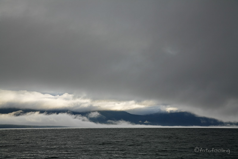 Um 7.30 Uhr fuhren wir los, denn wir mussten ja noch ein paar Kilometer bis zu unserem Katamaran in Puerto Bandera fahren und wollten noch ein paar Fotostopps einlegen. Am Hafen kamen wir pünktlich um 8.30 Uhr an, zahlten vor Ort noch den Parkeintritt und gingen dann an Bord. Das Schiff war vielleicht toll – ein zweistöckiger Katamaran der Luxusklasse. Zuerst war Chris etwas enttäuscht, weil wir unten saßen und oben eine bessere Aussicht gewesen wäre, aber schnell sah er ein, dass wir unten viel mehr Möglichkeiten zum Hinausgehen hatten und die Fläche einfach viel größer war. Zum Glück war das Schiff auch nicht ausgebucht und so hatten wir drei Sitzplätze für uns zur Verfügung. Beim Ablegen begleitete uns die Sonne noch ein Stück des Weges, aber man konnte weiter vorne in den Kanälen schon die Schlechtwetterfront sehen.