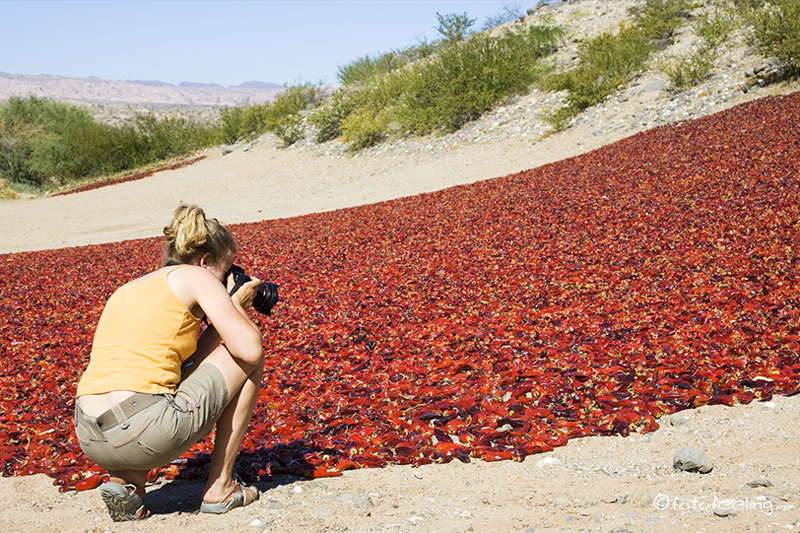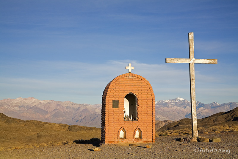 Voller Erwartung standen wir sehr früh am nächsten Morgen auf, aber leider war keine einzige Wolke mehr am Himmel. Egal, denn über das Privileg, alleine mit Martin durch den Park fahren zu können, freuten wir uns riesig. Um 7.00 Uhr ging es dann endlich los. Das erste Licht genossen wir am El-Submarino und kletterten sogar noch zu einem Loch in der Felswand, von wo man durch einen natürlichen Rahmen auf die bizarren Felsen schauen konnte. Danach ging es weiter zum „Pilz“ und noch einmal zu der „Swings“. Dann erzählte uns Martin noch von sehr großen kreisrunden Steinen, die die Natur geformt hat und fragte uns, ob wir sie sehen wollen. Natürlich wollten wir und so standen wir bald vor riesigen „Pellkartoffeln“. Es war wirklich klasse. Um 10.00 Uhr waren wir dann wieder zurück. Dort wollten wir noch für die Übernachtung bezahlen, aber Gustave winkte nur ab und wollte auch überhaupt nichts von uns haben. Wir waren wirklich sehr erstaunt, denn so viel Großzügigkeit waren wir von Afrika nicht gewohnt. Wir gaben Martin für seine sachkundige Führung und das frühe Aufstehen ein gutes Trinkgeld und verabschiedeten uns von den Beiden. Durch schöne Landschaft fuhren wir bis zum Park Talampaya. Der 215000 ha große Nationalpark wurde von der Unesco zum Weltkulturerbe erklärt und dementsprechend stolz sind auch die Ranger. Dort kamen wir leider für das beste Licht zu spät an, aber auf unsere Vormittagstour hätten wir nicht verzichten mögen. Leider kann man auch in diesem Park nur an einer geführten Tour in Kleinbussen teilnehmen. Sie finden jedoch ständig statt und auch wir konnten umgehend starten. So machten wir gleich die 11.30 Uhr Tour mit, denn später wäre zu viel Schatten im Canyon, erklärte uns ein Ranger. Die Tour war ganz nett. Es gab 4 Stopps und ausführliche Erklärungen in spanischer Sprache. So hatten wir genügend Zeit, selbst die Umgebung zu erkunden. Leider war alles sehr touristisch und die schönsten Steinformationen waren etwas unglücklich eingezäunt. Aber im Canyon konnte man die Felsen gut bewundern und erforschen. Es gibt dort sogar eine runde Aushöhlung (Chimennea del Eco) und wenn man sich dort hineinstellt und etwas ruft, hört man ein vierfaches Echo. Auch Felszeichnungen der Ureinwohner und Steintafeln mit Reiblöchern, von denen man nicht weiss, ob sie Opfertische oder Mörser waren, kann man dort besichtigen. Trotz der 2,5 h Tour hätten wir gerne etwas mehr Zeit zur Verfügung gehabt, denn auch bei Mittagslicht leuchteten die Felsen in tollen roten Farben und es hätte viel mehr zu erforschen gegeben. Da hätten wir mal wieder gerne etwas besser Spanisch gekonnt. Mittlerweile gibt es dort einen sehr schönen, wenn auch schattenlosen Campingplatz mit sauberen Duschen und Toiletten. Da es jedoch noch sehr früh am Tag war, entschieden wir uns, weiter zu fahren. Ein englisch sprechender Ranger bestärkte uns in unserem Vorhaben, denn es sollte ein sehr schöner Pass nach Chilecito führen, den man am besten im späten Nachmittagslicht fahren sollte. So machten wir uns ca. 16.00 Uhr auf den Weg. Bei Pagancillo war auf einmal die Straße gesperrt und zwei Uniformierte kamen auf uns zu. Zu unserem Erschrecken sahen wir eine große Tafel auf der etliche Früchte abgebildet waren. Natürlich fragten sie uns nach Früchten und sofort dachte ich an die ca. 3kg Weintrauben in unserer Pappkiste, die unübersehbar im Auto stand. Chris reagierte mit einem spontanen „No fruits“ und klang wohl sehr überzeugend, denn nach einem kurzen Blick in die Kühlbox durften wir weiterfahren. Hinterher mussten wir noch ziemlich lange schmunzeln, denn eine Fruchtkontrolle war uns noch nie begegnet. Fleischkontrollen kannten wir ja schon aus Botswana, aber von so einer Fruchtkontrolle, noch dazu mitten im Land, hatten wir noch nie gehört. Dann näherten wir uns dem Pass. Die Landschaft war wirklich toll. Kakteen säumten den Weg und vielfarbige Felsen leuchteten wunderschön im Nachmittagslicht. Die Straße war zwar ungeteert, aber in einem guten Zustand und sehr breit. Der Pass wird im Reiseführer sehr hoch gelobt und dementsprechend viel erwarteten wir. Leider konnte er unsere Erwartungen nicht erfüllen und wir waren etwas enttäuscht, als wir die Passhöhe von 2020 m erreicht hatten. Oben stand eine kleine Gedenkkapelle und wir schauten von dort ins Tal. Ein kleiner Hund kam zu uns und schaute uns mit hungrigen Augen an. Da fiel uns ein, dass wir ja noch Fleisch in der Kühltasche hatten. Eine größere Freude hätten wir dem kleinen Kerl nicht machen können und er vertilgte fast 300 g. Den Rest wollte Chris noch aufheben, denn er meinte: „Vielleicht läuft uns ja noch eine bedürftige Katze über den Weg.“ Kurz vor Chilecito war eine Touristeninformation und da wir nahe der Stadt campen wollten, fragte Chris dort nach dem Weg. Die Dame war übereifrig und sehr froh, endlich mal einem Touri helfen zu können und bequatschte Chris auf Spanisch mindestens 10 Minuten. Aber er kam dafür mit einem Stadtplan und genauesten Angaben zur Wegbeschreibung wieder. Wir kämpften uns durch das Straßenlabyrinth und kamen am Spätnachmittag in Los Talas auf dem Campingplatz an. Dort gab es sogar ein Schwimmbad, aber wir zogen die Dusche vor. Wir durften in der Privatdusche der Besitzer duschen. Zwar war das Wasser nur lau, aber es war sauber und geräumig und der Tag war heiss genug. Als ich fertig geduscht hatte, wartete ich auf Chris und dabei umschwärmten mich Scharen von Mücken. Zum Glück waren die nicht auf dem Campingplatz, sonst wären wir eingegangen. Auf dem Campingplatz verliebten wir uns wieder einmal in eine Katze, die natürlich unser restliches Fleisch bekam und den ganzen Abend bei uns verbrachte. Wieder eine Katze mehr, die wir am liebsten eingepackt hätten. Tageskilometer: NP Ischigualasto - NP Talampaya - Chilecito 146 km Übernachtung: Camping Los Talas - Argentinien Parkeintritt Talampaya NP: 12 Peso p. P. Tour im Talampaya NP: 35 