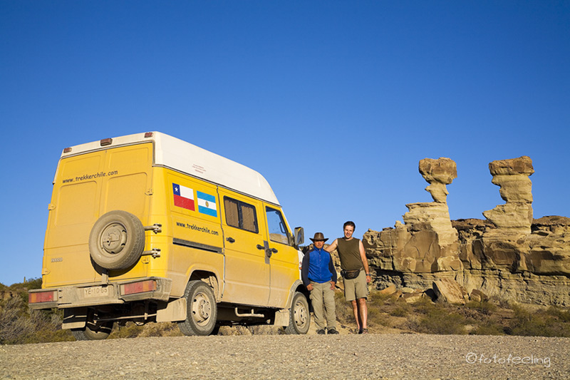 Sehr früh brachen wir an diesem Morgen auf, denn wir wollten einen sehr schönen Pass fahren und hofften auf eine aufregende Aussicht zum Sonnenaufgang. Nachdem sich unser „Bully“ brav bergauf gequält hatte, fanden wir auch einen tollen Platz mit Aussicht auf den höchsten Berg Argentiniens, den Aconcagua, der mit seinen 6962 m Bergsteiger aus der ganzen Welt anlockt. Es war sehr windig und bitterkalt, aber auch einmalig schön, wie sich das Licht langsam von der Bergspitze bis in Tal ausbreitete. Wir waren an diesem Morgen über 3100 m hoch und schon recht stolz über diesen neuen Höhenrekord. ![]() Da wir nicht wieder zurück nach Uspallata fahren wollten, hatten wir uns eine andere Strecke ausgesucht. Wir wollten eigentlich nicht über das Thermalbad fahren, denn die Strecke war auf unserer Landkarte recht kurvig eingezeichnet, aber den anderen Weg gab es nicht mehr und so mussten wir doch diese Strecke fahren, was sich als „Glückstreffer“ herausstellte. Sehr steile und enge Serpentinen durchfurchten den Berg. Wir waren mehr als froh, dass so früh noch niemand ausser uns unterwegs war und genossen jede Kurve, auch wenn wir den steilen Felswänden gegenüber sehr skeptisch waren. Wir sahen einige Steinschläge auf der Straße und auch einige „Steindurchschüsse“ an Kakteen, bei deren Anblick einem schon etwas mulmig wurde. Auch jetzt - noch im Nachhinein - ist dieser Pass unglaublich schön und bleibt uns in guter Erinnerung. 2000 Höhenmeter lagen in kurzer Zeit hinter uns und beim Herunterfahren entdeckten wir noch zwei sehr schöne wilde Campsites. Nach 65 km hatten wir wieder Teer unter unseren Reifen und fuhren an einem riesigen Zementwerk und anderer Industrie vorbei Mendoza entgegen. In einem Vorort wurden wir mal wieder umgeleitet, aber dank GPS fanden wir bald den richtigen Weg. Nach kurzem Suchen entdeckten wir dann auch eine Werkstatt, denn der 2. Ölwechsel war fällig. Es war echt klasse: wir kamen an, fuhren in den Hof und sofort sprang der Mechaniker unter unser Auto und eine Stunde später waren wir fertig und konnten weiter fahren. Es klappte aber auch nur so gut, weil Chris sich einen Ölfilter aus der Werkstatt in Punta Arenas hatte mitgeben lassen, denn hier hätten sie keinen Filter gehabt. Wir konnten uns zwar wieder kaum verständigen, aber es klappte alles hervorragend und zum Schluss bekam ich sogar noch ein Duftbäumchen für das Auto geschenkt. Auf guter Teerstraße fuhren wir in Richtung Nationalpark Ischigualasto. Wie sich herausstellte, tankten wir glücklicherweise unser Auto an der letztmöglichen Tankstelle bis kurz vor dem Park auf. Aber Chris hielt eigentlich nur an, weil am Rande der Tankstelle ein mit Weintrauben voll beladener Laster stand. Ich guckte nicht schlecht, als er kurz verschwand und bald darauf mit einer Tüte voller zuckersüßer knackiger Weintrauben wieder am Auto zurück war. Da hatten wir gleich zweimal Glück, denn unser Sprit hätte nicht bis zum Dorf Valle del Fertil nahe dem Nationalpark gereicht und die Trauben waren eine willkommene Abwechslung zum täglichen Salamibrot. ![]() Eine kleine Zwangspause mussten wir auch noch an der Hauptstraße machen, denn in der Nacht musste ein Bus von der Straße abgekommen sein und sollte gerade wieder aus dem Graben gezogen werden. So warteten wir eine halbe Stunde, doch der Laster schaffte es nicht, den Bus herauszuziehen und so ließ man uns erst einmal passieren. Von der Hauptstraße zweigte bald unsere kleine Straße zum Nationalpark ab. Sie ging auf und ab und erinnerte ein wenig an diese alten „Berg-und-Tal-Karussells“. So ging es durch unzählige Wasserfurten und wir waren uns einig, dass es sicher kein Spaß wäre, dort bei Regen durchzufahren. Ca. 16.30 Uhr kamen wir am Park Ischigualasto an. Dieses 63000 ha große Naturschutzgebiet wird auch als Valle de la Luna (Mondtal) bezeichnet, denn hier findet man verschiedenste Felsformationen, die die Fluten des heute fast ausgetrockneten Rio Ischigualasto aus dem roten Sandstein und einfarbigen Lehm geformt haben. Man kommt sich vor wie in einer anderen Welt oder auch auf dem Mond. In dieser Wüstengegend gedeihen Kakteen, die sich perfekt an diese einmalige Landschaft angepasst haben. Wir hatten riesiges Glück, denn die letzte geführte Tour des Tages begann um 17.00 Uhr und wir konnten mit unserem eigenen Auto und nur zwei weiteren Fahrzeugen an der Tour teilnehmen. Zuvor schauten wir uns noch das Museum an, in dem stolz die Fundstücke riesiger Saurierteile und Nachbildungen präsentiert wurden. Dann sollte es um 17.00 Uhr losgehen, aber die Leute des einen Autos waren noch fast 15 Minuten länger im Museum. Wir sahen schon das Licht schwinden und Chris wurde immer wütender, denn am Horizont zog eine Gewitterfront auf, die uns später das Licht kosten würde. Endlich 17.20 Uhr ging es dann los. Unser Führer Martin fuhr in einem anderen Auto mit und zeigte uns die Schönheiten des Parks. Da hätten wir Stunden verbringen können. Immer wieder setzten wir uns ab und machten schnell ein paar Bilder. Wir sahen die bekannte „Sphinx“, wanderten zu kreisrunden kleinen Steinen, hielten an einem wirklich mondähnlichen Canyon und landeten schließlich bei dem „El-Submarino“ (U-Boot). Dort war dann leider schon die Sonne hinter den Felsen bzw. Wolken verschwunden, aber die Felsen sahen trotzdem wunderschön aus. Irre, was die Natur so schafft, wenn man sie lässt. Als wir gerade wieder fahren wollten, kam doch noch einmal die Sonne heraus und eine sehr lange Felswand leuchtete im schönsten Rot. Das war vielleicht ein Farbenspiel in einzigartiger Landschaft. Zum Abschluss fuhren wir noch zum „Pilz“, eine Felsformation, die einem Pilz sehr ähnlich sieht. Hier kam die Sonne leider nicht mehr heraus, dafür waren wir zu spät, aber die Wolken im Hintergrund ließen auf einen schönen Sonnenuntergang hoffen. Wir warteten und bekamen einen atemberaubenden Sonnenuntergang geboten. Aus sanften Gelbtönen wurden kr