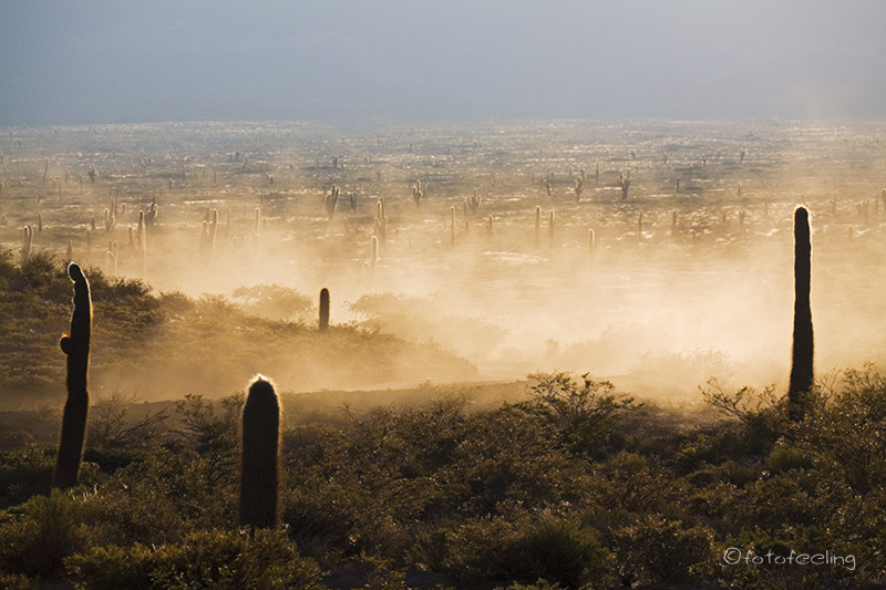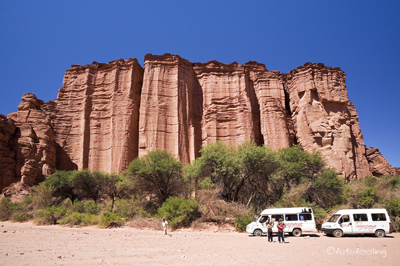 Wir starteten wie immer vor Sonnenaufgang, denn wir wollten so früh wie möglich die Ruinen von Quilmes besichtigen. Die Straße führte steil bergauf. Nach einer Weile hatten wir einen fantastischen Blick auf Tafi de Valle und das umliegende Tal mit dem See im Gegenlicht. Auf dem See lag leichter Nebel und im Hintergrund konnte man noch die dicken Wolken vom Vortag sehen, die sich noch weiter abgesenkt hatten. Der Pass führte uns langsam aber stetig auf 3024 m und nach der Passhöhe hinab in ein Tal. Hier gab es auch wieder Kakteenwälder, die zum Teil haushoch waren. Nach 75 km kamen wir um 9.00 Uhr bei den Ruinen von Quilmes an. Hierbei handelt es sich um die Überreste einer städtischen Siedlung der Quilmes-Indianer, wo einst bis zu 5000 Menschen lebten. Wir kletterten bis zu den höchsten Hütten den Berg zu beiden Seiten der Ansiedlung hinauf und hatten von dort oben einen guten Überblick über das Land und die Ruinen. Beim Erkunden lernten wir einen österreichischen Bergwanderer kennen, der uns das Museum „Pachamama“ (Mutter Erde) sehr empfahl. So fuhren wir etwas zurück bis Amaiche de Valle und besichtigten ein wunderschön angelegtes Museum, das uns ein wenig Einblick in das Leben der Indianer und deren Kunstfertigkeiten brachte. Mittags waren wir in Cafayate, kauften dort noch kurz vor Ladenschluss ein und besichtigten das Weingut „La Bodega“ mit Weinmuseum. Dort kosteten und kauften wir den für die Umgebung typischen Weißwein, der aus der Torrontés-Traube gekeltert wird und einen ganz besonders fruchtigen Geschmack hat. Danke noch mal an Enrico für den Tipp im Blog, der Wein war eine Klasse für sich. In Cafayate gibt es zwei Straßen nach Cachi. Die eine geht durch das Valles Calchaquíes und die andere über die Quibrada de Cafayate. Wir entschieden uns für RN 40 durch die Quibrada, eine Buntsandsteinschlucht, die der Rio de las Conchas in die Felsen gefräst hat. Die Straße war jedoch dermaßen schlecht, dass uns diesmal die Schönheit der Natur nur schwer entschädigen konnte. Es war wirklich schön, aber das ständige Geruckel der Wellblechpiste raubte einem fast den letzten Nerv. Wir waren leider auch viel zu früh dran, so dass die Felsen noch nicht in den schönsten Farben leuchteten. Wir brauchten trotzdem fast 5 Stunden und wären beim späteren Losfahren erst mitten in der Nacht in Cachi angekommen. Nach der Schlucht lag ein fruchtbares Tal mit vielen Kühen und Landwirtschaft vor uns und auch die Straße war frisch geteert. Was für eine Wohltat! Am frühen Abend trafen wir in Cachi ein und fuhren einige Ehrenrunden um den schönen Marktplatz, bis wir zu dem Campingplatz auf einem kleinen Berg gefunden hatten. Dort lernten wir Sascha kennen und verbrachten einen netten Abend gemeinsam am Lagerfeuer. Er bestärkte uns in unserem Vorhaben, die bisher gesparten Tage nach Bolivien zu fahren - wir rechneten schon mal aus, ob es reichen würde. ![]() Der Campingplatz war klasse. Sehr nette Campsites, super saubere Duschen und sogar ein Schwimmbad. Leider war es schon zu spät und abends kühlte es immer stark ab, deshalb verzichteten wir mal wieder auf einen Schwimmausflug. Tageskilometer: Tafie de Valle - Cachi 339 km Übernachtung Camping Municipal Cachi: 12 Peso p. Platz - Argentinien Eintritt: Ruinen von Quilmes: 5 Peso p. P. Eintritt: Museum Pachamama: 6 Peso p. P. |