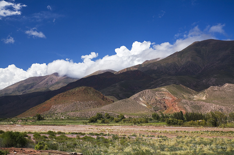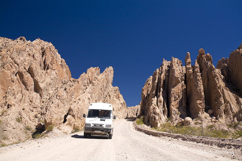 An diesem Morgen erwartete uns ein atemberaubender Pass mit Kakteenwäldern, einer genialen Landschaft und einem Mix aus Sonne und Wolken. Nach 57 km erreichten wir nach einer Fahrt durch tiefe Wolken die Passhöhe auf 3348 m und die kleine Kapelle Piedra de Molino, vor der ein alter Mühlstein lag. Hier waren die Wolken nicht so dicht und es ließ sich sogar die Sonne blicken. Hinter uns lag eine mondähnliche Hochebene und vor uns konnte man durch die Wolken schon ein wenig von der spektakulären Talfahrt erahnen. In schmalen Serpentinen ging es hinab und immer wieder mussten wir anhalten und die Eindrücke dieser saftig grünen Wiesen, rauen Berge und tiefen Wolken in uns aufsaugen. Es war einfach genial! Die Straße führte uns durch eine Schlucht am Fluss entlang, dort weideten friedlich Kühe und Schafe und auch einzelne Bauernhöfe konnten wir immer wieder entdecken. Viel zu schnell endete dieser tolle Weg und wir waren in Salta. Die Straßenbeschilderung war zu unserem Erstaunen zuerst sehr gut und endete dann plötzlich. Dank GPS fanden wir aber den Weg in Richtung Jujuly. Wir waren uns zuerst nicht ganz sicher, ob wir richtig waren, denn die Straße war zwar geteert, aber sehr schmal. Aber unser GPS beharrte auf der Richtigkeit der Strecke. ![]() Wieder ging es über einen Pass mit sehr engen Haarnadelkurven durch dichten Regenwald und tief liegende Wolken. Irgendwann lichtete sich der Wald und wir kamen in ein Tal nach Jujuy und durchfuhren die von der Unesco zum Weltkulturerbe erklärte Schlucht Quebrada de Humahuaca. Es scheint fast so, als ob ein Maler seine Farben über die kahlen Felswände gekippt hätte. Kleine Dörfer zieren das Tal und laden zum Erkunden ein. Das größte Dorf ist Humahuaca. Es liegt 130 km nördlich von Jujuy. Bis dorthin führte uns unser Weg an diesem Nachmittag. Leider zog es mal wieder zu und dicke Wolken verfinsterten das Tal. Zum Glück konnten wir noch die vielfarbigen Felsen bei Sonnenschein bewundern, aber leider reichte es nicht mehr für den Cerro de los Siete Colores (Berg der sieben Farben). Interessant sah er trotzdem aus und wir erkundeten das Dorf Purmamarca, das zu seinen Füßen liegt. Dort war gerade ein Handarbeitsmarkt und man konnte die Lama- und Alpakasachen, die die Einwohner hergestellt hatten, kaufen bzw. deren Farbenpracht bewundern. Zum Übernachten fanden wir leider keinen geeigneten Campingplatz und so fuhren wir zurück in Richtung Jujuy bis nach Yala, denn dort hatten wir eine Campsite gesehen. Immer wieder regnete es leicht, bis wir in Yala ankamen. Die Campsite war gut angelegt und warmes Wasser für die Duschen gab es ab 19.30 Uhr. Ausserdem gab es Grillstellen, Strom und Sitzgelegenheiten, auch ein Schwimmbad konnte benutzt werden. Aber da es ja sowieso regnete, war es für uns wieder uninteressant. Kurz nachdem wir unser Auto abgestellt hatten, schaute Chris mal nach dem Kühler, der uns schon vor ein paar Tagen etwas Sorgen gemacht hatte, denn wir mussten fast 4 l Wasser nachfüllen. Wir bemerkten, dass die Werkstatt in Punta Arenas den Wasserwarnanzeiger nur mit einem Streichholz lahm gelegt hatte und wir dachten bis dato, er wäre repariert. Chris schaute also vor zum Kühler und sah, wie das Wasser nur so herauslief. Er stellte einen Plastikkanister unter das Auto, um zu schauen, wie viel der Kühler an Wasser verlor und bekam bei der Menge gleich Magenschmerzen, so dass ihm unser leckeres Grillfleisch gar nicht mehr richtig munden wollte. Wir überlegten lange, ob wir weiter fahren oder eine Werkstatt aufsuchen sollten und machten diese Entscheidung von dem Kühlwasser abhängig, dass wir bis zum Morgen auffangen würden. So gingen wir an diesem Abend sehr unruhig ins Bett. Tageskilometer: Chachi - Yala 505 km Übernachtung El Refugio Yala: 15 Peso p. Platz - Argentinien |