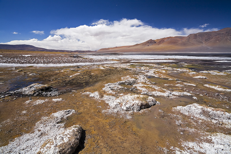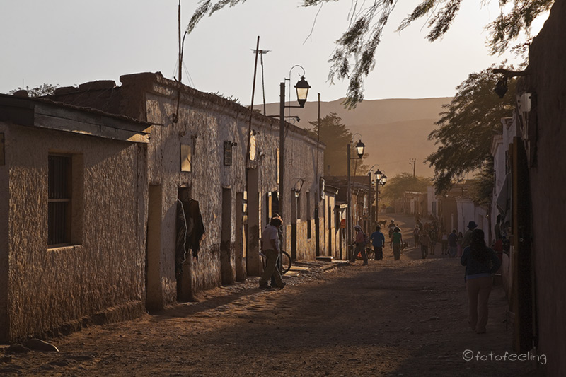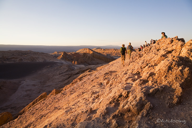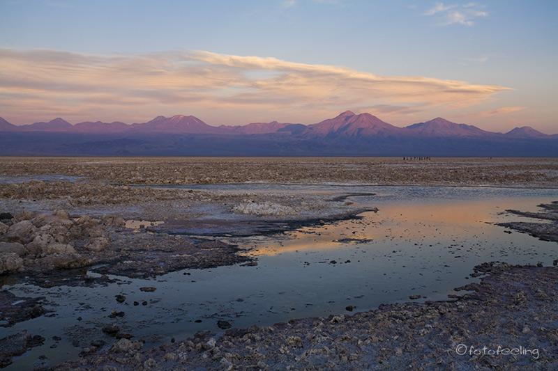 Immer wieder hörten wir schon während der Nacht den Regen auf unser Auto prasseln, aber pünktlich zur Abfahrt hörte es dann auf und war nur noch sehr zugezogen. Wir standen müde auf und schauten besorgt unter unser Auto. Zu unserer Erleichterung hatte es kein Kühlwasser mehr verloren und wir entschieden uns, erst einmal weiter zu fahren. Wir tankten in der Ortschaft Volkan an einer Tankstelle, die nur mit viel Phantasie als solche zu erkennen war. Dort gab es auch Kühlflüssigkeit, die wir uns gleich kauften. Danach machten wir uns auf den Weg zum Paso de Jama, von dem wir schon viel Positives gehört hatten. Erst einmal fuhren wir durch Purmamarca und bestaunten noch einmal den vielfarbigen Berg, leider auch wieder ohne Licht. Dann ging es in Serpentinen immer höher hinauf in die Berge. Es sah toll aus, wie wir uns den Wolken immer weiter näherten und sie schließlich durchbrachen. In der Höhe schien die Sonne und im Tal lag dichter Nebel. Immer wieder mussten wir anhalten und einige Bilder machen. Irgendwann kamen wir auf eine Hochebene und erreichten schließlich die Passhöhe von 4170 m - unser neuester Höhenrekord in einer kargen felsigen Landschaft. Etwas luftarm war es schon dort oben, aber wir hatten keine Probleme damit. Die ganze Zeit tranken wir sehr viel und wollten so dem Kopfweh und der Höhenkrankheit vorbeugen. Gut gelaunt setzten wir unsere Fahrt im schönsten Sonnenschein fort und erreichten bald darauf den Salzsee Salinas Grande. Schon in der Ferne schimmerte er uns strahlend weiß entgegen, aber aus der Nähe beeindruckte er uns noch mehr. Dieses leuchtende Weiß vor dem intensiven Blau des Himmels und im Hintergrund schimmerten die Berge mit ihren schneebedeckten Spitzen. Die Straße führte mitten durch den Salzsee und immer wieder hielten wir begeistert an und genossen diese unwirkliche Szenerie. An einer Salzgewinnungsstätte direkt an der Straße ging ein Weg richtig auf den Salzsee, den mussten wir natürlich gleich ausprobieren und fuhren ein ganzes Stück mit unserem „Bully“ mitten in den Salzsee hinein. Hier kam man sich noch mehr wie in einer anderen Welt vor, die Salzkristalle glitzerten im Sonnenlicht wie Schnee. Es war einfach traumhaft. An einer Salzgewinnungsstätte mit vielen kleinen Salzbergen und rechteckigen wassergefluteten Aushöhlungen wendeten wir unser Auto wieder und setzten unseren Weg über die Hochebene fort. Wir kamen noch an einem kleineren Salzsee Salar de Quiaroz vorbei und sahen unterwegs etliche Vikunjas und Lamas. Viele Kilometer später erreichten wir um 14.00 Uhr die argentinische Grenzstation und gingen zur Passkontrolle. Dort stellte die Dame von der Passkontrolle fest, dass wir zwar zwei Ausreisestempel von Argentinien hatten, jedoch keinen Einreisestempel. Na prima, der Zöllner in Patagonien hatte uns den falschen Stempel verpasst und wir hatten leider nicht kontrolliert, da man sich immer auf die Behörden verlässt. Jetzt hatten wir ein Problem. Sie lief erst einmal mit den Pässen weg und wieder konnten wir uns nur stümperhaft verständigen. Ein anderer Zöllner, der zum Glück englisch sprach, nahm die Sache in die Hand und nach einigem Hin und Her wurde uns eine Rechnung mit Quittung vorgelegt. Der Spaß kostete 50 Peso p. Person (17 US$) und eine halbe Stunde Zeit. Ich war ziemlich sauer auf uns, weil wir nicht kontrolliert hatten und auf den dämlichen Zöllner, der uns das eingebrockt hatte. Aber es half ja nichts. Nachdem wir bezahlt hatten, ging alles sehr schnell und bald saßen wir im Auto und standen kurz darauf auf der Passhöhe des Jama-Passes auf 4200 m. Danach ging es immer weiter langsam bergauf und wir dachten schon bei 4170 m am höchsten Punkt gewesen zu sein. Trotz des vielen Trinkens bekamen wir Kopfweh und nahmen beide ASS Tabletten ein. Ich hatte das Gefühl, das sich ein eiserner Ring um meinen Brustkorb gelegt hatte, dadurch fiel das Atmen richtig schwer und alles ging etwas langsamer. Die Landschaft war jedoch so unglaublich schön, dass wir es beide trotzdem genossen. Auf einer Höhe von über 4800 m lag der Salar Aguas Caliente, der vielfarbig in der Sonne schimmerte. Auch einige Flamingos konnten wir in der Ferne beobachten. Sehr gut gefielen uns auch die Moais de Tara, bis zu 30 m hohe vom Wind verwitterte Felsen, die nach den Moais der Osterinseln benannt wurden. Sie lagen etwas abseits der Straße und etliche Reifenspuren führten zu ihnen hin. Ein kleines Stück fuhren wir mit unserem „Bully“, den Rest des Weges gingen wir zu Fuß, da Chris Angst hatte, unser Auto festzufahren. Immer noch ging es bergauf, den höchsten Punkt erreichten wir bei 4850 m Höhe. Chris überlegte noch, ob er nicht „schnell“ einen Berg erklimmen sollte, damit er die 5000 m schaffte, aber zum Glück machte er nur Spaß. Kurz vor 18 Uhr kamen wir endlich bei der chilenischen Grenze in San Pedro de Atacama an. Dort wurden wir wirklich gut durch eine Zöllnerin kontrolliert, aber das wussten wir zum Glück vorher schon und hatten alles verstaut. ;-) Bald darauf konnten wir weiter fahren. Da es zeitlich recht gut passte, überlegten wir uns, noch ins Valle de la Luna zu fahren. Aber das war erst einmal ein Problem, denn wir fanden mal wieder dank der tollen Ausschilderung nicht den richtigen Weg und irrten durch das Einbahnwegenetz des Ortes. Irgendwie mit viel Geduld und Fragen waren wir dann endlich auf dem richtigen Weg nach Calama und brausten 12 km westlich ins bekannte Valle da la Luna. Hier gestaltete die Natur in Jahrmillionen eine bizarre Felslandschaft, formte die unterschiedlichsten Gebilde aus Sand, Lehm, Salz und dazu gesellten sich hohe Sanddünen. Wir schauten uns einige Felsformationen an und fuhren dann zielstrebig zur höchsten Düne. Jeden Abend wird sie von vielen Touristen erklommen, die dort den Sonnenuntergang genießen und den Blick über die bizarre Landschaft schweifen lassen. Es war irgendwie vertraut, den Dünensand unter den Füßen zu spüren, aber leider auch genauso