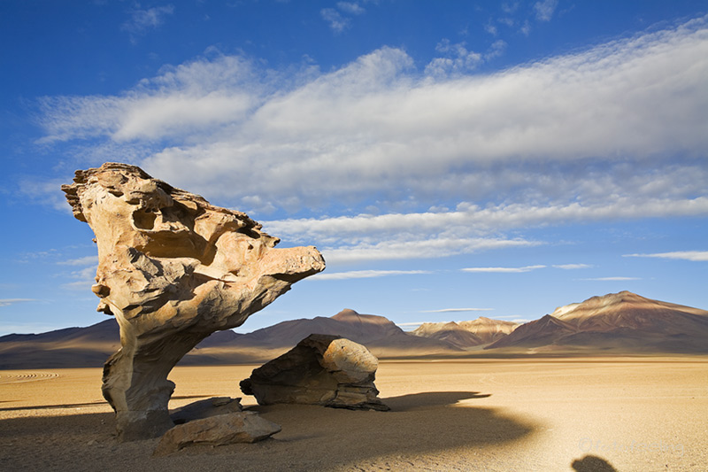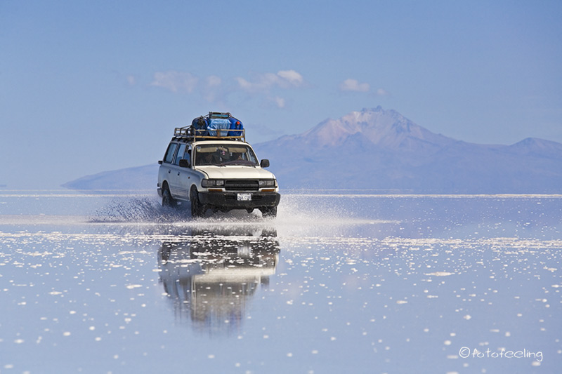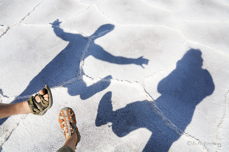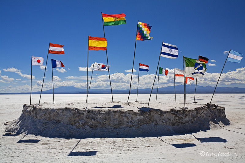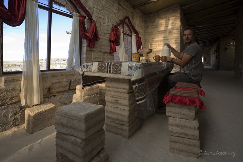 Im Dunkeln (6.00 Uhr) starteten wir und kamen pünktlich zum ersten Licht am „Pilzfelsen“ an. Er lag noch im Schatten, aber der Hintergrund war schon beleuchtet. Es ist immer wieder faszinierend, wie auf einmal mitten im Nichts tolle Felsen oder Lagunen auftauchen und man sich wie in einer anderen Welt vorkommt. Sehr gefiel uns auch der Cerro de siete Colores = Berg der sieben Farben. Obwohl ja fast alle Berge auf diesem Hochplateau vielfarbig sind. Dann kamen wir wieder zu verschiedenen Lagunen. Die erste war Laguna Onda, die leider im Gegenlicht lag. Kurz hielten wir noch an einer anderen Lagune für ein paar Bilder und fuhren dann zur Laguna Hedionda. Dort waren viele Flamingos zu beobachten und eine sehr schöne Kulisse von Lagune und Bergen. Immer wieder sahen wir zwischendurch Vikunjas in den Ebenen grasen. An der Laguna Chiarkota hatten wir sie direkt am Wasser mit Bergen im Hintergrund. Das war wirklich eine tolle Kulisse für diese fetzigen Tiere. Der nächste Stopp war am Vulkan Ollague, der sehr aktiv ist, was man an einer Fumarole sehen konnte. Dort war es landschaftlich auch wieder besonders toll, aber unser Fahrer hielt nur an der Straße. Von dort hatte man zwar den besten Blick, aber weiter unten waren geniale Felsen, doch da standen schon einige Autos und viele Leute, die dort Pause machten. So gaben wir uns zufrieden und fuhren bald wieder weiter. Wir kamen über einen kleinen Salzsee mit tiefen Fahrspuren und näherten uns langsam aber sicher unserem Ziel. Nur hatten wir noch kein Mittagessen und das Frühstück war schon lange weg. Endlich gegen 15.00 Uhr waren wir in einem kleinen Dorf und unser Fahrer hielt an einem Laden an. Wir wunderten uns, was das sollte, aber als dann endlich die Besitzerin auftauchte, sagte er uns, dass es hier Mittagessen gäbe. In Bolivien wird immer nur sozusagen eine Küche gemietet und die Köchin bereitet dort die Speisen zu. Es gab einen leckeren Kartoffelsalat und wieder Tomaten und Gurken dazu. Nach dem Essen ging es weiter, vorbei an netten Ortschaften bis zum Rande des Salzsees Uyuni. Um ca. 17.00 Uhr erreichten wir unser Salzhotel „Atulcha“, das uns anfangs von aussen sehr enttäuschte. Wir hatten noch Bilder im Kopf von einem Hotel mitten auf dem Salzsee, das sich hervorragend für den Sonnenuntergang geeignet hätte. Dieses hier lag am Ortsrand und bis zum Salzsee waren es 2 - 3 Kilometer. Innen war es wirklich super. Alles war aus großen Salzblöcken, selbst die Betten und Nachtkästen. Die Zimmer waren zwar klein, aber sehr nett und es gab endlich eine heisse Dusche. Das nutzte ich auch gleich aus und fühlte mich danach wie ein neuer Mensch. Später fuhr uns unser Fahrer auf den Salzsee, wo wir einen sehr schönen farbenfrohen Sonnenuntergang erlebten. Es ging zwar ein kalter, heftiger Wind, aber wir waren zum Glück warm angezogen und konnten das Farbenspiel genießen. Zurück im Hotel trafen wir Norbert und Heidi und hatten zusammen mit ihnen und dem Rest ihrer Reisegruppe einen sehr netten Abend. Wir sicherten im Speisesaal unsere Bilder und dabei ging auf dem Laptop unser Bildschirmschoner „Afrika“ los. Wir merkten es erst gar nicht, aber es wurde langsam immer stiller und auf einmal standen mehrere Fahrer und auch ein paar Touristen um den Laptop herum und schauten mitten in Bolivien Afrikabilder an. Das war uns schon etwas peinlich, aber auch irgendwie lustig. Der Fahrer von Norbert und Heidi holte sich extra noch seine Brille und einen Stuhl und genoss die Vorführung. Tageskilometer: Laguna Colorada - Atulcha 250 km Übernachtung: Salzhotel Atulcha - Bolivien |