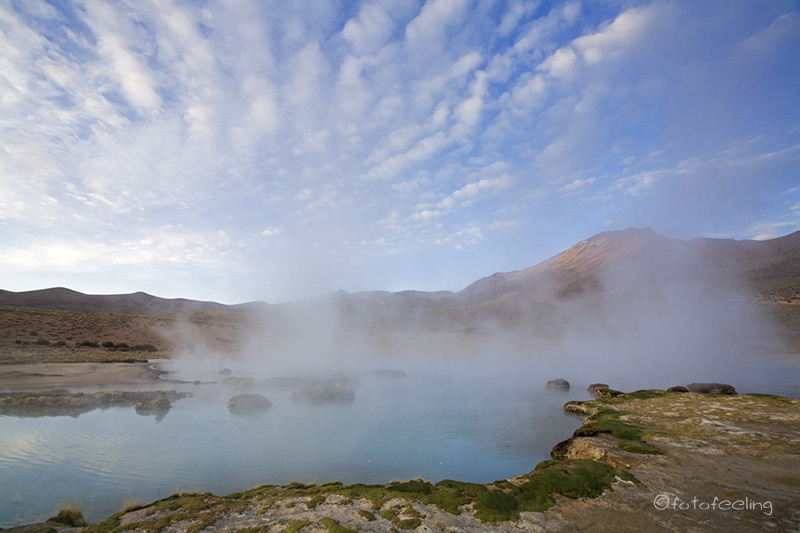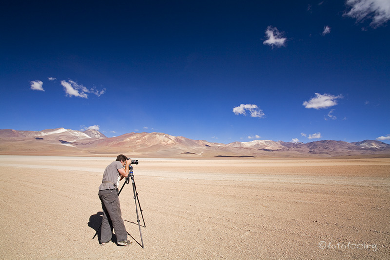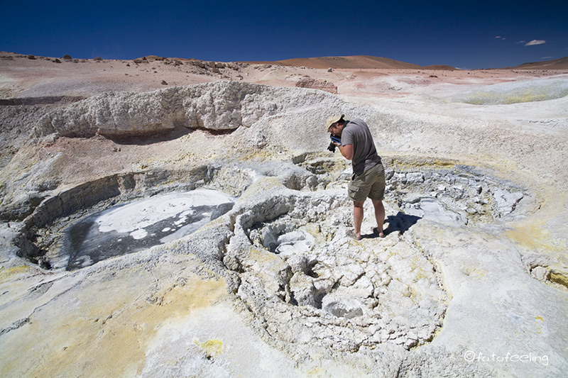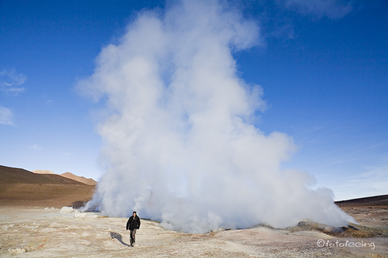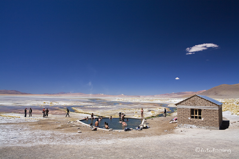 Da wir um 8.30 Uhr vom Hotel abgeholt werden sollten, standen wir eine Stunde vorher auf, frühstückten und spielten noch mit den Katzen. Dann wurde es Zeit, aber niemand kam. Wir waren eigentlich gewohnt, dass in Chile alles überpünktlich ist und wunderten uns schon etwas über die Verspätung. 20 min nach der vereinbarten Zeit ging Chris in die Stadt zur Agentur, aber dort war noch niemand. Er fand jedoch eine Telefonnummer und rief gleich an. Immer mit der Ruhe hieß es, es kommt gleich jemand. Beruhigt, dass wir nicht vergessen worden waren, spielte ich weiter mit den Katzen. Neben unserer Katzenmama mit drei fast ausgewachsenen Jungen, bekamen wir noch eine bildhübsche scheue dreifarbige Katze und zwei Babys zu sehen, die sich leider nicht anfassen ließen. Wir verfütterten die restlichen Lebensmittel, denn für die nächsten drei Tage würden wir nichts mehr brauchen. Chris wunderte sich immer noch über die Unpünktlichkeit und erinnerte sich, dass ich mal was von Zeitumstellung im März erzählt hätte. So schaute er zuerst in die Rezeption und fragte dann noch einen Hotelgast. Es stellte sich heraus, dass die Zeitumstellung natürlich schon stattgefunden hatte und wir eine Stunde zu früh auf den Fahrer gewartet hatten. Peinlich! Aber da wir bis dato nur nach der Sonne gelebt hatten, fiel uns das gar nicht auf. Wir hätten zwar an der Tankstelle schon stutzig werden müssen, aber dachten uns einfach nichts dabei. So wurden wir dann pünktlich 8.30 Uhr abgeholt und starteten bald darauf zur bolivianischen Grenze. Es ging wieder 40 Kilometer steil bergauf bis auf über 4500 m in Richtung Jama-Pass und dann noch ein paar Kilometer Piste bis zur bolivianischen Grenze. Sie bestand aus zwei Häusern und vielen Jeeps, die schon auf die neuen Reisenden warteten. An der Grenze gab es noch schnell einen Stempel in den Pass und ein leckeres Frühstück, dann ging es los. Neben unserem Fahrer Edson, saß vorne eine Frau (Köchin) mit Baby und am Nationalparkeingang in Bolivien stieg noch ein Junge dazu. Keiner sprach auch nur ein Wort englisch und wir hatten das kleine Wörterbuch nicht mitgenommen. So war eine Verständigung fast unmöglich. Zuerst fuhren wir zur Laguna Blanca. Sehr schön schimmerte das helle Wasser im Licht. Gleich daneben befand sich die Laguna Verde, deren Wasser türkis in der Sonne leuchtete. Die Farbe kommt durch den hohen Magnesiumgehalt und gleicht einem Smaragd. Je nach Uhrzeit schimmert die Lagune in den verschiedensten Türkistönen. Leider war es Mittagszeit und die Kontraste schon sehr hart. Danach fuhr unser Fahrer zu den Dali-Felsen, die wir jedoch nur aus der Ferne bestaunten. Sie sahen aus wie kleine Steinkunstwerke, die ein Riese im Spiel dorthin geworfen hatte. Die Bergkulisse war wunderschön und vielfarbig. Am See Aguas Termales machten wir Mittagspause und Chris nutzte die Zeit für ein Bad im gemauerten Thermalbecken. Ich hatte mein Badezeug leider in der Alubox, die verschlossen auf dem Rücksitz des Autos stand und wusste auch nicht, wann das Essen soweit war. So begnügte ich mich damit, meine Füße ins Wasser zu halten und Bilder zu machen. Nach und nach kamen immer mehr Jeeps und das Becken füllte sich mit Leuten. Auf einmal hörten wir bekannte Stimmen und Norbert und Heidi kamen um die Ecke. Wir freuten uns riesig, wieder deutsch sprechen zu können und quatschten bis zum Mittagessen. In der Höhe konnte ich fast nichts runter bringen, aber sonst ging es mir super. Chris hatte auch mit dem Essen keine Probleme und mampfte fast alles auf. Nach dem Mittag ging es weiter durch eine einmalig schöne karge Landschaft mit Vulkanen und Bergen bis zu den Geysiren „Sol de Mañana“ = Morgensonne. Dort ließ uns unser Fahrer beim ersten Geysirfeld hinaus und fuhr zu dem zweiten Feld vor. Wir hatten die wunderschöne Landschaft ganz für uns alleine und genossen es in vollen Zügen. Überall brodelte es leicht und leuchtete in den verschiedensten Farben, so dass wir uns kaum satt sehen konnten. Einige Fumarolen schleuderten sogar noch nachmittags Wasserdampf in die Höhe und auch heisser Schlamm wurde an anderen Stellen immer wieder hoch gespuckt. Das bekam Chris auch zu spüren. Als er sich zu weit vorbeugte, hatte er überall helle Schlammspritzer abbekommen und durfte die Linse putzen. ![]() Dann kam noch ein Jeep und wieder begegneten wir Norbert und Heidi nebst sehr netten jungen Mitreisenden. Nur sehr schwer konnten wir uns von diesen Naturschauspiel losreißen, aber wir mussten weiter. Es ging über einen üblen steinigen Pass, den man ohne Allrad nur sehr schwer schaffen kann. Spätestens dort hätte unser „Bully“ aufgegeben und wir waren über den alten Landcruiser froh. An diesem Tag waren wir auf 4935 m und hatten mal wieder unseren Höhenrekord eingestellt. Am Nachmittag kamen wir bei der Laguna Colorada an. Zuerst fuhren wir in die Herberge und übernahmen unser Zimmer. Wir hatten uns schon auf die anderen gefreut, aber bei uns waren nur Fremde und auch später konnten wir niemanden entdecken, den wir kannten. Wir bekamen ein kleines Zimmer für uns alleine. Unser Fahrer wollte erst einmal ein paar Stunden Pause machen, aber Chris sah das etwas anders und so waren wir nach 30 min wieder unterwegs zur Lagune. Leider sagte uns unser Fahrer nichts und ließ uns an der Laguna Negra hinaus. Dort waren zahlreiche Flamingos mit Jungvögeln. Wir fotografierten fleissig und merkten kaum, wie die Zeit verging. Erst als Chris zu einem anderen Jeep deutete, fuhr uns unser Fahrer dorthin und da war dann die eigentliche Laguna Colorada. Für ein paar Bilder reichte das Licht gerade noch, bis es hinter den Felsen verschwunden war, aber leider war die Zeit dort viel zu kurz. Wieder bereuten wir unsere schlechten Spanischkenntnisse, aber ärgerten uns auch über die Muffligkeit des Fahrers, denn mit etwas gutem Willen hätte er uns durchaus informieren können. Geschafft kamen wir in der Unterkunft an und sollten erst einmal einen Matetee beko
