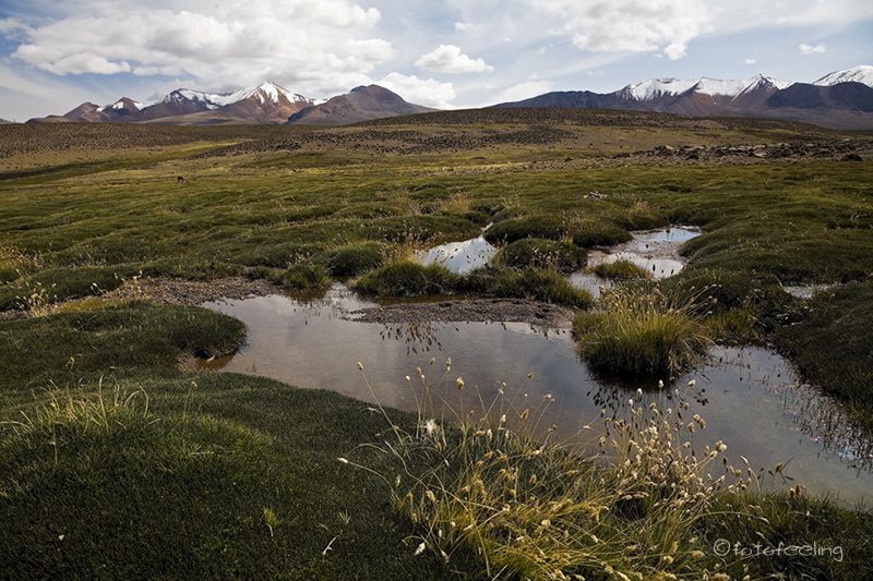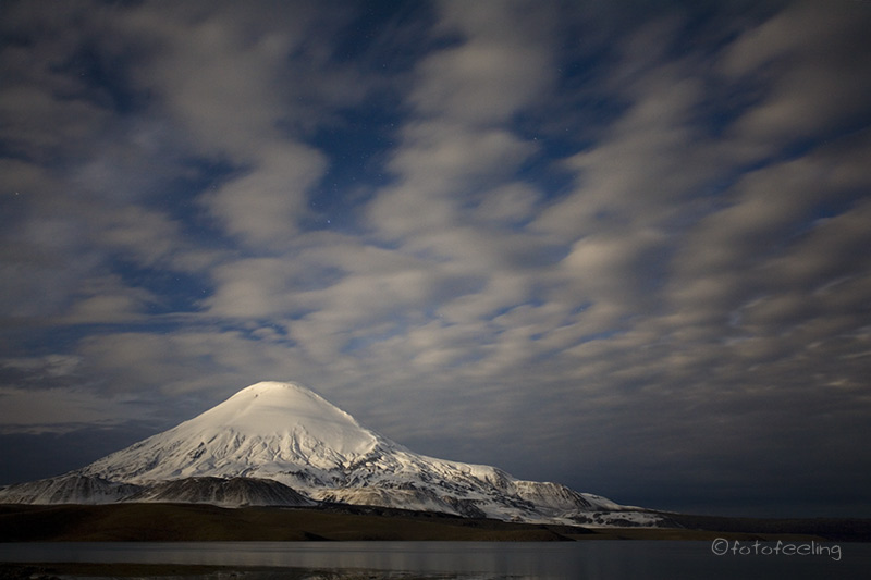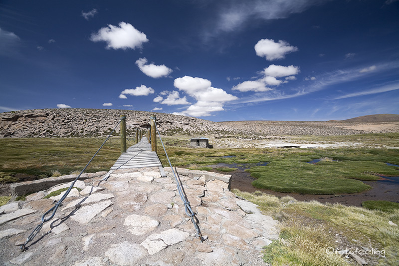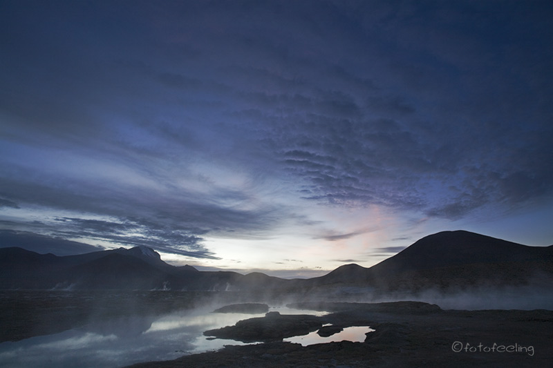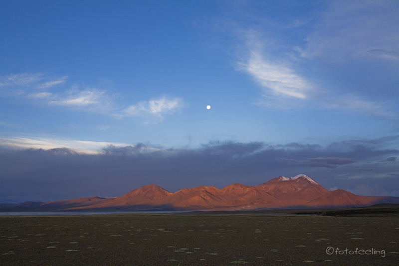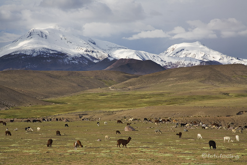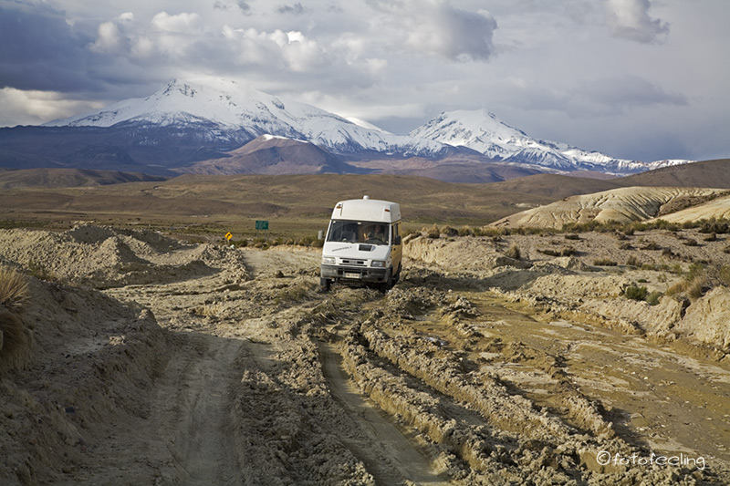 Sehr früh (3.45 Uhr) weckte Chris mich, er war sehr unruhig, hatte noch mit Bauchkrämpfen zu tun, und wollte unbedingt losfahren. So verbrachten wir den Weg bis Arica fast vollständig im Dunkeln und kamen so gegen 8.30 Uhr dort an. An einer Tankstelle holte Chris uns erst mal einen Kaffee und telefonierte dann mit Charly wegen unserem Zulassungspapier. Leider war das Papier trotz Express nicht angekommen und sollte evt. an diesem Samstag in der Post sein. Wir sollten erst einmal bis ca. 12.00 Uhr warten. So besichtigten wir Aricas Catedral de San Marcos, eine Fertigbau-Eisenkonstruktion von Gustave Eiffel und einen schönen mit Palmen bewachsenen Platz. Danach fuhren wir noch hinauf zum Morro und genossen von oben den Blick über den Hafen und die Stadt. Etwas später machten wir am Strand Playa Chinchorro, der zwei km nördlich des Zentrums liegt, eine lange Strandwanderung im herrlichsten Sonnenschein. Chris rief um ca. 10.30 Uhr wieder bei Charly und Sebastian an. Das Papier war immer noch nicht aufgetaucht und wir hätten es dringend am 01.04. gebraucht. Da das Warten keinen Sinn mehr machte, beschlossen wir auf gut Glück in den Lauca-Nationalpark zu fahren, denn es war Wochenende und nun würde sicher kein Papier mehr auftauchen. Aber erst einmal mussten wir einkaufen. Irgendwie waren wir nicht gut drauf und fanden keinen Supermarkt. Zum Glück landeten wir an einem kleinen Markt, wo es viele Mini-Metzger, Gemüseläden und auch einen Bäcker gab. So hatten wir bald alles Wichtige für unseren Ausflug gekauft und fuhren los. Es ging durch das Tal des Rio Lluta vorbei an zahlreichen Geoglyphen = Erdzeichnungen von Menschen und Lamas, die man an den südlichen Bergen entdecken konnte. Sehr schnell gewannen wir an Höhe und kamen in engen Serpentinen immer weiter in die Berge hinauf. Auf dieser Strecke fuhren sehr viele bolivianische Lastwagen, denn in Arica haben die Bolivianer einen eigenen Hafenzugang. Dementsprechend viele, meistens mit Autos beladene LKWs mussten wir auf der Strecke überholen, was nicht ganz ungefährlich war. In Putre, das auf 3650 m Höhe liegt, tankten wir vorsichtshalber noch einmal nach und ratschten etwas mit dem Tankwart, der recht gut englisch konnte. Witzig ist dort beim Tanken, dass man schon vorher wissen muss, wie viel Benzin man benötigt, denn es werden nur volle 10 l-Einheiten verkauft und die dann mit einem Kanister und einem Trichter (natürlich selbstgebastelt) in das Auto gefüllt. Danach ging die Strecke weiter steil bergauf und so erreichten wir nach ca. 22 km die CONAF-Station Las Cuevas im Lauca-Nationalpark. Dort wollten wir eigentlich nach dem Weg und den Straßenverhältnissen in Richtung Salar de Surire fragen, aber leider war niemand da und so beschlossen wir, weiter zu fahren. Das Wetter sah leider in dieser Höhe nicht so gut aus und dicke Regenwolken machten uns etwas Sorgen. Die Vulkane Pomerape (6250) und Parinacota (6330) waren aber fast frei und boten einen spektakulären Anblick, so dass wir erst einmal an der Abzweigung zum Salar de Surire vorbeifuhren und an einer freien Stelle den Blick auf die beiden Vulkane in uns aufsogen. Leider saß uns die Zeit im Nacken und schon bald mussten wir umkehren und uns auf den Weg zum Salar machen. Wir verließen die gute Teerstraße und befanden uns auf einer gut ausgebauten Piste. Da am Salar de Surire Borax abgebaut wird, fahren diese Strecke auch LKWs und dementsprechend gepflegt ist sie. Die Landschaft war einfach atemberaubend. Immer wieder hatten wir Sicht auf den Parinacota und andere tolle Berge und Vulkane. Sie waren von Regenwolken umgeben und wurden von der Sonne angestrahlt. Davor entdeckten wir Herden von wilden Vikunjas und Lamas, unter denen wir auch ein paar Alpakas entdeckten. Die Lamas werden von den Indianern als Nutztiere gehalten und dienen der Wollgewinnung. Ohne es zu merken, wechselten wir die Nationalparks und befanden uns nach ca. 25 km auf der Piste im Nationalpark Las Vicuñas, der Anfang der 70er Jahre zum Schutz der Vikunjas eingerichtet wurde, die bis dahin fast ausgerottet waren. Heute leben in den Gebieten der Nationalparks wieder über 17000 Tiere, die man immer wieder zwischen den Lamaherden beobachten kann. Die Piste war stellenweise durch den vielen Regen sehr schlecht, aber zum Glück waren die schlimmsten Löcher schon mit Zweigen gefüllt und im tiefen Schlamm feste Fahrspuren angelegt, so dass wir überall gut weiter kamen. Eine Brücke war auch noch zerstört und so mussten wir durch einen relativ breiten, ca. 30-50 cm tiefen Fluss mit einer starken Strömung fahren. Aber unser „Bully“ meisterte dank Christian die Herausforderungen prima. ![]() Irgendwann kamen wir im letzten Licht am Salar de Surire an. Jetzt mussten wir nur noch einmal um den See und dann würden die Thermalquellen und unser heutiges Tagesziel vor uns liegen. Doch so weit kamen wir erst einmal gar nicht, denn über den Salzsee hatte man einen fantastischen Blick auf die umliegenden Berge. Hinzu kamen die Farben der Wolken, die von der untergehenden Sonne eingefärbt wurden. Wir wussten gar nicht, wohin wir zuerst schauen sollten. Als wir eigentlich schon weiterfahren wollten, kam die Sonne noch einmal heraus und bestrahlte die Berge in einem warmen Rot. Es war wunderschön. So kamen wir an den Quellen mal wieder erst in der Dämmerung an. Wir erkannten sie sofort am Dampf und dem Schwefelgeruch. An einer Stelle befindet sich ein Windschutz, ausgestattet mit Tisch und Bänken, dorthin stellten wir unseren „Bully“. Zum Baden ist dort auch die richtige Stelle, denn weiter vorne kann der Schlamm bis zu 50 °C heiß werden. Zuerst grillten wir jedoch im Windschutz und genossen das leckere Essen bei einem Glas Wein. Es kühlte ziemlich ab und hatte draußen nur noch 4 °C, doch der Vollmond beleuchtete das Wasser verlockend und so kamen wir auf die Idee, nach dem Essen noch baden zu gehen. Der See ist sehr schlammig und flach, doch das Bad bei Vollmond gehört für mich zu 