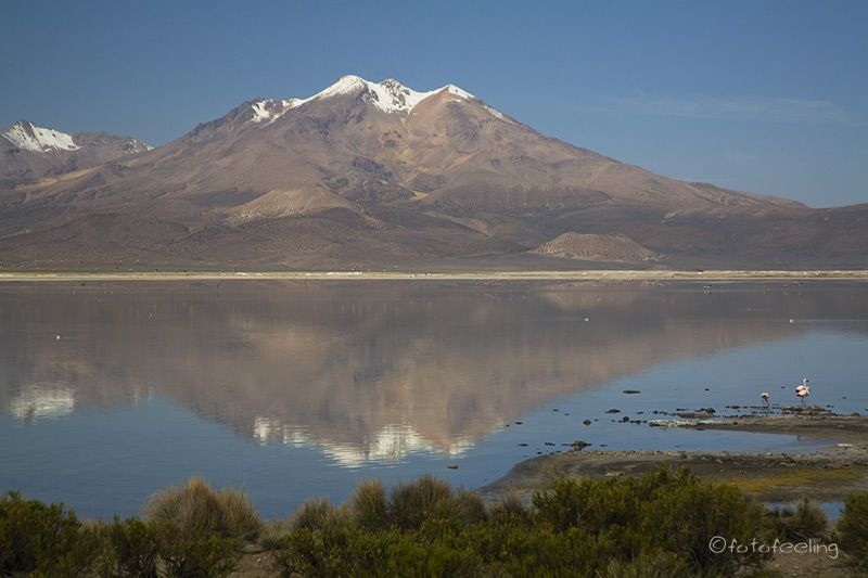 Zur Dämmerung standen wir auf und waren wieder einmal restlos begeistert, denn der See dampfte und die blaue Stunde machte ihrem Namen alle Ehre. Später, als die Sonne herauskam, konnten wir uns kaum von dem Anblick lösen und überlegten fast, ob wir noch eine Nacht dort bleiben sollten. Doch das Wetter zog immer weiter zu und wir mussten ja wieder auf der schlechten Piste zurück, die bei Regen unpassierbar für uns gewesen wäre. So beschlossen wir, zum Lauca-Nationalpark zurückzufahren. Wir waren uns sicher, dass wir an diesem traumhaften Ort sicher nicht zum letzten Mal gewesen waren. Wir wählten diesmal den nördlichen Weg um den Salar de Surire herum und konnten zahlreiche Flamingos beobachten, dazu die tollen Berge und große Lamaherden. Es war einfach nur toll. Die Straße machte zum Glück keine Probleme, nur der Fluss war durch den vielen Regen etwas voller geworden, aber es ging Gott sei dank gut. Wir waren heilfroh, trocken und mit unserem „Bully“ wieder am anderen Ufer angekommen zu sein. Ansonsten ist es schon ein erhebendes Gefühl, über 4000 m Höhe auf einer Hochebene durch die Parks zu fahren. Auf der einen Seite lagen die „kleinen“ 5000er, die nicht einmal eine Schneemütze hatten und auf der anderen die schneebedeckten 6000er Vulkane und Berge. Da wir selber schon so hoch waren, kamen sie uns alle sehr klein, aber trotzdem eindrucksvoll vor. Die Gewitterstimmung begleitete uns bis zum Lauca-Park. Diesmal waren von den Vulkanen nur die Füße zu erkennen. Der restliche Konus war in dichte graue Schneewolken eingehüllt. Es wurde immer schlimmer. Wir erkundeten zwar die Gegend noch ein wenig, aber als es dann anfing, heftig zu stürmen und sich Regen mit Graupel abwechselte, blieben wir einfach an einem Aussichtspunkt mit Blick auf die Vulkane stehen. Chris ging es an diesem Tag auch nicht gut, denn die Imodium-Tabletten wirkten nicht und er fühlte sich schlapp und schläfrig. Die Höhe tat ihm sicher auch nicht gut, aber ich konnte ihn nicht überreden, zurück nach Arica oder wenigstens Putre zu fahren. Er wollte unbedingt noch eine Nacht am Parinacota verbringen. Mittags schlief er, während ich mein spannendes Buch verschlang und dem Regen lauschte. Es hört sich zwar sehr ungemütlich an, aber dieser Tag war irgendwie entspannend für uns beide. Da das Wetter nicht besser wurde, suchten wir uns die Campsite der CONAF am Lago Chungará aus und verbrachten dort einen ruhigen regnerischen Abend auf über 4500 m Höhe. Chris saß in eine Decke eingekuschelt auf unserer Sitzecke und wir lasen beide in unseren Büchern. Ein wenig komisch war uns am Abend schon, denn die Campsite war direkt an der viel befahrenen Ruta 11 nach La Paz in Bolivien und wir waren mal wieder ganz alleine auf der Campsite. Doch als wir das Licht löschten, schliefen wir bald ein. Tageskilometer: Salar de Surire - Lago Chungara 208 km Übernachtung: Campsite der CONAF am Lago Chungará (kostenlos) - Chile |