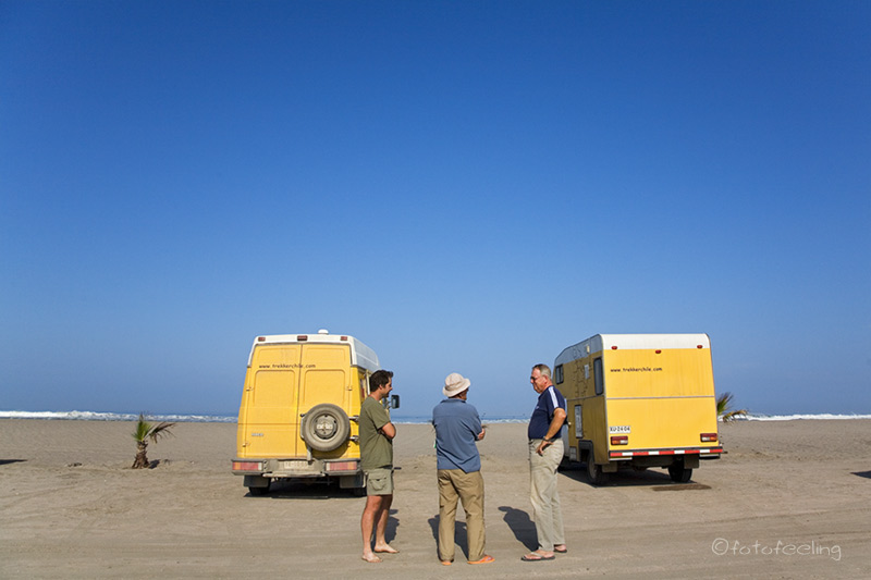 Natürlich konnten wir nicht so lange schlafen und waren schon zeitig auf den Beinen. Während wir warteten, lernten wir noch Wibke und Dieter aus Nürnberg kennen, die mit ihrem eigenen Auto durch Südamerika fuhren. Wir verquatschten noch die Zeit bis 9.00 Uhr, dann holte Chris unsere Wäsche ab und wir fuhren nach Calama. Nach einigem Suchen fanden wir die Werkstatt, aber es musste erst ein Kühlerexperte kommen, denn selber konnten sie uns dort nicht helfen. Nach einem Telefonat mit Sebastian kam der Mann und reparierte den Kühler. Leider dauerte alles länger als geplant und wir mussten auf unsere Führung in der Mine verzichten, denn noch einen Tag länger wollten wir nicht investieren. So saßen wir im „Bully“ und lasen unsere Bücher. Zwischenzeitlich mussten wir beide immer wieder die sehr sauberen Toiletten der Werkstatt aufsuchen, denn Bolivien hatte uns mit Durchfall „beglückt“ und wir waren beide etwas schwach. Da es mir noch besser ging, stopfte ich Chris mit Imodium und Kohletabletten voll, aber irgendwie half es nur bedingt. Bei mir wirkte schon Nux Vomica sehr gut. Endlich um 18.00 Uhr war alles fertig und unser „Bully“ wieder geheilt. Wir entschlossen uns, noch so weit wie möglich in Richtung Arica zu fahren und brausten auf der R5 los. Etwas wehmütig kamen wir an der riesigen Kupfermine vorbei. Dort waren die Strommasten wegen der LKWs mindestens 10 - 15 Meter hoch und man konnte sich ein wenig das Ausmaß dieser Giganten vorstellen. Je näher wir in Richtung Meer kamen, desto eintöniger wurde die Landschaft und bald ging es nur noch geradeaus. Wir kamen gut voran. Irgendwann war einmal eine Zollstation mitten auf der Straße, aber es war niemand dort und es sah auch so aus, als ob die Autos vor uns ebenfalls einfach weitergefahren wären. So machten wir uns keinen Kopf und fuhren durch. Später erfuhren wir von Sebastian, dass wir dort einen wichtigen Zettel bekommen hätten, den wir bei der Ausreise wieder hätten abgeben müssen, da wir in die erste Region eingereist waren, die zollfrei ist. Ups! Um ca. 22.00 Uhr erreichten wir eine kostenlose Campsite der CONAF und stellten uns dort hin. An dem Abend gingen wir bald ins Bett. Tageskilometer: San Pedro de Atacama - NP Pampa del Tamarugal 418 km Übernachtung auf der Campsite des NP Pampa del Tamarugal (kostenlos) - Chile |