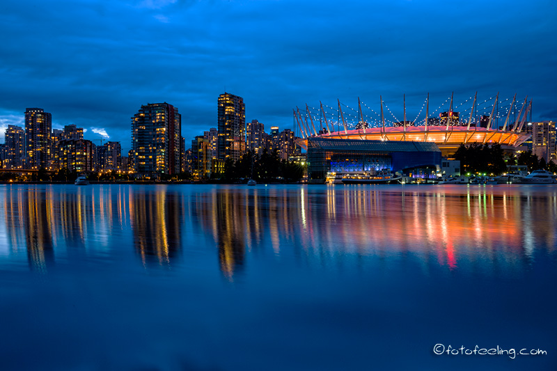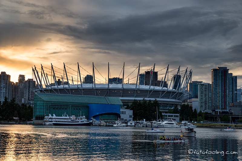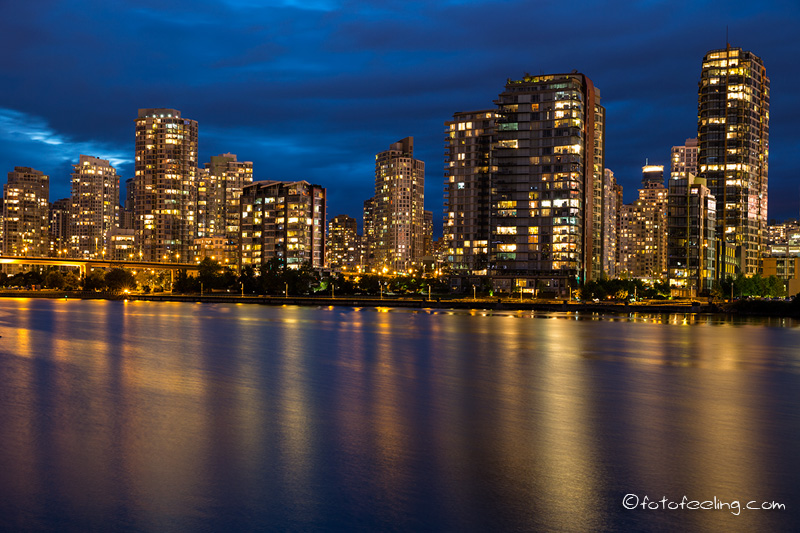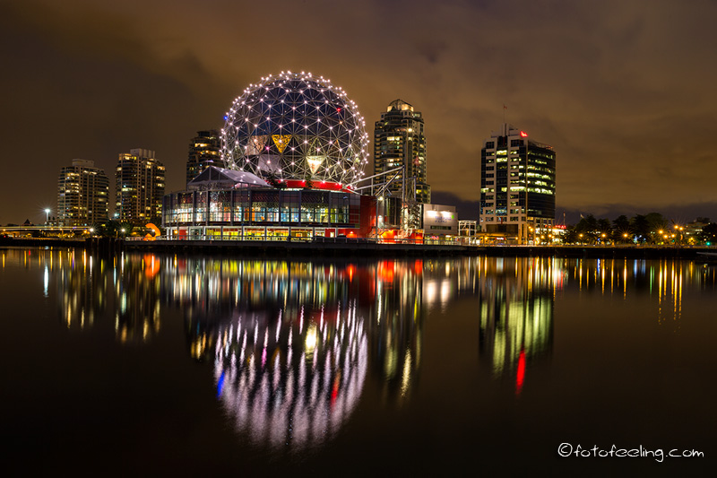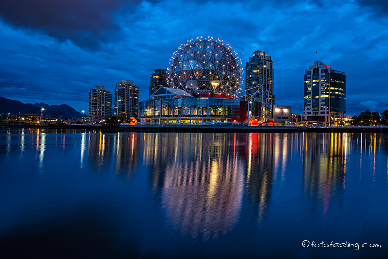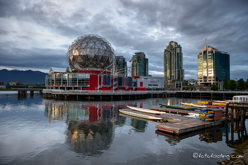 Der „Golfball“, eine 17 Stockwerke hohe Glaskuppel des Science World (TELUS World of Science Vancouver) beherbergt ein Museum und lag gleich auf unserem Weg am östlichen Ende des False Creek. Im Vordergrund lagen zahlreiche Boote der Kanuten und etliche kamen im Laufe der Dämmerung noch in den Hafen. Die Zeit verging wie im Fluge und schon bald folgte der Dämmerung die blaue Stunde. Die Hochhäuser waren toll beleuchtet und wir so fasziniert, dass wir die Zeit vergaßen. So schlenderten wir im Rausch der blauen Stunde begeistert dem Meeresarm entlang. Erst um 22 Uhr rissen wir uns von dieser herrlichen Szenerie los und fuhren zurück ins Hotel. Dann endlich um 23 Uhr lagen wir in unseren Betten und schliefen sofort ein.