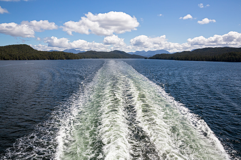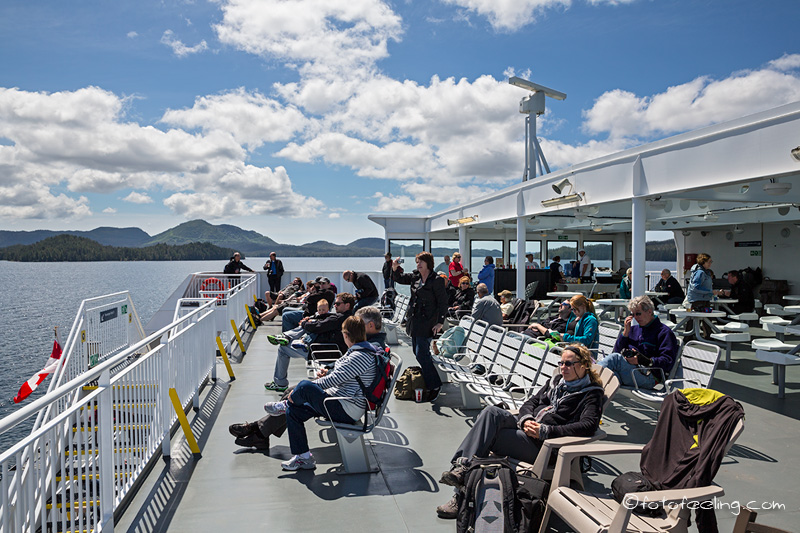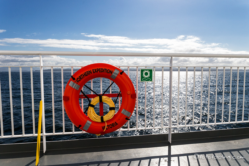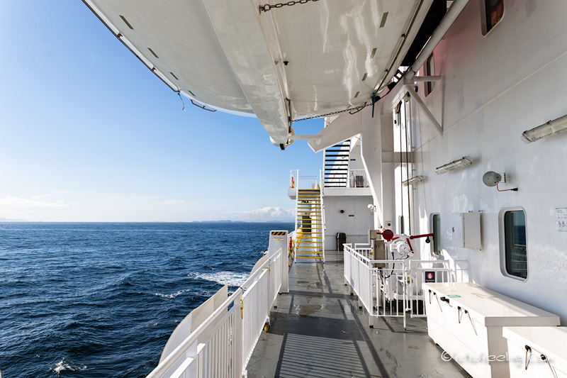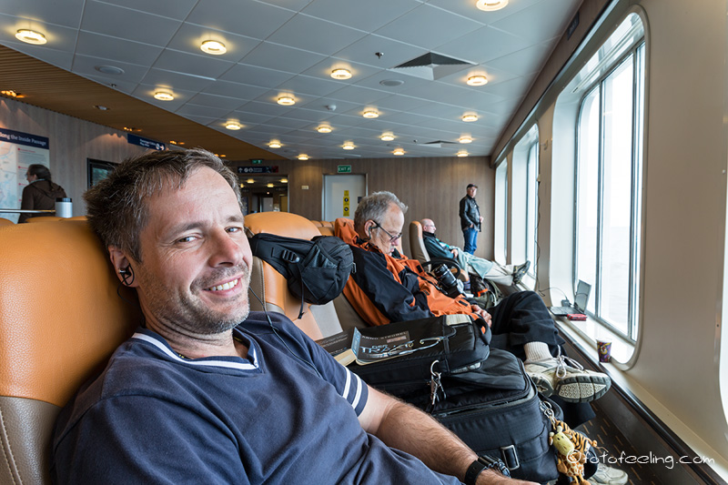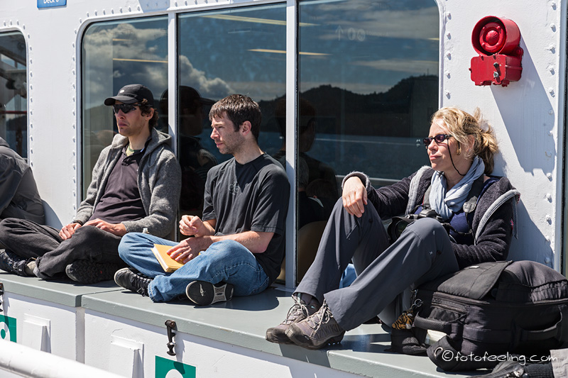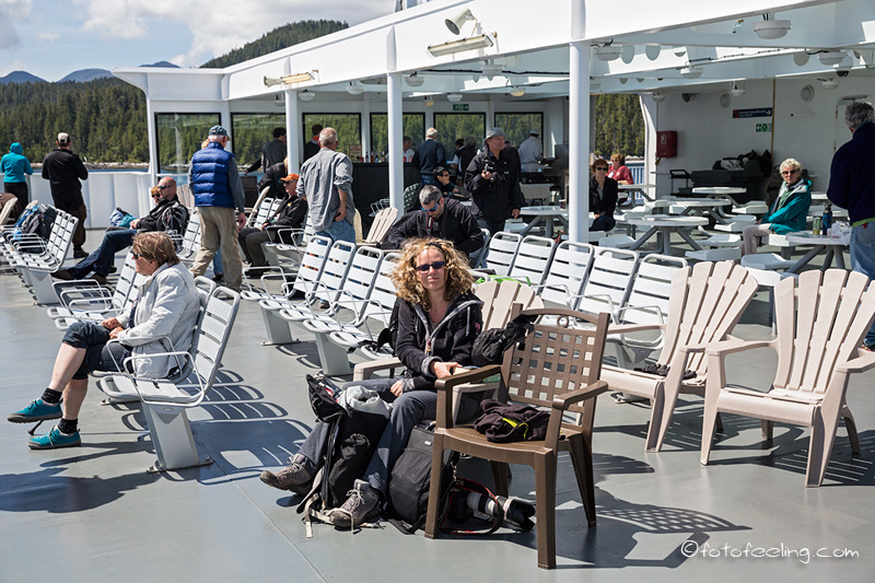 Chris erkundete sogleich die Fähre und kannte sich schon nach kurzer Zeit blendend aus. Vorerst belegten wir Plätze mit Seitenblick aus dem Schiff, nahe der Aurora Lounge. Sie bot als einzige Möglichkeit den Passagieren den ungehinderten Blick nach vorne, kostete aber einen Aufpreis von 35$, den uns die Aussicht nicht wert war. Wir wollten lieber flexibel sein und uns frei auf dem Schiff bewegen.