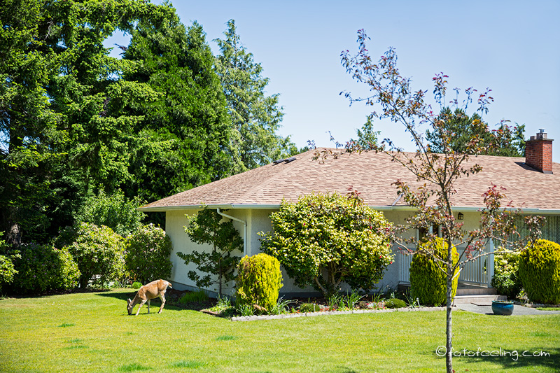 Wir verbrachten die gesamte Überfahrt draußen an Deck. Um 12.45 Uhr legten wir in Swartz Bay an und verließen mit etlichen anderen Autos den Rumpf der Fähre. Wir wählten jedoch nicht den direkten Weg nach Victoria, sondern wollten die Straße am Meer entlang fahren. Nun ja, vom Meer sahen wir nicht viel, denn es war ziemlich alles zugebaut, dafür bewunderten wir einige tolle Villen und auch hier sahen wir wieder ein Reh in einem Vorgarten grasen. Überall blühte der Ginster im schönsten Gelb und das Grün der Wälder war einfach nur herrlich. Wir erfreuten uns am Sonnenschein und kamen gut gelaunt in Victoria, der Hauptstadt der kanadischen Provinz British Columbia an.