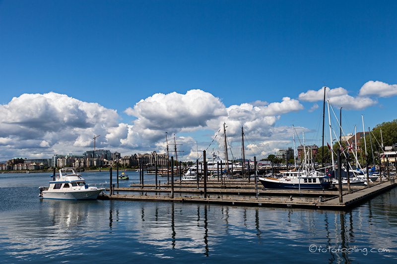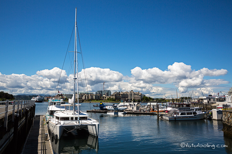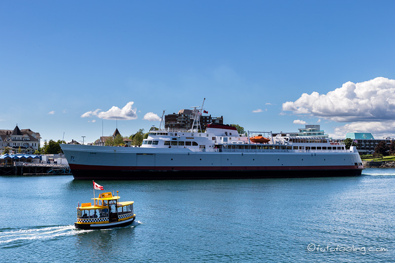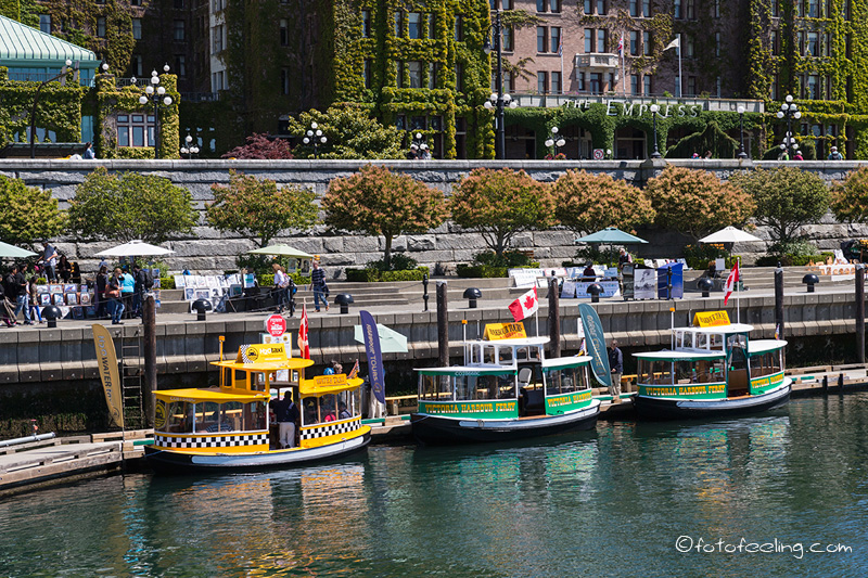 Wir stellten unser Auto am Hafen ab und bekamen von einem netten Kanadier gleich mal eine Parkmarke geschenkt, so dass wir umsonst auf dem kostenpflichtigen Parkplatz stehen konnten. Schnell noch alles Wichtige mitgenommen und schon ging es los, die Stadt zu besichtigen. Zuerst schlenderten wir am Hafen entlang. Die Sonne lachte weiterhin vom Himmel und es war richtig warm. Am liebsten hätten wir unsere Füße ins Wasser baumeln lassen. Kleine gelbe Wassertaxis fuhren durch den Hafen und auch ein großes Passagierschiff fuhr gerade ein.