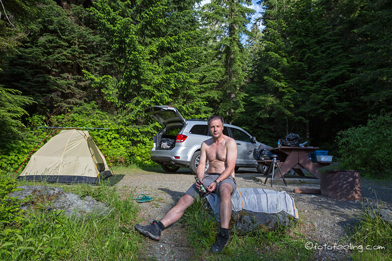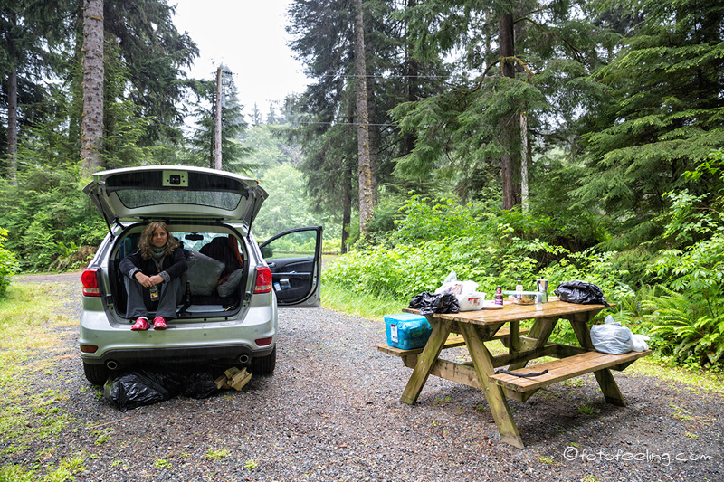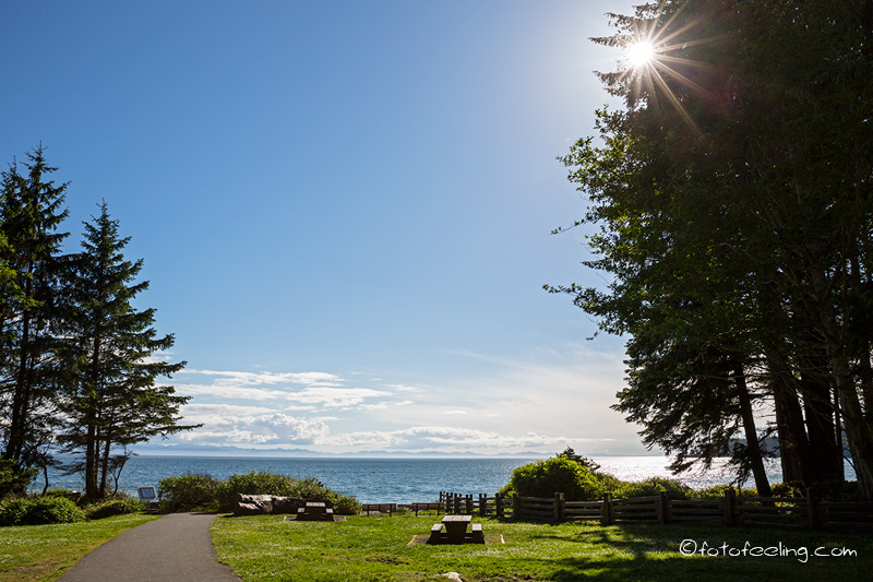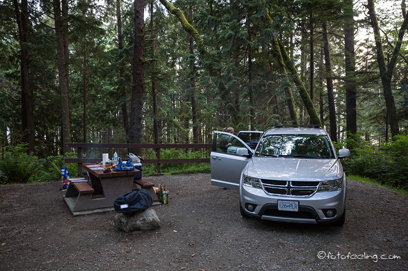 Da uns der Campingplatz am French Beach so gut gefallen hatte, beschlossen wir dorthin zurückzufahren und stellten uns auf eine tolle freie Campsite. Riesige Sitkafichten spendeten Schatten, Farne wuchsen und das Moos war von einem besonders schönen Grün. Tief unter uns rauschten die Wellen. Dies war wirklich ein toller Platz zum Verweilen. Wir packten unser Auto um für die Nacht. Dazu legten wir die Rücksitze um und verstauten alle Taschen und Utensilien nach vorne auf Fahrer- und Beifahrersitz und den Fußraum. Nach getaner Arbeit grillten wir frischen Lachs. Dazu gab es Salat und kühlen Weißwein. Nach dem Essen gingen wir noch einmal an den Strand und schauten den Wellen zu, ehe wir uns um ca. 23 Uhr schlafen legten. Es war immer noch hell, aber zum Glück war es im Wald relativ dunkel, so dass wir schon bald schliefen.