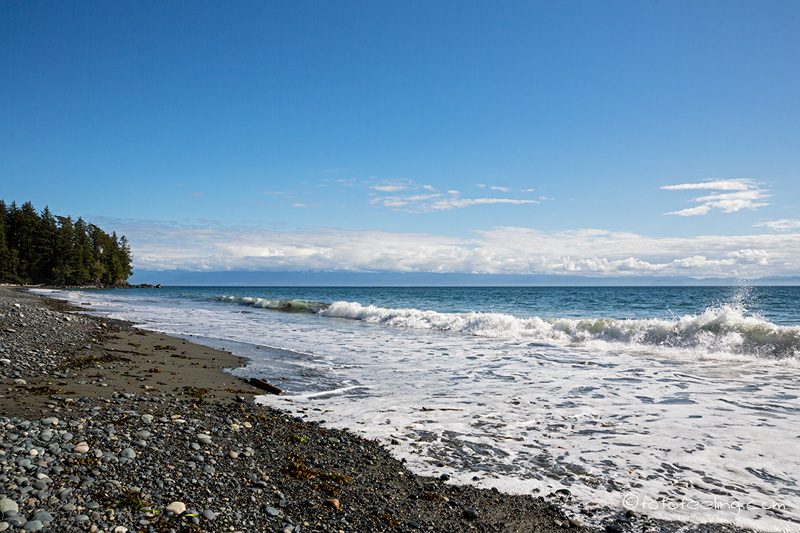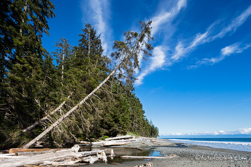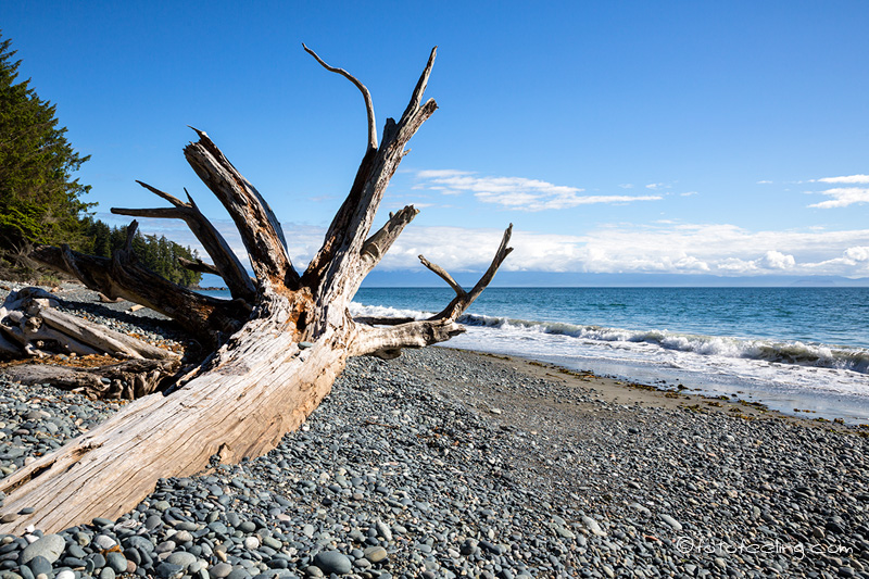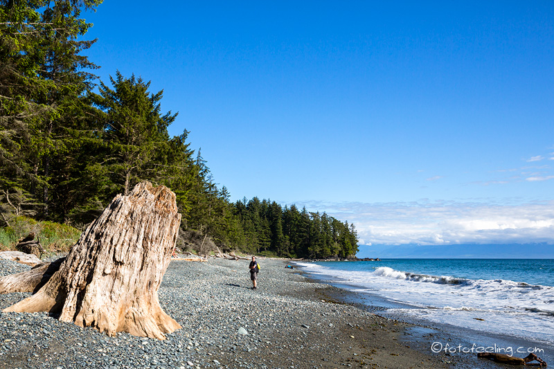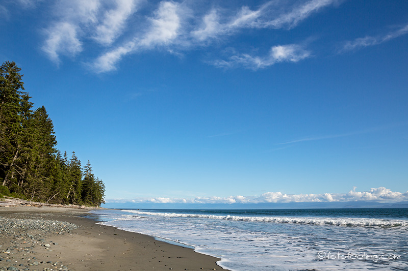 Victoria hatte uns gut gefallen, aber nun reichte es uns erst einmal mit dem Stadtleben und es zog uns hinaus in die Natur. Wir fuhren in Richtung Port Renfrew. Unser erster längerer Stopp war am French Beach Provincial Park. Hier liefen wir einen kurzen Weg, der uns durch Douglasien und Sitkafichten führte bis zu einem schönen Picknickplatz. Ein kleiner Zugang führte uns zum steinigen Strand. Überall lag Treibholz herum, aber nichts Kleines sondern ganze Bäume, die zum Teil übereinander geschichtet waren. Die Wellen krachten ungehindert an den Strand. Es war so schön die Brandung zu hören. Gischt lag in der Luft und wir fühlten uns hier sofort wohl. Auch der Campingplatz gefiel uns sehr gut. Er lag etwas erhöht und schön schattig im Wald. Die Sites waren geräumig und hatten einen angenehmen Abstand zum Nachbarn. Doch es war noch zu früh zum Rasten. So fuhren wir weiter und besichtigten noch den China Beach im Juan de Fuca Provincial Park.