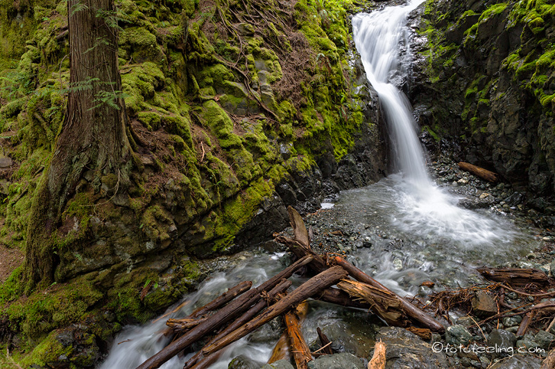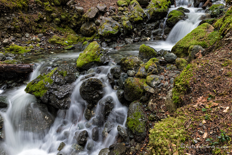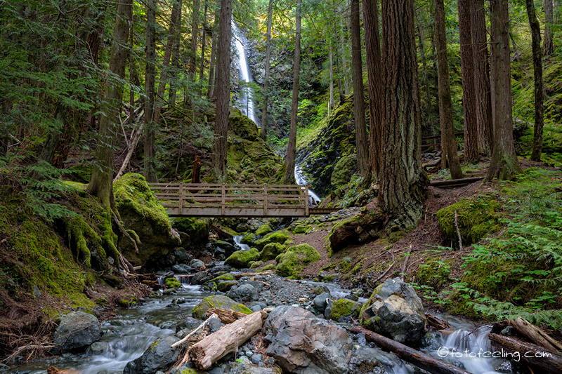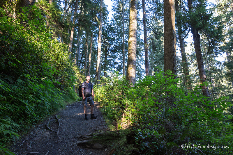 So wanderten wir zu den Lupin Falls. Ein sehr schöner etwas höherer schmaler Wasserfall mitten im ursprünglichen Regenwald. Besonders der Ablauf des Wasserfalls bot einige sehr schöne Motive. Hier waren auch zwei weitere Fotografen am Werk. Wir kamen ins Gespräch und sie erzählten uns, dass wir unbedingt zu den Myra Falls müssten, einem der schönsten Wasserfälle im Park. Da hier im Wald eh viel zu viel Sonnenlicht war, verabschiedeten wir uns von den Beiden und fuhren zu den Myra Falls. Schon der Weg zu den Fällen war sehr schön. Es ging leicht bergab und man hörte schon von weitem das Wasser rauschen. Auch hier gab es wieder mehrere Wege zu den Fällen. So kam man zur Abbruchkante und konnte von oben auf den Fall schauen, der aber leider jetzt am Nachmittag im Gegenlicht lag. An anderer Stelle konnten wir super schön direkt vor den Wasserfall gehen. Auch hier hätten wir gerne eine Wolke vor der Sonne gehabt, aber auch so mit sonnigem Gegenlicht sahen die Fälle wunderschön aus. Wir beschlossen noch einmal am nächsten Morgen hierher zurückzukommen – falls das Wetter es erlaubte.