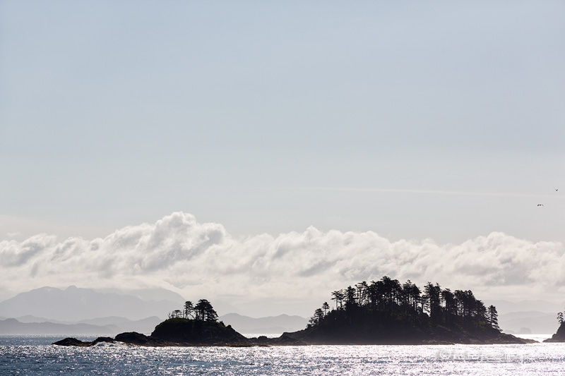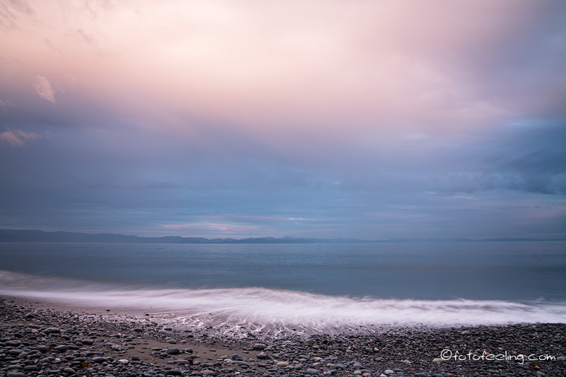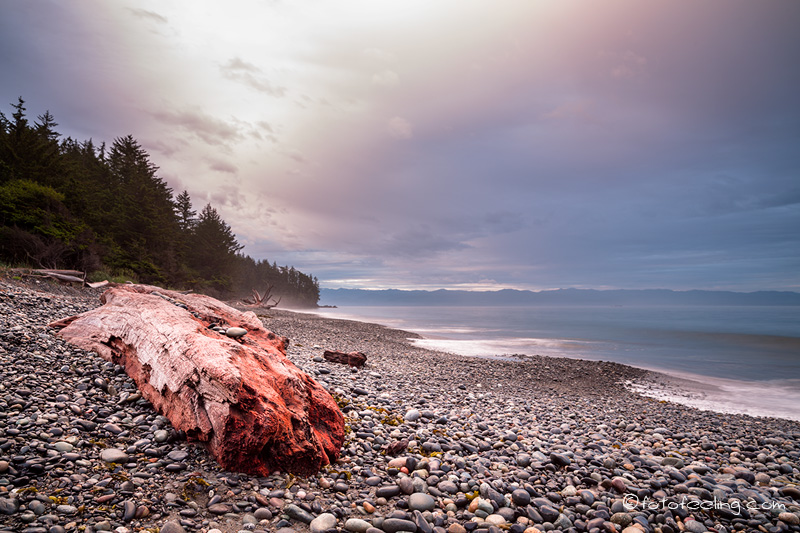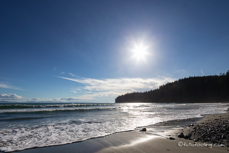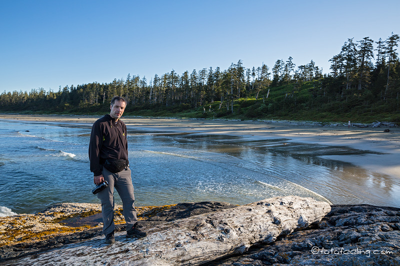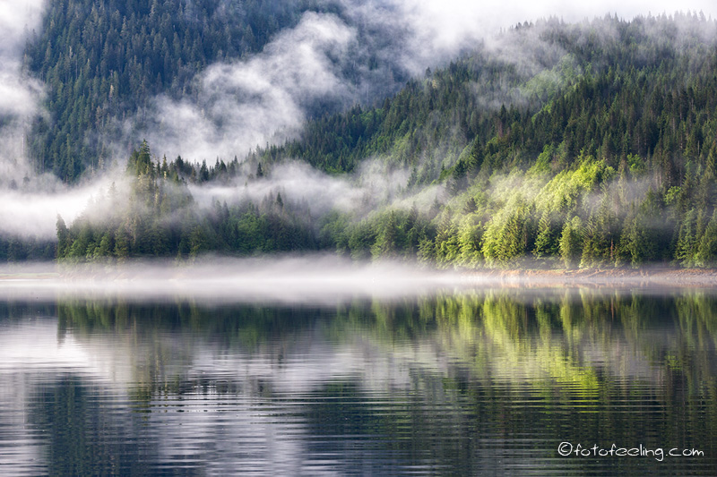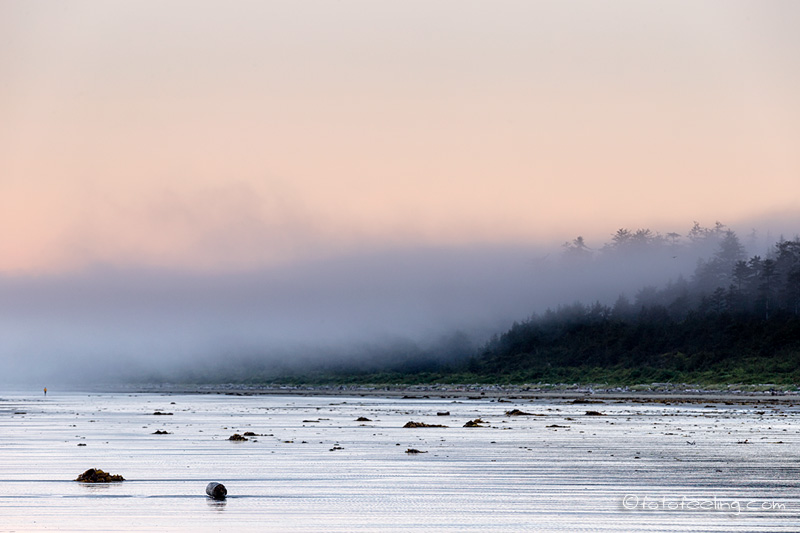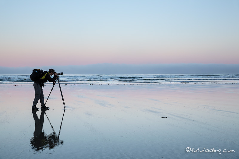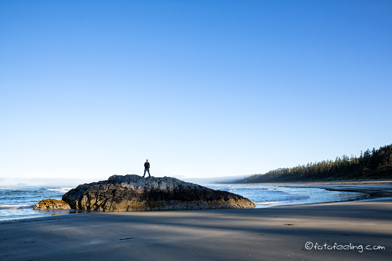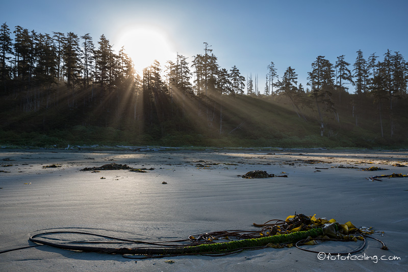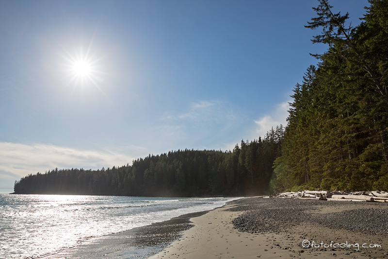 An diesem Morgen standen wir wieder sehr früh auf und gingen diesmal gemeinsam an den Strand hinab. Der Weg dorthin ging ganz schön bergab und so allein am frühen Morgen war es einem schon etwas mulmig, denn auch hier war natürlich Bärengebiet. Doch wir kamen unbehelligt am Strand an. Küstennebel lag auf dem Meer und der Erdschatten leuchtete in Lila- und Rosatönen. Wow, war das ein fantastischer Anblick. Der Long Beach machte seinem Namen alle Ehre, denn er zog sich kilometerweit dahin. Bei kühlen 6°C schlenderten wir am Strand entlang und machten immer wieder Aufnahmen. Der Nebel zog langsam an Land und hüllte die Bucht ein. Als sich die Sonne durch die Bäume schob, sah man zig Strahlen durch den Nebel. Es versprach ein sonniger Tag zu werden. Nur ab und an kam uns ein einsamer Jogger entgegen, ansonsten waren wir weit und breit alleine.