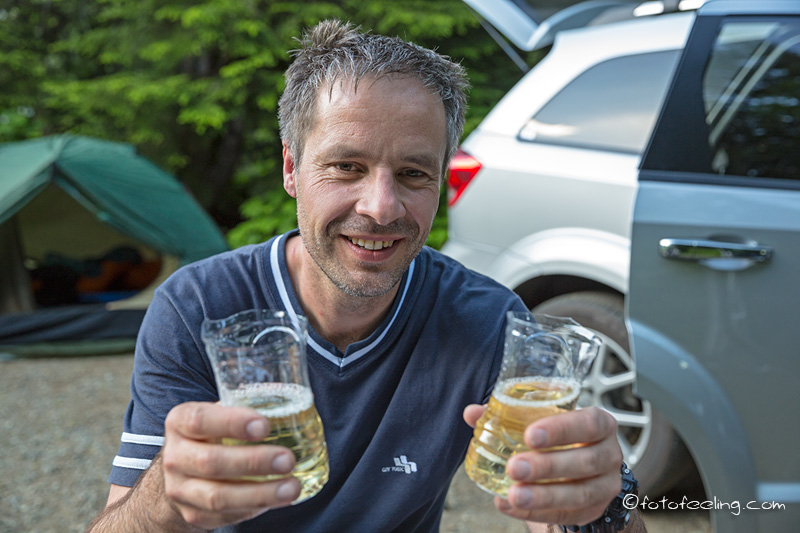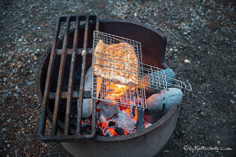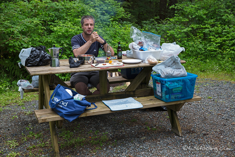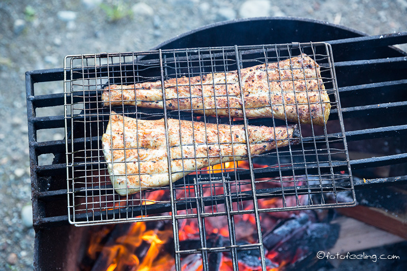 Für den heutigen Tag hatten wir genug unternommen und beschlossen, den Abend ruhig auf der Campsite ausklingen zu lassen. Es waren kaum Leute dort und so hatten wir sogar noch einige Sites mit Seezugang zur Auswahl. Wir stellten unser Zelt auf und verspeisten die ersten geräucherten Lachsteilchen aus Port Alberni. Waren die gut! Als Hauptgericht gab es Heilbutt vom Grill mit Salat. Wir erlebten einen lauen Sommerabend der den schönen Tag perfekt abrundete.