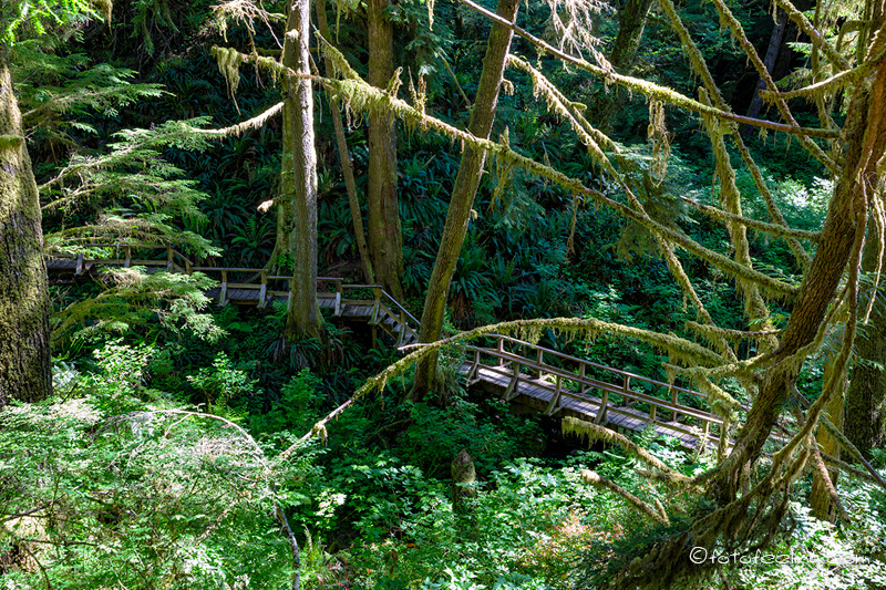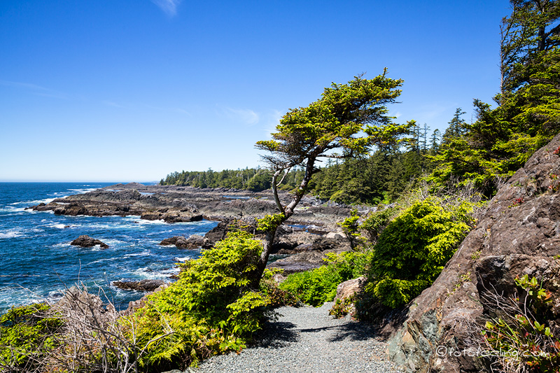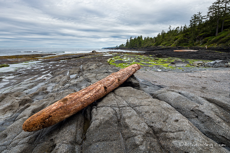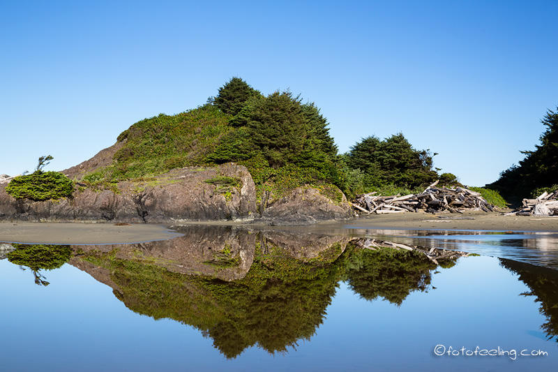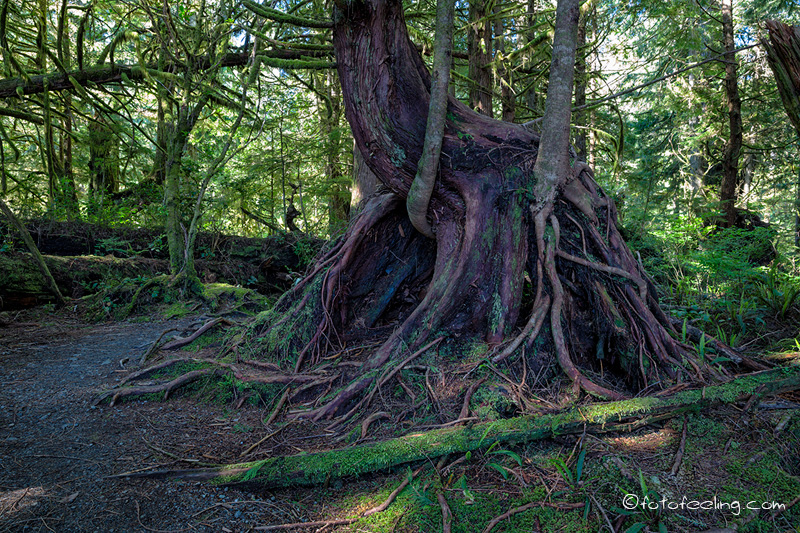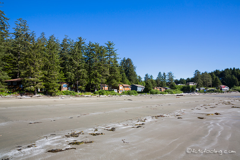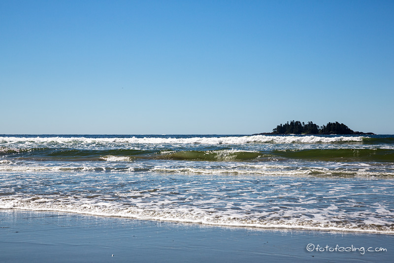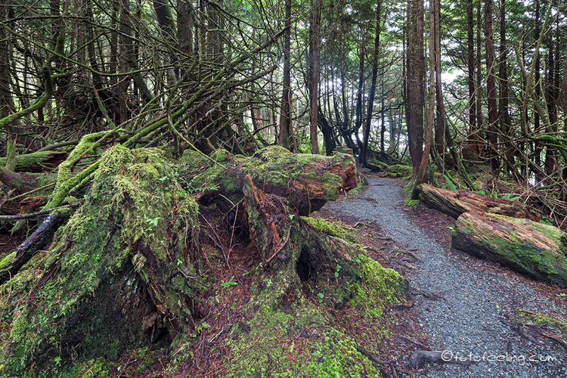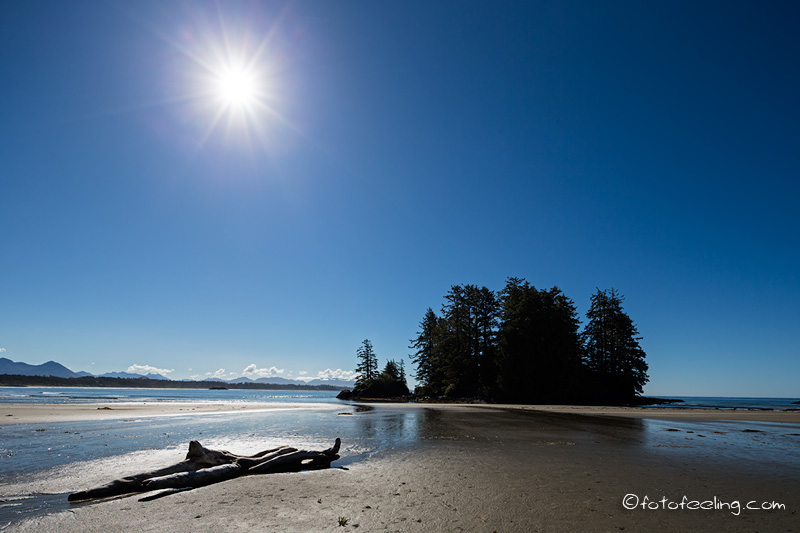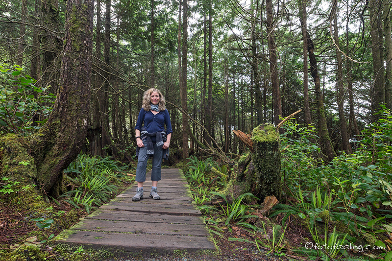 Zuerst fuhren wir nach Tofino und kauften im Supermarkt unsere Marschverpflegung ein. Dann ging es wieder zurück. Wir hielten auf dem Parkplatz am Schooner Cove Trail und stellten dort unser Auto ab. Schilder warnten vor Einbrüchen und da wir wieder einmal die ersten an diesem Morgen waren, die hier ihr Auto abstellten, war uns schon wieder etwas mulmig zu Mute. Wir nahmen die wichtigsten Sachen mit uns, schnürten die Wanderschuhe und begaben uns auf den Trail. Es ist immer wieder ein Wahnsinnsgefühl so in den Regenwald einzutauchen. In Sekundenschnelle ist man in einer anderen Welt. Das Wegesystem war hier echt der Hammer. Es ging bergauf und bergab mit unzähligen Holztreppen und Stegen. Das war liebevolle Kleinarbeit bis ins Detail. Leider schien die Sonne, so war es zwar toll zum Laufen aber katastrophal zum Fotografieren. Die Botanik war hier wieder einmalig schön. Als wir nach einem Kilometer aus dem Regenwald traten, erwartete uns das Nordende des Long Beaches. Schön war es hier. Unser Blick blieb gleich an einer weiteren wundervollen baumbewachsenen Insel hängen. Etwas Treibholz lag herum. Gleich um die Ecke waren ein paar Häuser, keine Ahnung ob wir dort hätten parken können, aber der Weg war so schön, dass wir ihn nicht missen wollten.