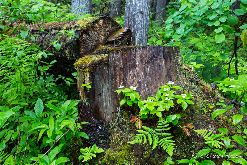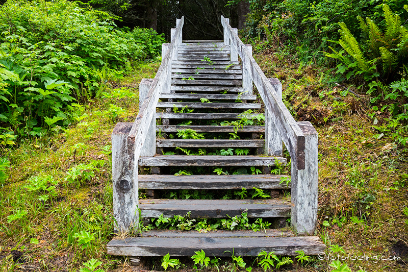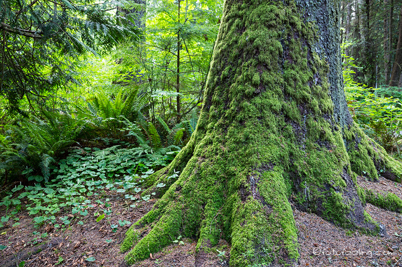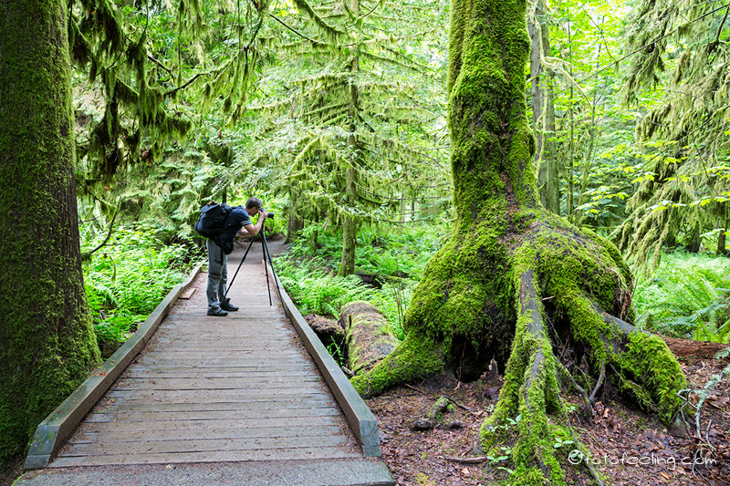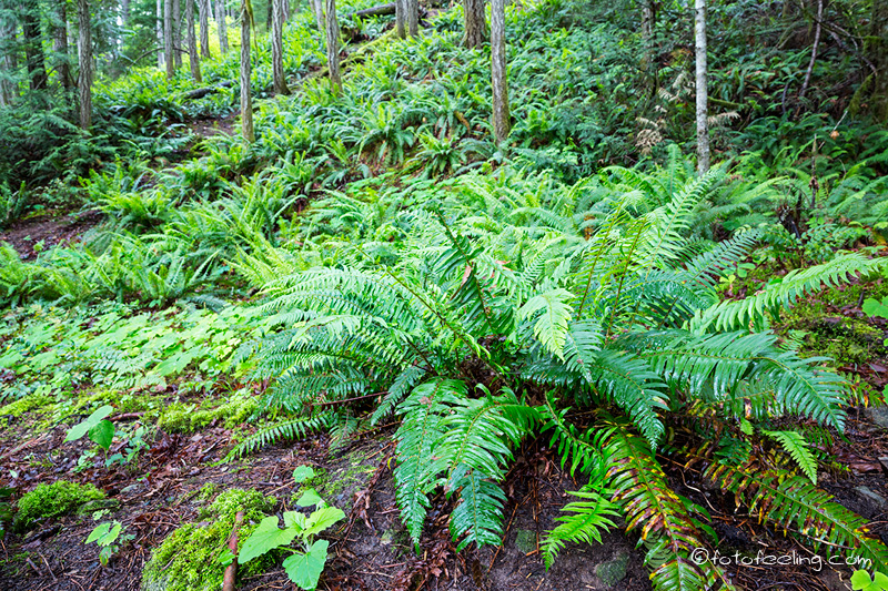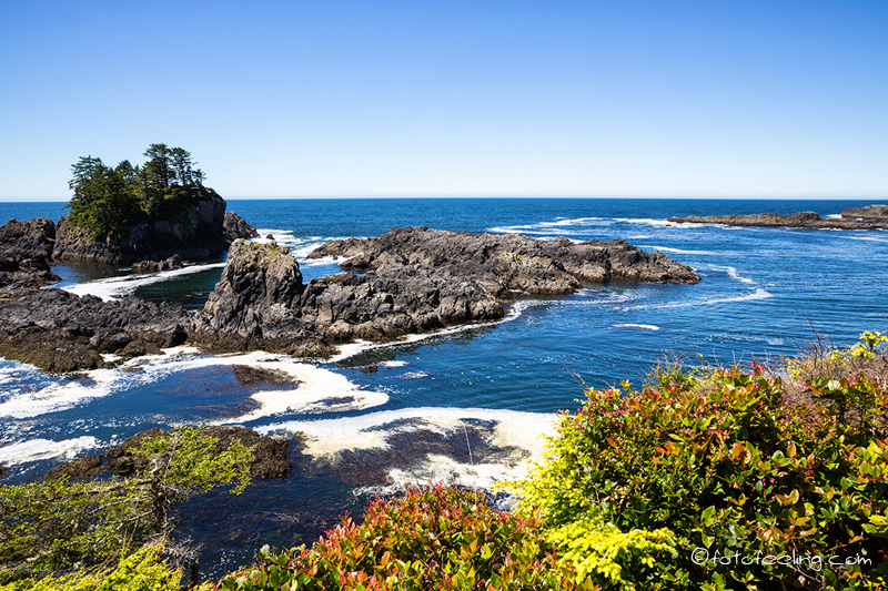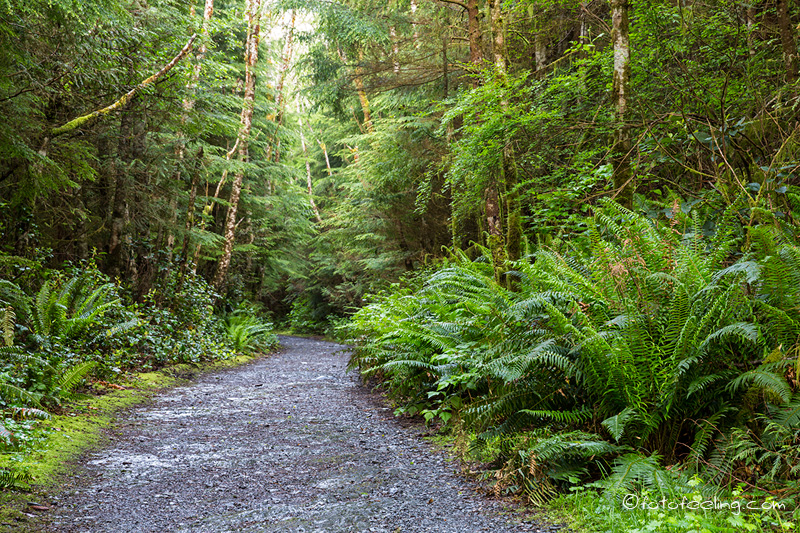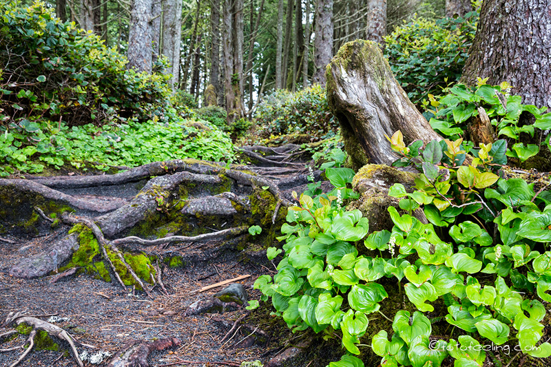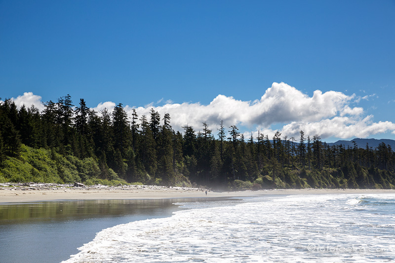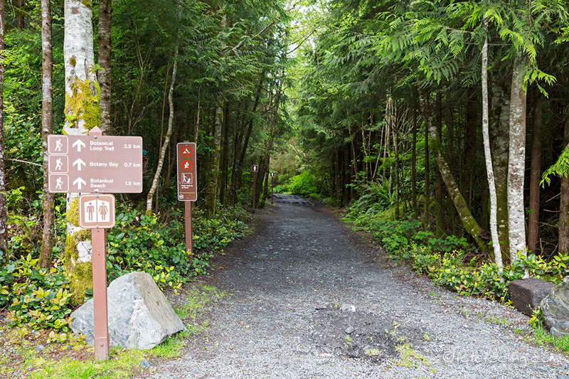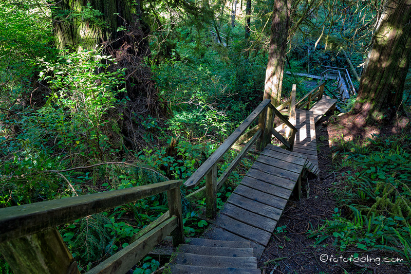 Zuerst fuhren wir nach Tofino und kauften im Supermarkt unsere Marschverpflegung ein. Dann ging es wieder zurück. Wir hielten auf dem Parkplatz am Schooner Cove Trail und stellten dort unser Auto ab. Schilder warnten vor Einbrüchen und da wir wieder einmal die ersten an diesem Morgen waren, die hier ihr Auto abstellten, war uns schon wieder etwas mulmig zu Mute. Wir nahmen die wichtigsten Sachen mit uns, schnürten die Wanderschuhe und begaben uns auf den Trail. Es ist immer wieder ein Wahnsinnsgefühl so in den Regenwald einzutauchen. In Sekundenschnelle ist man in einer anderen Welt. Das Wegesystem war hier echt der Hammer. Es ging bergauf und bergab mit unzähligen Holztreppen und Stegen. Das war liebevolle Kleinarbeit bis ins Detail. Leider schien die Sonne, so war es zwar toll zum Laufen aber katastrophal zum Fotografieren. Die Botanik war hier wieder einmalig schön. Als wir nach einem Kilometer aus dem Regenwald traten, erwartete uns das Nordende des Long Beaches. Schön war es hier. Unser Blick blieb gleich an einer weiteren wundervollen baumbewachsenen Insel hängen. Etwas Treibholz lag herum. Gleich um die Ecke waren ein paar Häuser, keine Ahnung ob wir dort hätten parken können, aber der Weg war so schön, dass wir ihn nicht missen wollten.