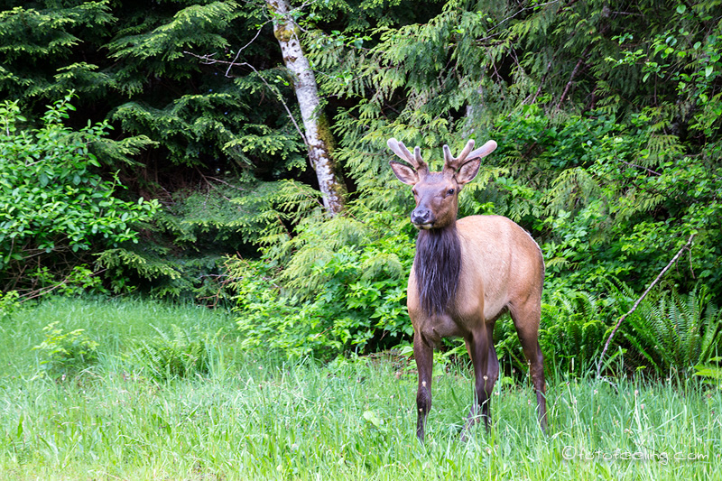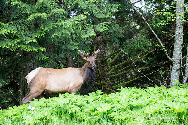 Zum Glück fing es erst auf dem Rückweg an etwas zu regnen. Zurück auf dem Parkplatz baute ein Ranger gerade einen kleinen Stand mit Wasserflaschen auf. Wir unterhielten uns etwas mit ihm und er gab uns den Tipp nicht den gesamten Weg bis Victoria zurückzufahren, sondern auf einer neuen Straße direkt nach Tofino zu reisen. Damit würden wir uns viel Zeit und noch mehr Verkehr sparen. Die Straße war noch nicht in unserer Navikarte eingezeichnet, darum hatten wir mit dieser Abkürzung überhaupt nicht gerechnet. Er gab uns sogar noch eine Straßenkarte mit, damit wir uns auch ja nicht verfuhren und schon ging es weiter. Die Hirsche grasten immer noch am Straßenrand.