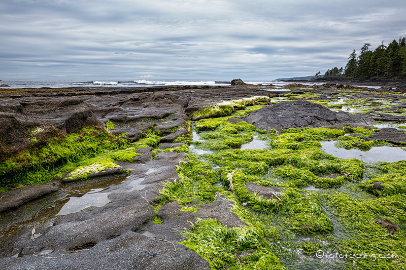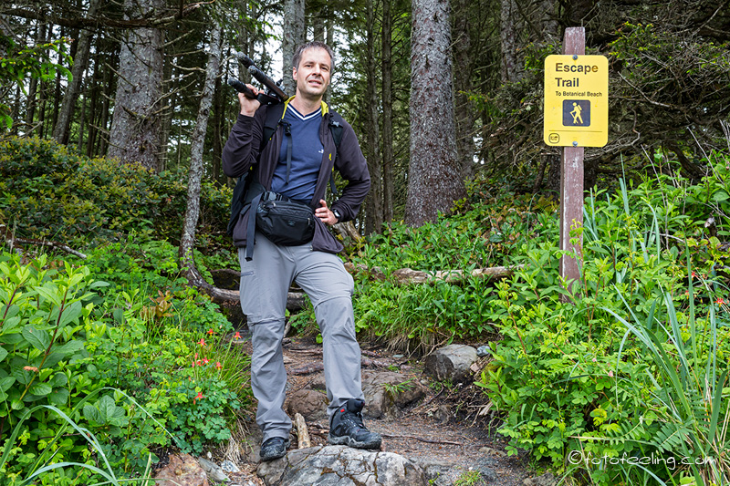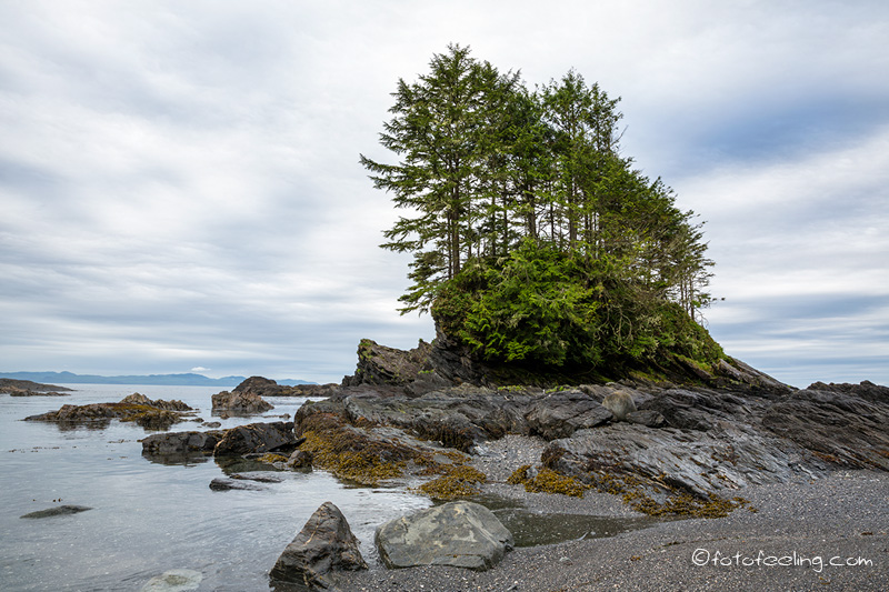 Wir stellten unser Auto am Parkplatz ab und begaben uns auf den perfekt angelegten Rundweg zum Botanical Beach. Durch dichten Wald mit vielen großen Farnen gelangten wie schließlich zu unserem ersten Stopp, der Botany Bay, einer schönen kleinen Bucht mit einer fotogenen Felseninsel, auf der Fichten wachsen. Hier wäre ein idealer Punkt für den Sonnenuntergang, aber nicht an so einem zugezogenen Tag wie heute. Leider war der Himmel relativ grau, auch wenn ab und zu etwas Blau hervorlugte.
