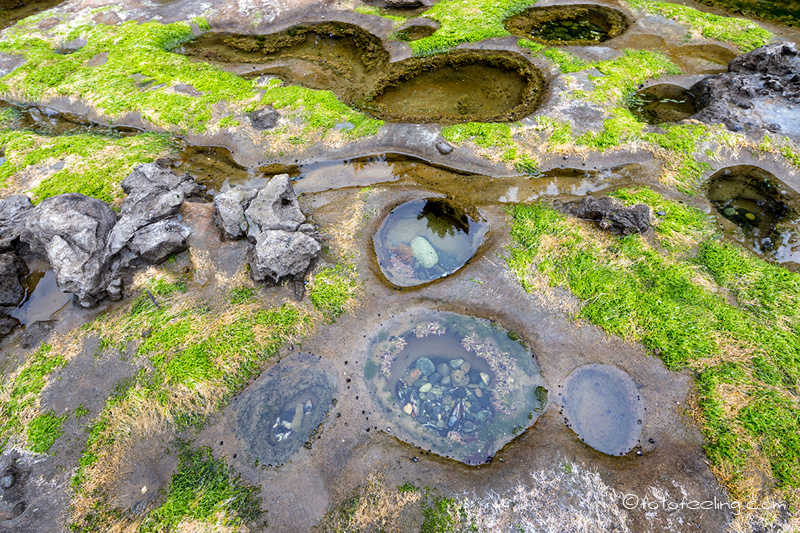 Durch einen kleinen Zugang kamen wir schließlich an den Strand. Doch zuerst mussten wir über Treibholz kraxeln, das bis zum Wald geschwemmt worden war. Da mittags Ebbe sein sollte, hatte sich die Flut am späten Vormittag schon weit zurückgezogen und wir kletterten über die Sandsteinklippen. Überall waren zum Teil recht tiefe mit Wasser gefüllte Pools zu sehen, in denen Muscheln und Steine lagen. Wieder waren wir ganz alleine unterwegs. Es gefiel uns absolut gut, auch wenn ich vergeblich nach Seesternen oder farbigen Seeanemonen Ausschau hielt.