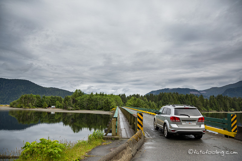 Mit ein wenig Suchen fanden wir die richtige Brücke über den Fluss nach Tofino. Am anderen Ufer campten Leute. Hier war es richtig idyllisch.