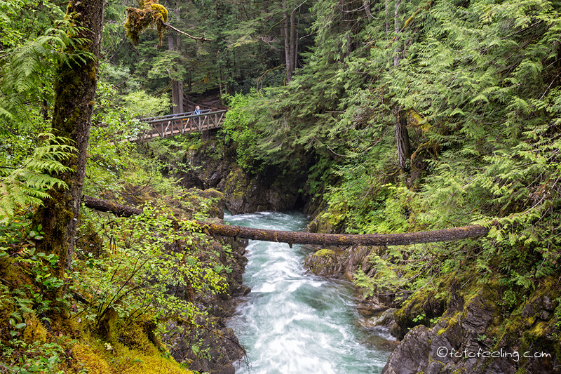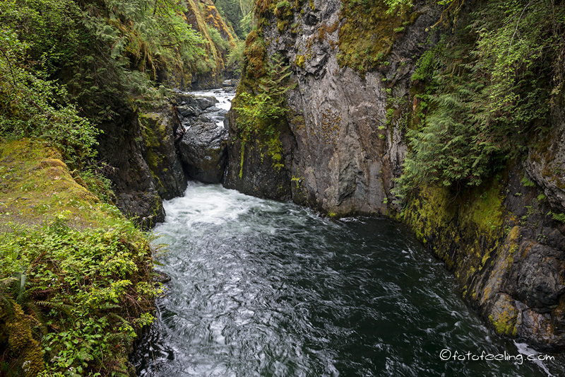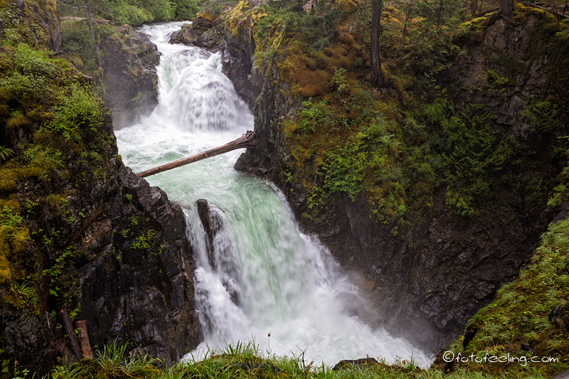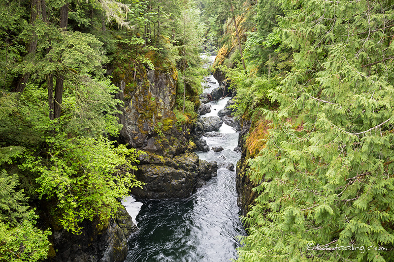 Nächster Stopp war der Little Qualicum Falls Provincial Park. Der Wasserfall stürzt hier 17 Meter in die Tiefe um weiter stromabwärts am Lower Little Qualicum Falls noch einmal 5 Meter in die Schlucht zu rauschen. Wieder waren wir von der Schönheit des Regenwaldes schwer beeindruckt, das regnerische Wetter passte auch perfekt zu unserer Wasserfallrunde. Auch hier querten wir über zwei Brücken die Schlucht und wanderten am Rande des Canyons entlang, immer mit Blick auf den Fluss und das milchig grüne Wasser.