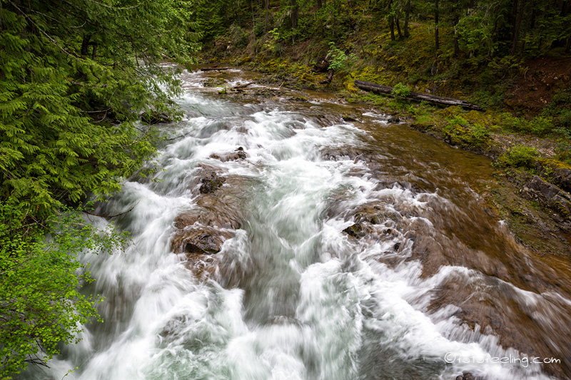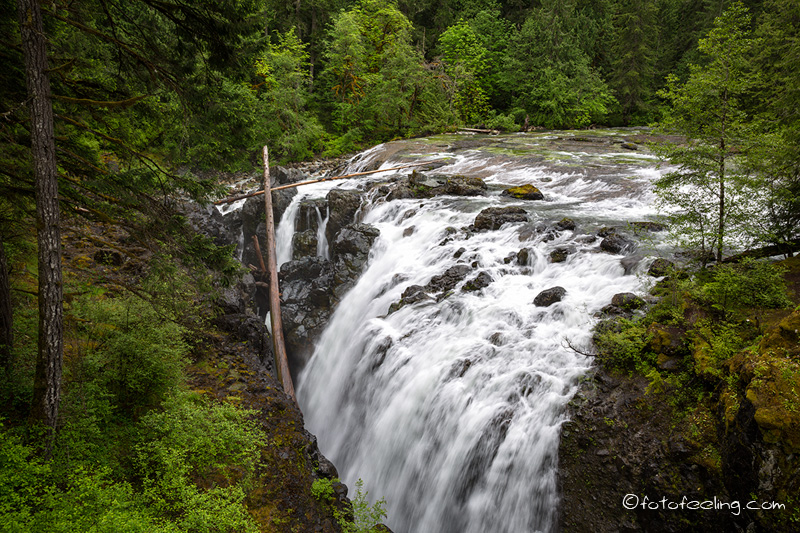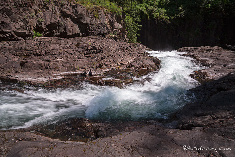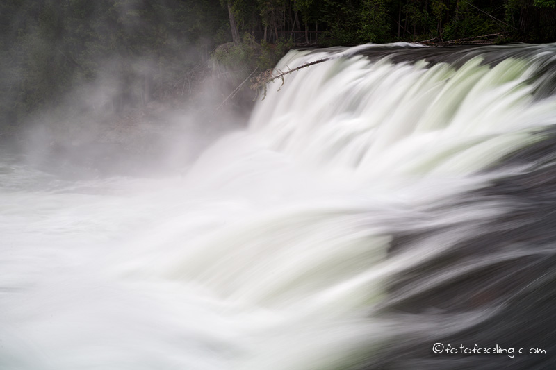 Danach ging es weiter auf der Valley Road bis wir den Parkplatz zu den Dawson Falls erreichten. Nach einer kleinen ca. 10 Minuten Wanderung durch schönen Wald, erreichten wir den ersten Aussichtspunkt auf den Wasserfall. Hier fließt der Murtle River mit einer Breite von ca. 90 Metern und einer Fallhöhe von 18 Metern über die Kante. An diesem Wasserfall begeistert weniger die Höhe als die Unmenge an Wasser, die sich hier ihren Weg über die Felsen bahnt. Das Licht war diesmal deutlich besser und wir wanderten weiter zum zweiten Aussichtspunkt, von dem man direkt auf die Abbruchkante schaut. Wahnsinn, erst hier bekommt man so richtig ein Gefühl für die Menge und Geschwindigkeit des Wassers. Je länger man hinsah desto mehr wurde man in den Sog des Wassers gezogen, ja fast schon hypnotisiert. Dank einer Absperrung konnte aber nichts passieren. Die Gischt schäumte von der Kraft des Wassers und das Tosen war unglaublich laut.