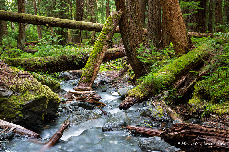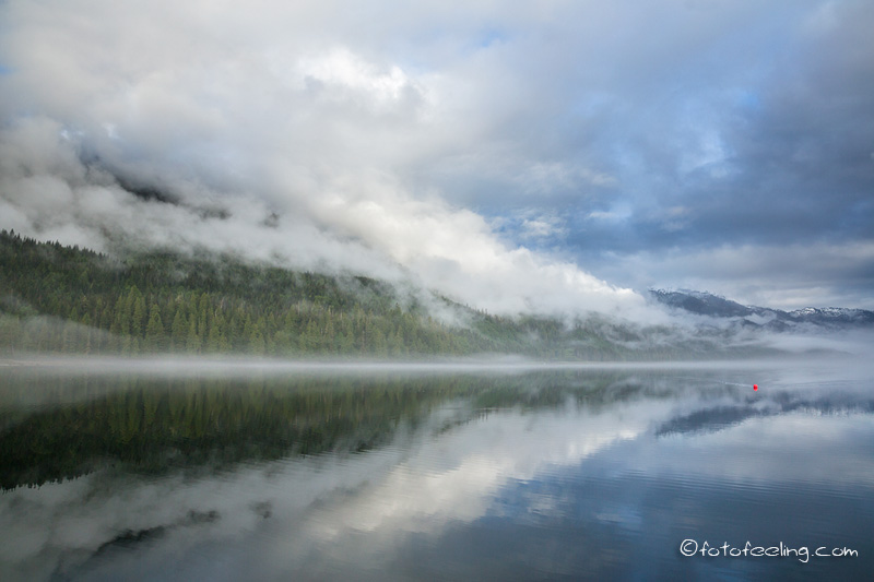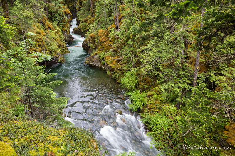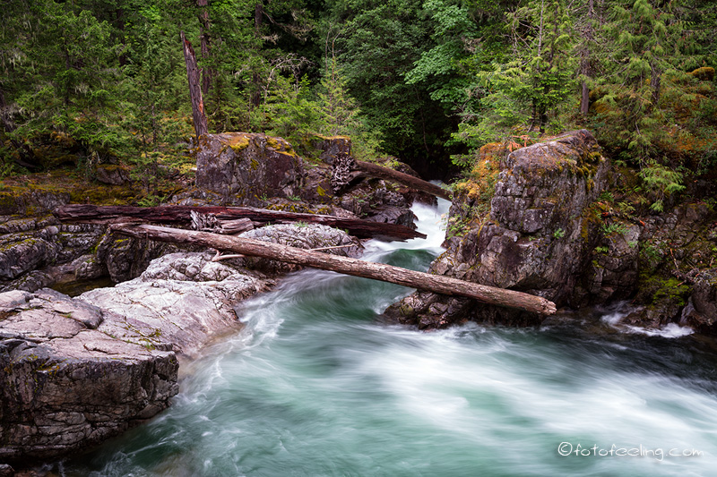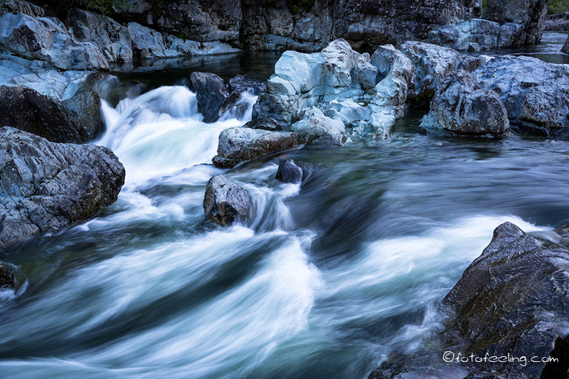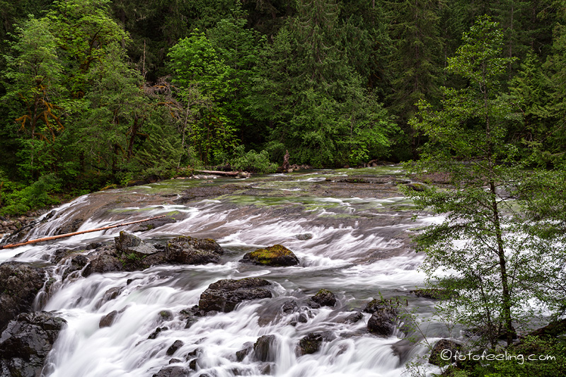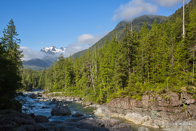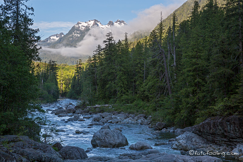 Doch für uns hieß es Abschied nehmen von diesem wunderbaren Platz, denn wir wollten ja noch etwas mehr von Vancouver Island sehen und am 5.6. war unsere Fähre von Port Hardy aus gebucht. Also trennten wir uns schweren Herzens von unserem Traumstrand und Campingplatz Long Beach und machten uns auf den Weg. Leider verpassten wir irgendwie den Zugang zum Regenwald, denn an diesem Morgen war durch den Hochnebel genau das richtige Licht für einen Spaziergang durch den Regenwald. Aber wir merkten unseren Fehler erst, als wir schon kilometerweit an der Einfahrt zum Wald vorbei waren. Jetzt wollten wir auch nicht mehr umkehren und so fuhren wir weiter bis zum Wally Creek. Dieser Fluss mit seinen geschliffenen Steinen und dem wild dahin fließenden Wasser ist einfach zu schön. Im Hintergrund leuchteten die schneebedeckten Berge, doch leider lag der gesamte Fluss noch im Schatten. Wir beschlossen zu warten und machten ein paar Bilder vom Wasser und den Steinen. Momentan war der Fluss ja nur ein kleines Rinnsal und wir konnten bequem auf den Felsen das Flussbett erkunden, aber bei Hochwasser schoss hier sicher ein mächtiger Fluss entlang. Etwas später kam das erste Licht so langsam über den Berg und beleuchtete zumindest die Bäume und etwas später den Fluss. Länger konnten wir jedoch nicht warten, denn wahrscheinlich würde das gesamte Flussbett erst mittags ausgeleuchtet sein und wir hatten ja noch einen weiten Weg vor uns.