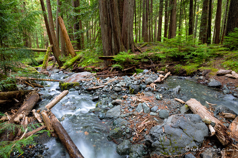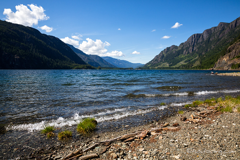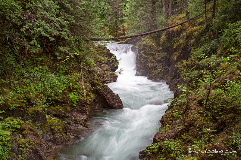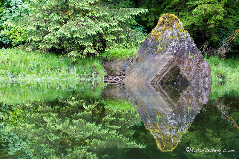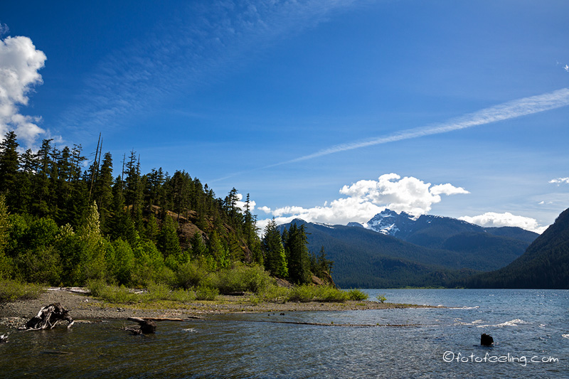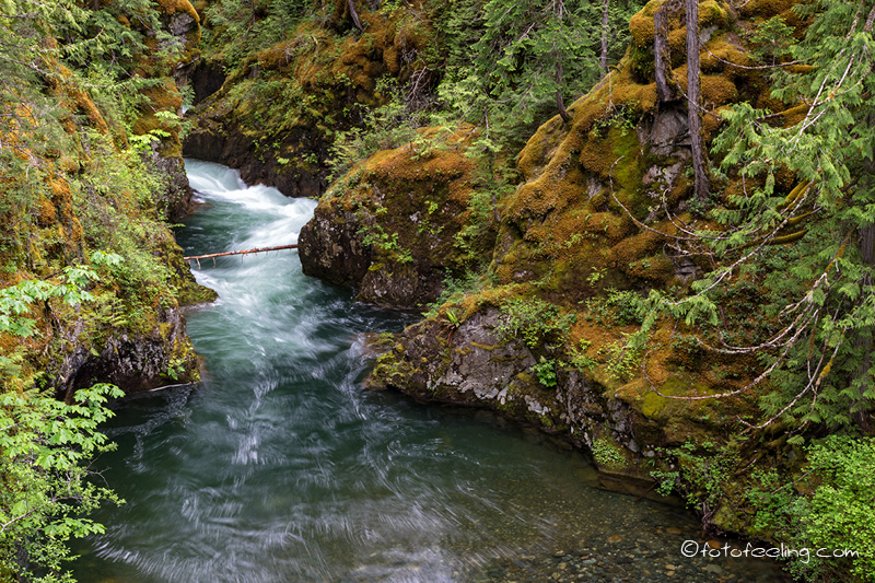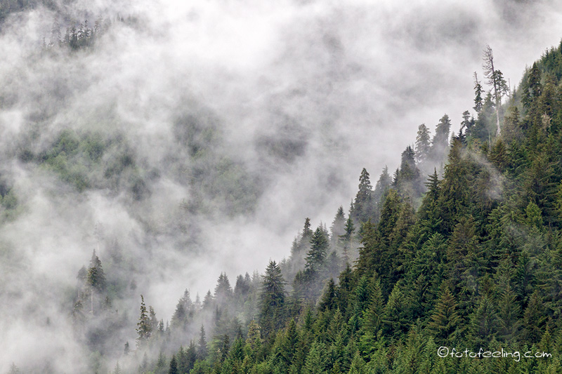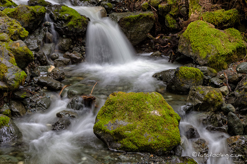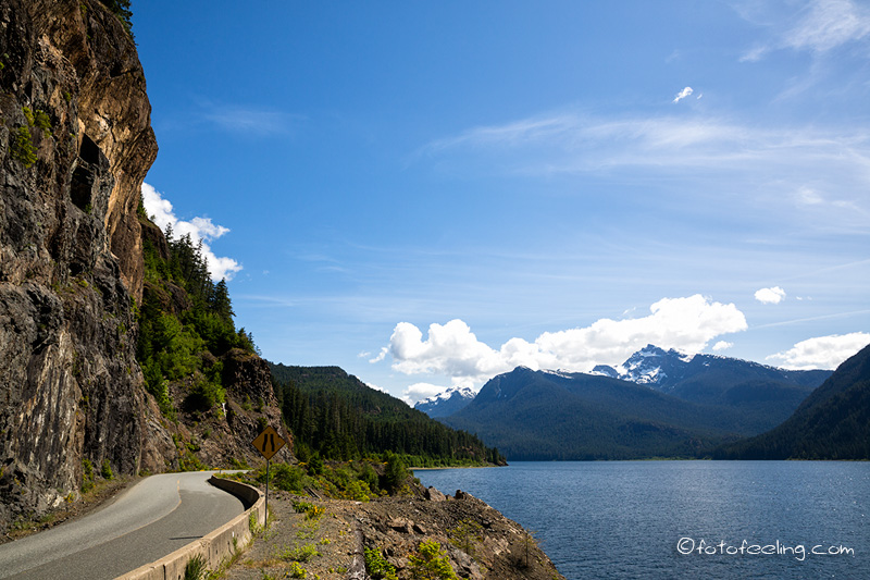 Doch für uns hieß es Abschied nehmen von diesem wunderbaren Platz, denn wir wollten ja noch etwas mehr von Vancouver Island sehen und am 5.6. war unsere Fähre von Port Hardy aus gebucht. Also trennten wir uns schweren Herzens von unserem Traumstrand und Campingplatz Long Beach und machten uns auf den Weg. Leider verpassten wir irgendwie den Zugang zum Regenwald, denn an diesem Morgen war durch den Hochnebel genau das richtige Licht für einen Spaziergang durch den Regenwald. Aber wir merkten unseren Fehler erst, als wir schon kilometerweit an der Einfahrt zum Wald vorbei waren. Jetzt wollten wir auch nicht mehr umkehren und so fuhren wir weiter bis zum Wally Creek. Dieser Fluss mit seinen geschliffenen Steinen und dem wild dahin fließenden Wasser ist einfach zu schön. Im Hintergrund leuchteten die schneebedeckten Berge, doch leider lag der gesamte Fluss noch im Schatten. Wir beschlossen zu warten und machten ein paar Bilder vom Wasser und den Steinen. Momentan war der Fluss ja nur ein kleines Rinnsal und wir konnten bequem auf den Felsen das Flussbett erkunden, aber bei Hochwasser schoss hier sicher ein mächtiger Fluss entlang. Etwas später kam das erste Licht so langsam über den Berg und beleuchtete zumindest die Bäume und etwas später den Fluss. Länger konnten wir jedoch nicht warten, denn wahrscheinlich würde das gesamte Flussbett erst mittags ausgeleuchtet sein und wir hatten ja noch einen weiten Weg vor uns.