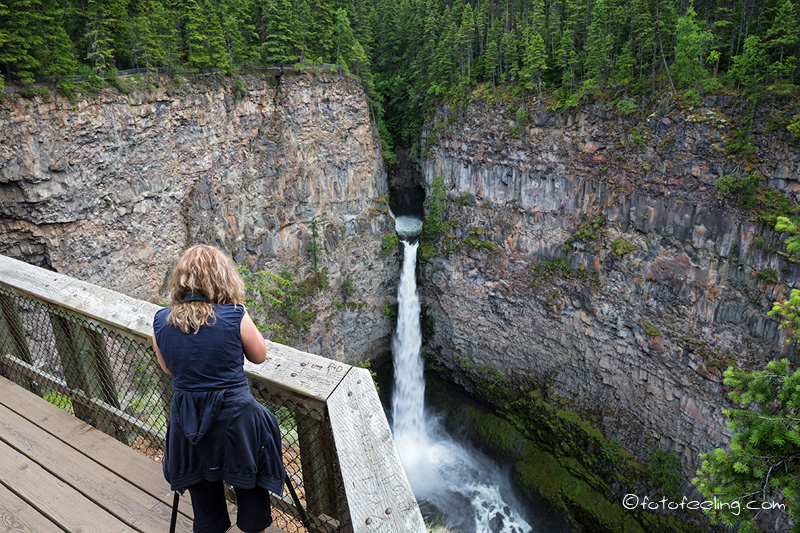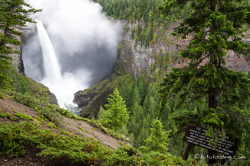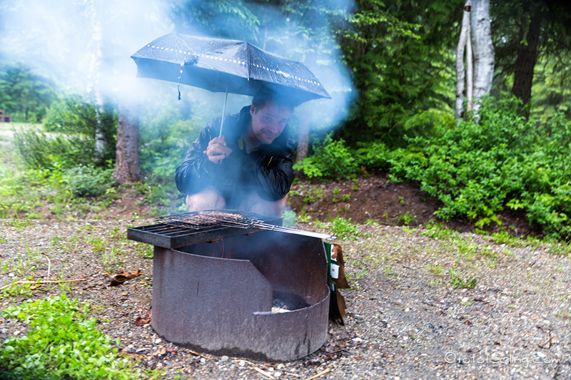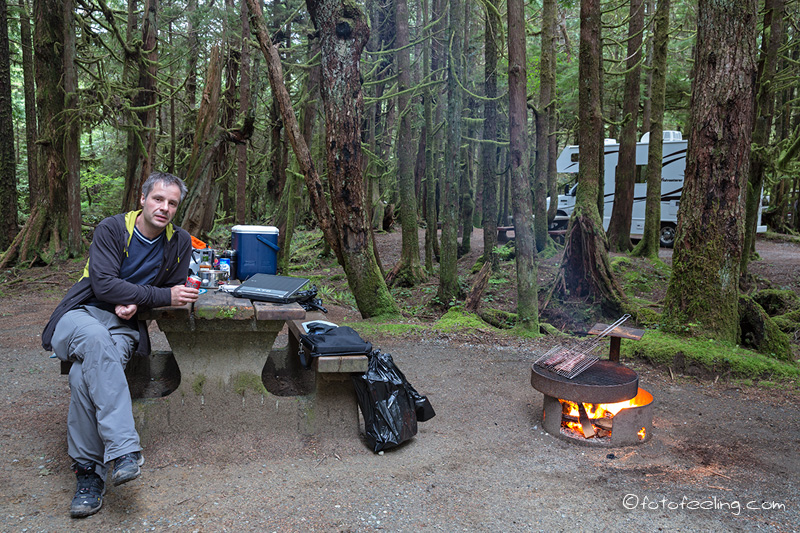 Die Chance nutzten wir und brachen sofort zu dem Wasserfall auf. Nach diesem aufregenden Thriller war uns schon etwas mulmig zumute, zumal wir ganz alleine den Weg zu den Fällen gingen. Bei jedem Knacken oder Rascheln schaute ich gleich auf, aber entweder war es nur ein Eichhörnchen oder es kamen doch noch ein paar Leute. Dafür war die Stimmung an den Helmcken Falls unbeschreiblich toll. Es passte irgendwie alles, das fast nicht vorhandene Licht, die Gischt im Wasserfall und die ganze Stimmung. Begeistert machten wir ein paar Bilder und fuhren dann auf den Pyramid Campground, ein schöner Platz mit großen Stellplätzen und wenig Bewuchs. Dies war leider an diesem Tag nicht ganz so optimal, denn mittlerweile goss es wieder. Doch unser Fleisch musste weg und so warf Chris den Grill an. Mit meinem Schirm schütze Chris das Feuer. Der Schirm stank noch Wochen später wie frisch geräuchert und wir konnten ihn anhand des Geruchs mühelos überall finden. Dafür schmeckte das Fleisch wieder besonders gut. Auch wenn wir an diesem Abend viel lachten und sicherlich die Einzigen auf dem ganzen Campingplatz waren, die mitten im Regen ein Feuer hatten, das wir mit einem Schirm beschützen mussten, brauchte ich solch einen Abend nicht so schnell wieder.