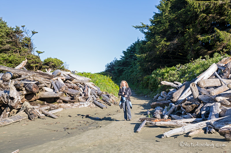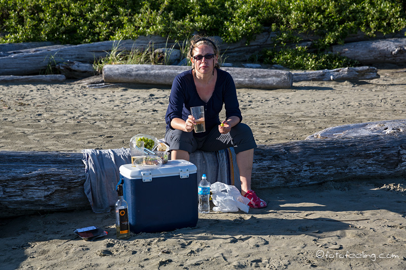 Wir erkundeten auch noch die Nachbarbucht (Combers Beach), zu der man durch einen kleinen Durchgang gelangte. Hier am Durchgang lag alles voll mit aufgeschichtetem Treibholz. Bei hoher Flut und mächtigem Sturm musste hier ganz schön was los sein. Zum Glück war es an diesem Morgen einfach nur schön und wir spazierten auch hier am Strand entlang. Einige muschelbesetzte Felsen hatte das Meer schon freigegeben und so setzten wir uns auf einen, sahen den Joggern zu und genossen das Rauschen des Meeres. Natürlich hatte ich wieder meinen Kaffeebecher dabei und ich muss sagen, so in den ersten wärmenden Sonnenstrahlen auf "meinem" Felsen mit Blick auf das Meer schmeckte der Kaffee gleich noch viel besser. Hier konnte man es aushalten. Wir wussten noch nicht so recht, was wir an diesem Tag machen wollten - weiterfahren, oder hier die Umgebung erkunden. Diese Entscheidung wurde uns durch die Aussage einer Rangerin abgenommen, denn sie empfahl uns an diesem schönen Tag, den Wild Pacific Trail zu laufen. Sie sagte uns auch noch wo wir eine öffentliche Dusche finden, denn auf dem Campingplatz gab es nur Plumpsklos. So beschlossen wir den sonnig warmen Tag zu nutzen und ausgiebig den Pacific Rim Nationalpark zu erwandern.