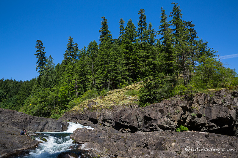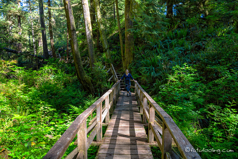 Doch auf der Strecke lagen noch ein paar absolut sehenswerte Ziele. So war unser erster Stopp im Englishman River Falls Provincial Park. Hier stürzt der gleichnamige Fluss über zwei Wasserfälle in einen tiefen Canyon. Eine Brücke führte uns über den Canyon. Auf den angelegten Wegen wanderten wir durch den üppigen Urwald mit vielen Farnen und Flechten an der Schlucht und dem Fluss entlang. Baumstämme lagen wie vergessene Mikado Stäbchen am Rande des einen Wasserfalls. Das Tosen des wilden Wassers war laut und man konnte förmlich die Kraft der Naturgewalt spüren.
