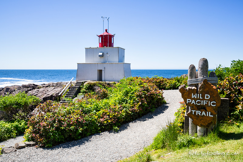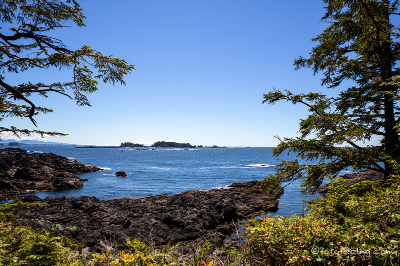 Nach unserer Strandtour fuhren wir nach Ucluelet, um den Wild Pacific Trail zu laufen. Ein sehr schöner 2,6 km langer Rundweg führte uns um einen Leuchtturm (Amphitrite Lighthouse) herum. Unter uns die wild romantische Küste mit unzähligen Inseln und Felsen. An einer besonders schönen Aussicht verspeisten wir unser Mittagessen. Es gab frisch geräucherten Lachs mit knusprigen Semmeln. Das Meer rauschte unter uns und Wellen krachten an die vorgelagerten Felsen. Was für ein Wahnsinnswetter. Das hätten wir nicht einmal zu hoffen gewagt. Uns war richtig warm und der Weg einfach nur wundervoll.