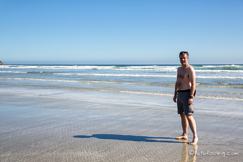 Später hielten wir noch an anderen Zugängen zum Long Beach. Die Sonne brannte mittlerweile mächtig vom Himmel, so dass Chris kurzerhand ins Meer sprang. Ein schon fast seltsamer Anblick, da sich sonst nur neoprenbekleidete Menschen mit Surfbrettern in die Wellen warfen. Ich begnügte mich damit meine Füße ins Wasser zu halten und barfuß am Strand entlang zu laufen.