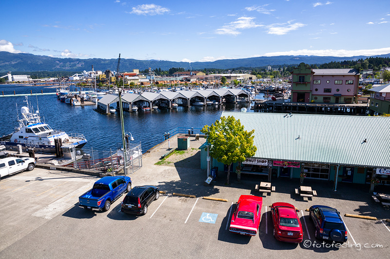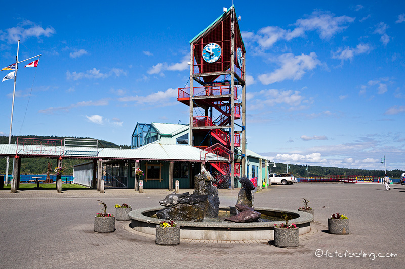 In Port Alberni kauften wir im hiesigen Fischladen frisch geräucherten Lachs ein. Am Hafen, dem Alberni Harbor Quay gab es eine kleine Einkaufsmeile mit einem sehr guten Donuts Laden und einem kleinen Turm, auf den man steigen konnte. Ein wirklich netter Ort. Wir kauften auch noch ein paar Lebensmittel im Quality Food Store ein – ein toller Laden mit einem urigen Starbucks im Obergeschoss, wo wir selbstverständlich meiner Kaffeesucht nachgehen mussten.