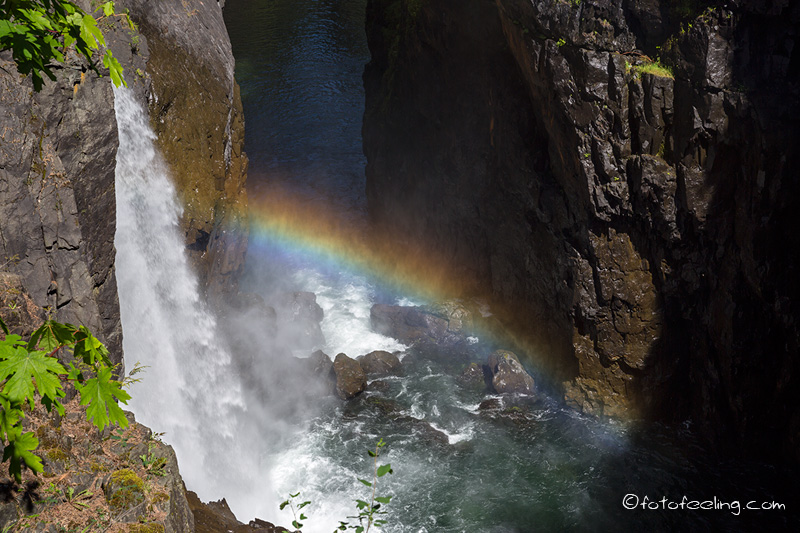 Im Elk Falls Provincial Park nahe Campbell River am Highway 28 besuchten wir die Hauptattraktion des Parks, die 25 m hohen Elk Falls. Hier stürzt der Campbell River spektakulär über die Felsen in eine tiefe Schlucht. Ein Wegesystem führte uns zu einer Aussichtsplattform mit Blick auf den Wasserfall. Durch die Sonne hatte sich in der Schlucht ein schöner Regenbogen gebildet, der in allen Farben schillerte.