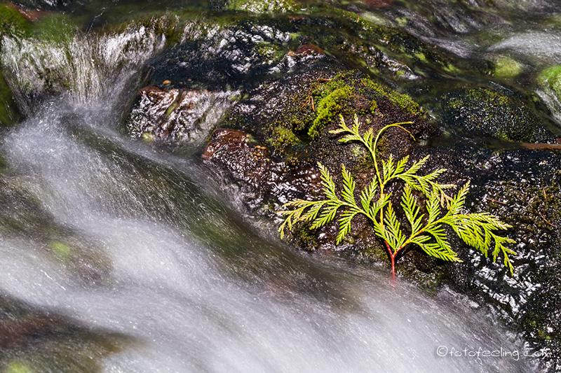 Ein weiterer Weg führte uns direkt an den Zulauf zum Wasserfall. Hier konnte man ohne Geländer am Fluss bis zur Abbruchkante wandern. Das Wasser schoss mit hoher Geschwindigkeit auf die Felsklippe zu. Chris war besonders von einem kleinen Farn fasziniert, der der Kraft des Wasser trotzte und direkt an einem Felsen im Fluss wuchs.