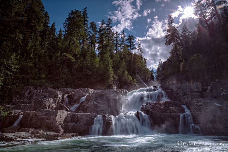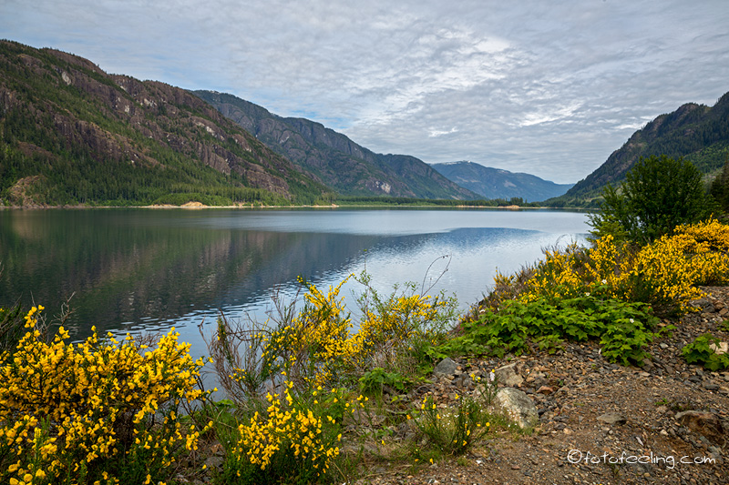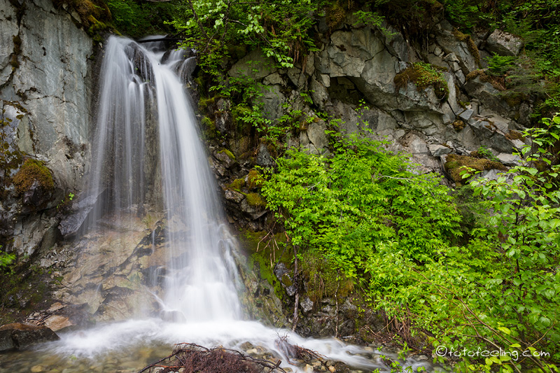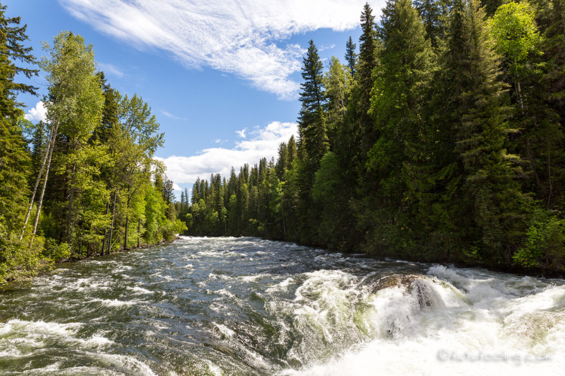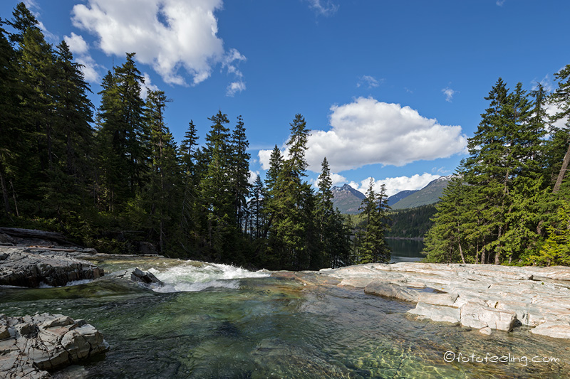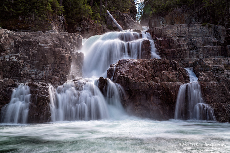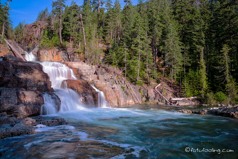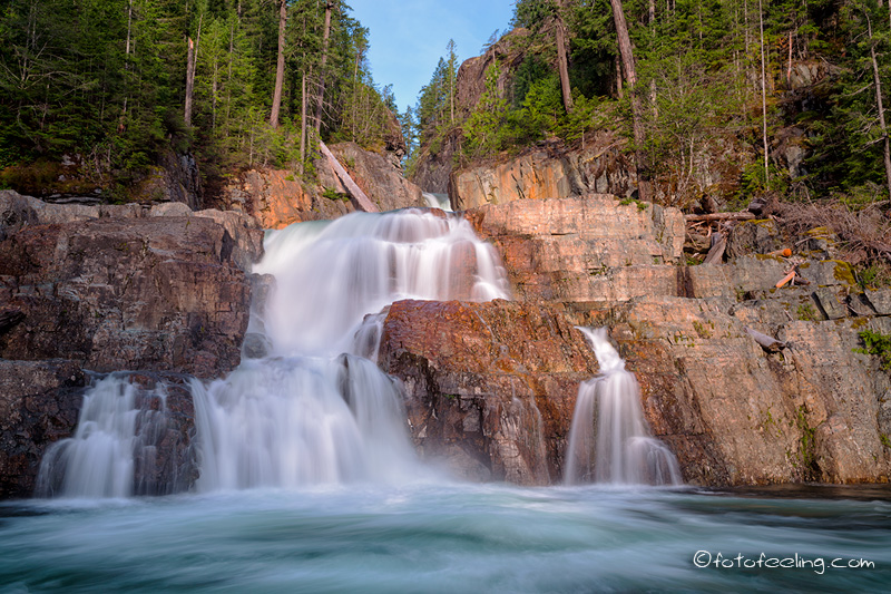 Wir hielten noch am Augerpoint wo man am Morgen einen tollen Blick über den Buttle Lake hatte und fuhren noch einmal zu den Lupin Falls. Dank Schleierwolken, die sich so nach und nach über den Himmel verteilt hatten, war das Licht perfekt.