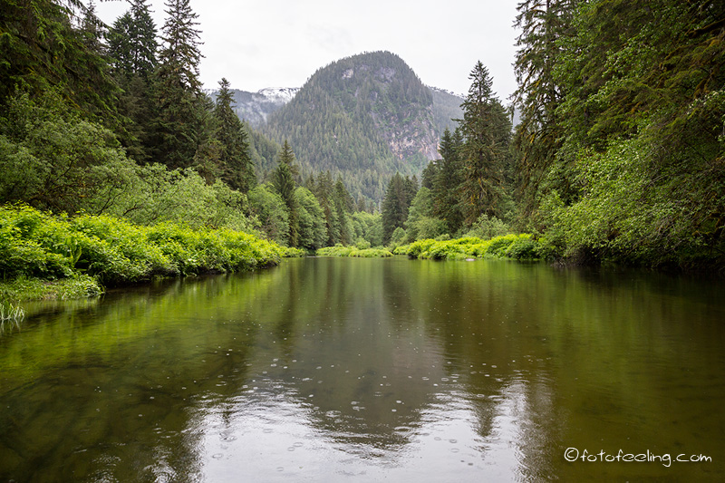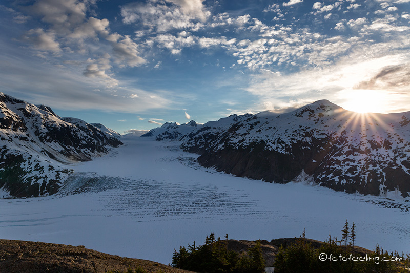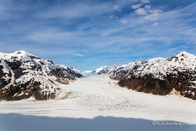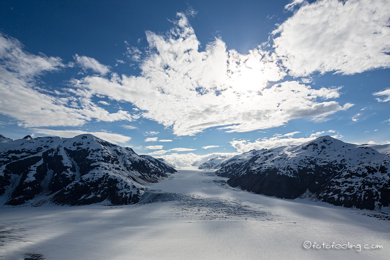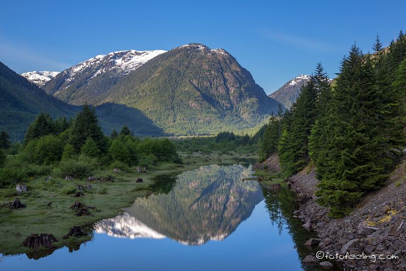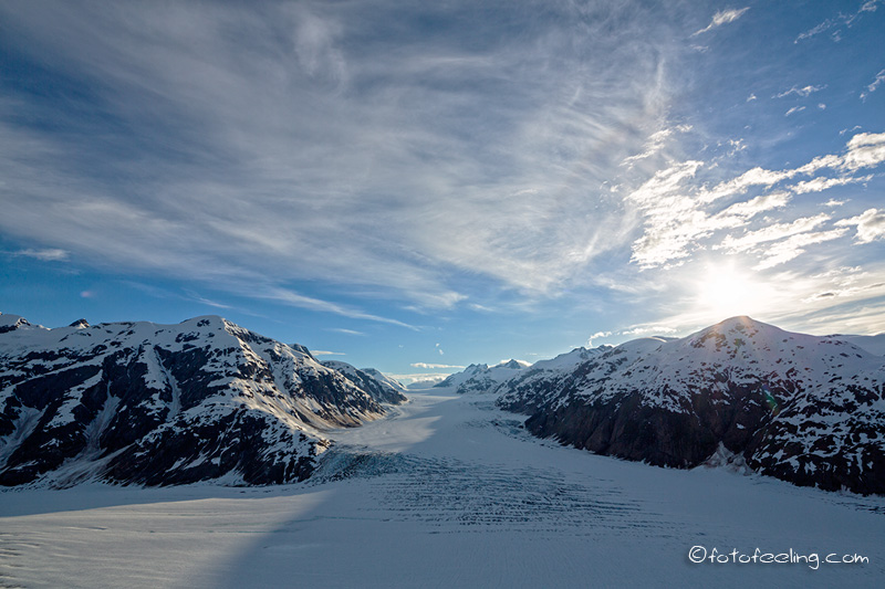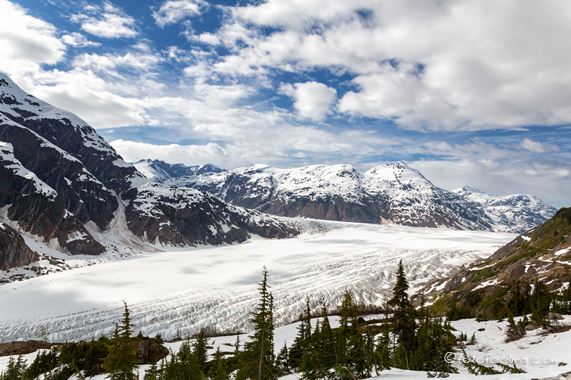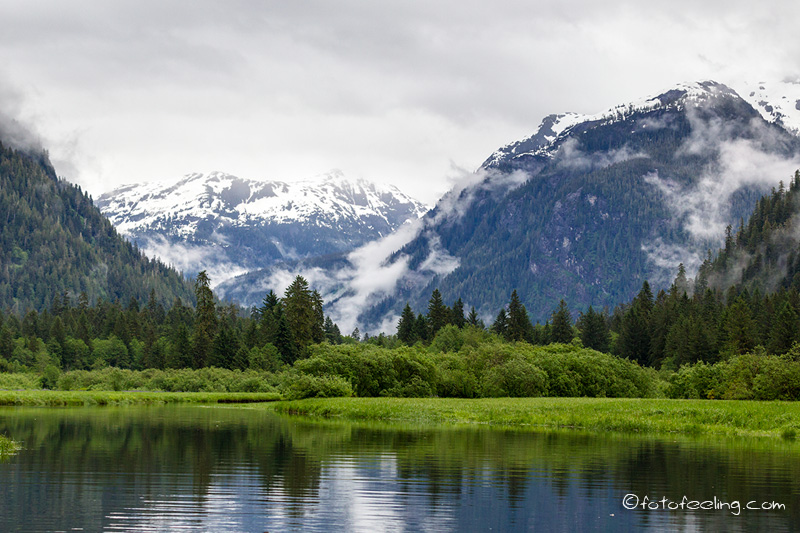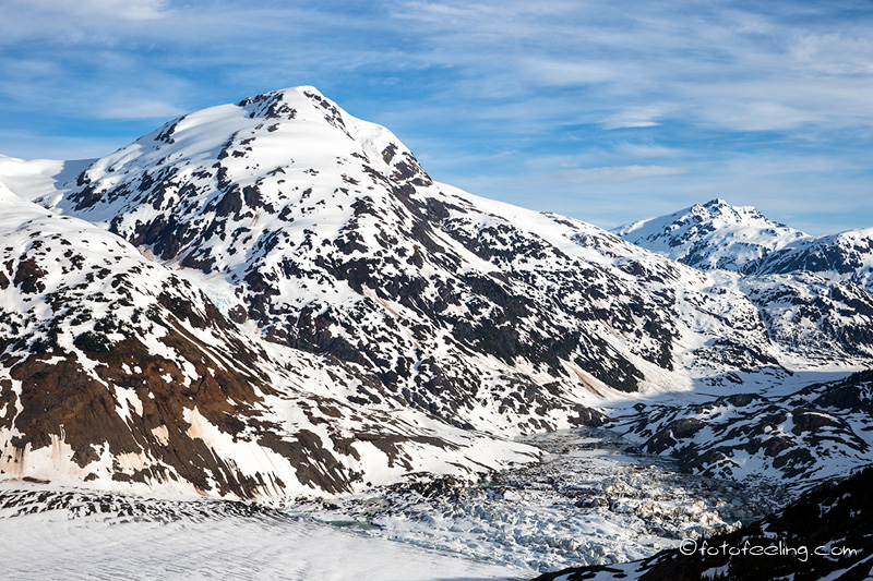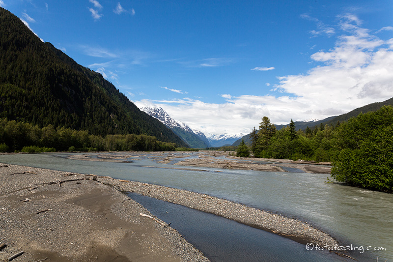 Auf brandneuer Teerstraße fuhren wir entlang des Salmon River unserem Tagesziel entgegen. Hohe schneebedeckte Berge bildeten die natürliche Flussumrandung. Wir kamen an dem Stegsystem des Fish Creek vorbei, wo sich im Herbst die Lachse, Bären und Menschen tummeln, aber momentan lag hier alles im Dornröschenschlaf. Die Landschaft war wieder einmal zum Niederknien, aber wir hatten keine Zeit zum Verweilen, denn die Wolken wurden dichter und wir wollten unbedingt noch bei Sonnenschein den Gletscher erreichen.