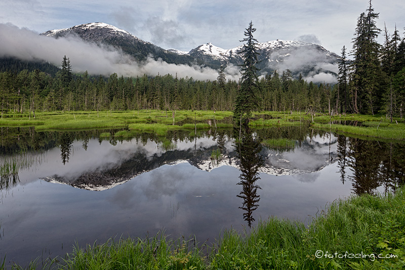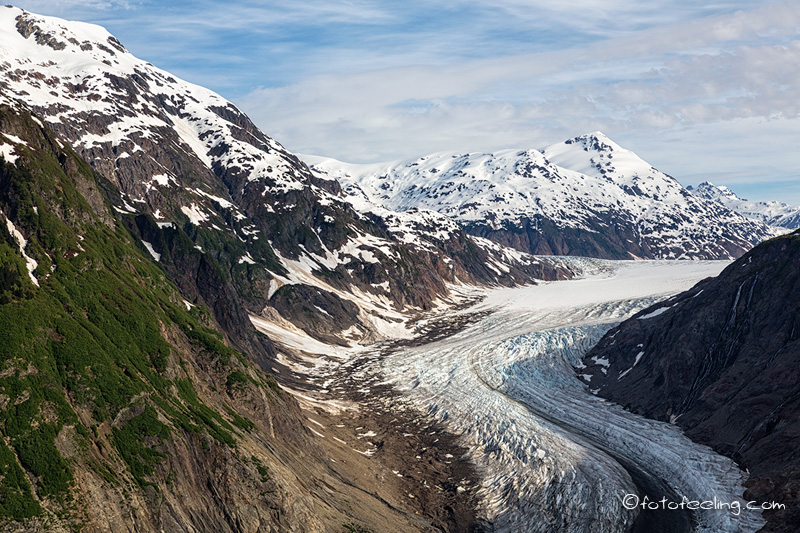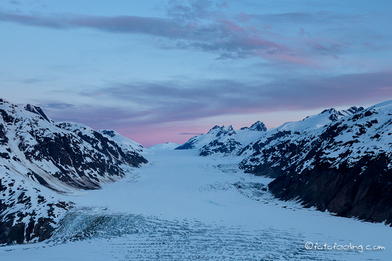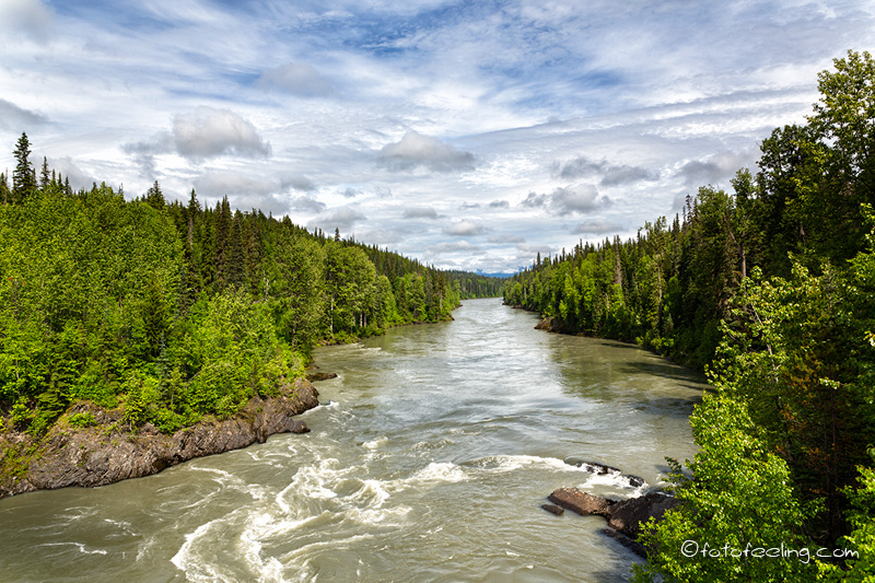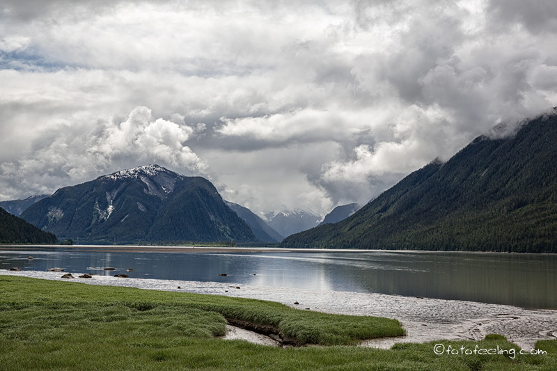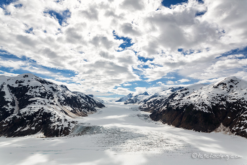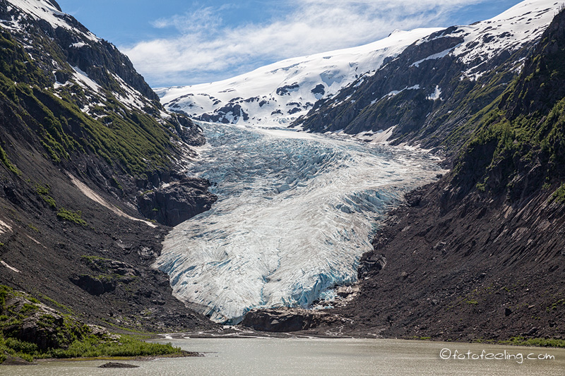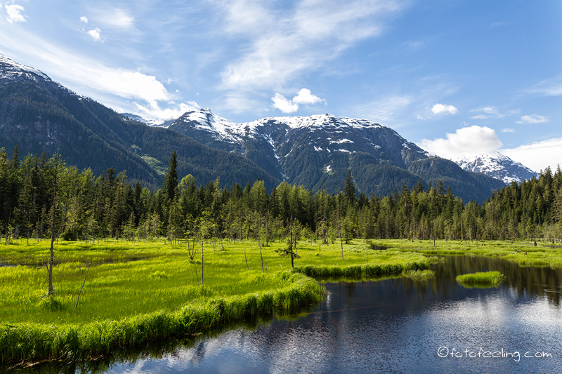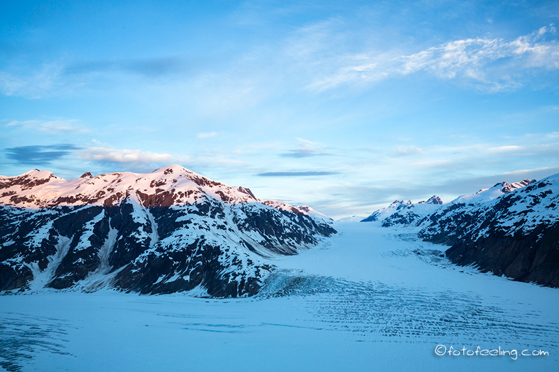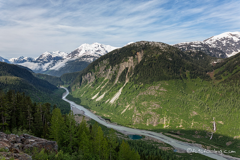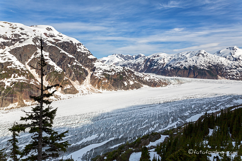 Auf brandneuer Teerstraße fuhren wir entlang des Salmon River unserem Tagesziel entgegen. Hohe schneebedeckte Berge bildeten die natürliche Flussumrandung. Wir kamen an dem Stegsystem des Fish Creek vorbei, wo sich im Herbst die Lachse, Bären und Menschen tummeln, aber momentan lag hier alles im Dornröschenschlaf. Die Landschaft war wieder einmal zum Niederknien, aber wir hatten keine Zeit zum Verweilen, denn die Wolken wurden dichter und wir wollten unbedingt noch bei Sonnenschein den Gletscher erreichen.