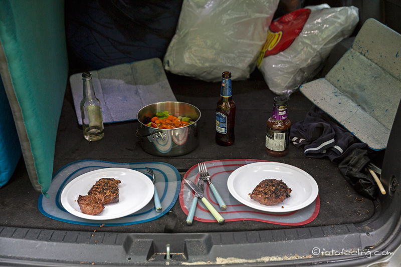 Im Ort schauten wir uns noch etwas um und sahen uns schon mal den Weg zur Fähre an. Im Supermarkt kauften wir ein paar Steaks ein, die wir später auf den Grill werfen wollten. Das Wetter war recht grau und die Wolken hingen tief, aber bis fast zum Essen regnete es nicht. Klar, als die leckeren Steaks auf dem Grillrost lagen, fing es natürlich zu regnen an, so dass wir mit aufgestellter Kofferraumklappe im Hinteren des Autos aßen. Unzählige Mücken umschwärmten uns, so dass ich mich erst einmal einsprühte. Chris verzichtete auf das Mückenmittel, denn die stechen ja nicht – meinte er. Am nächsten Tag bekam er die Rechnung, denn unzählige juckende Stiche bedeckten seine Arme und Beine. An diesem Abend war jedoch noch alles fein. Wir hatten auf dem Campingplatz geduscht und ließen uns vom Regen nicht ärgern. Ganz im Gegenteil, wir hatten viel Spaß an diesem Abend und das Fleisch war trotz Regen perfekt gegrillt. Leider mussten wir uns schon früh ins Auto zurückziehen, denn der Regen wollte nicht mehr nachlassen. So schauten wir uns noch ein Stündchen den Film „Mr. Brooks“ an. Ein sehr spannender Krimi mit Kevin Costner als Mörder. Doch um 21 Uhr fielen uns langsam die Augen zu und wir unterbrachen unser Abendprogramm für eine ordentliche Runde Schlaf.