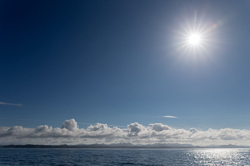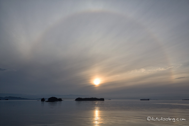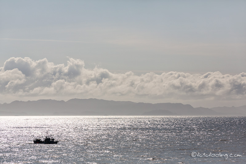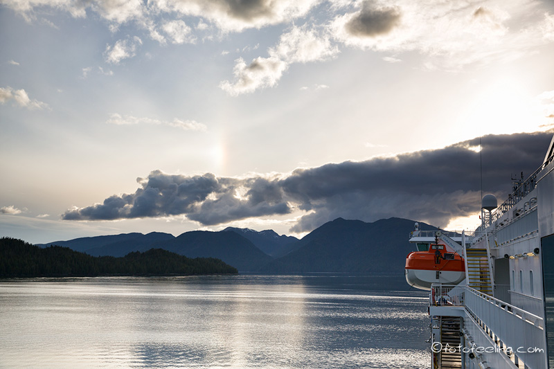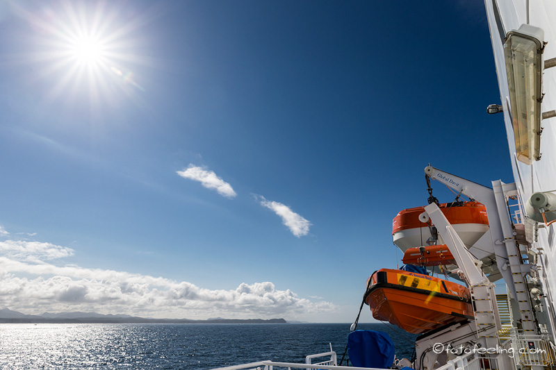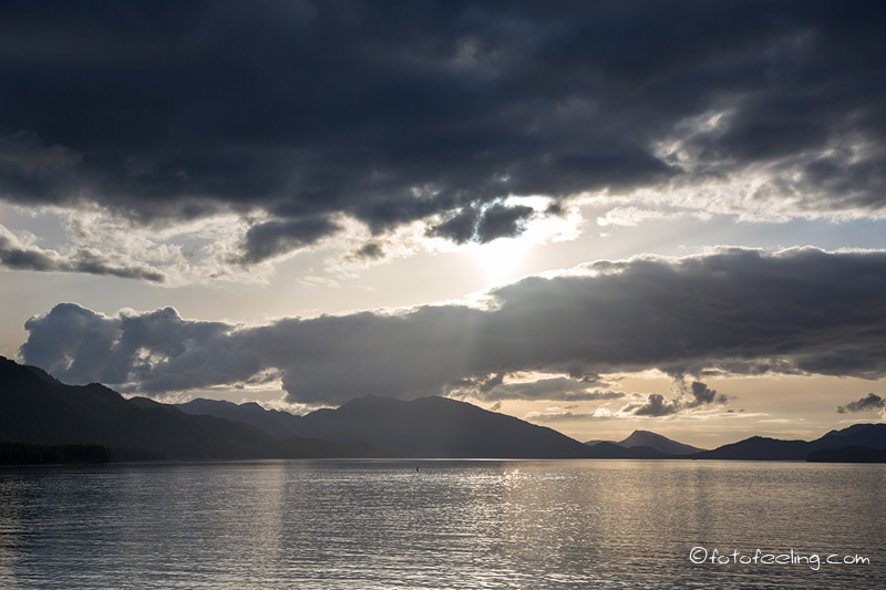 Als es am frühen Abend zu kalt wurde, zogen wir uns wieder ins Innere der Fähre zurück. Wir gönnten uns noch einen Burger zum Abendessen und bestaunten die Landschaft nun wieder hinter Glas. Zum Sonnenuntergang lief Chris noch einmal nach draußen und machte ein paar letzte Bilder, ehe die Sonne in den Wolken verschwand.