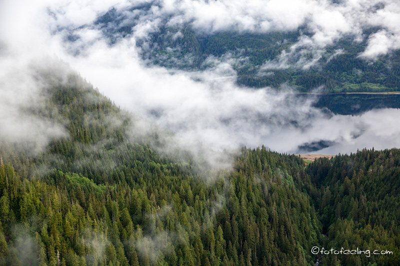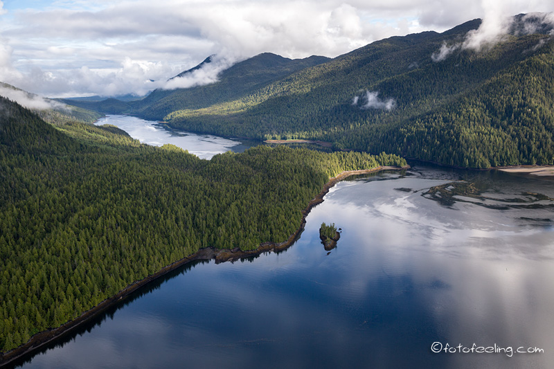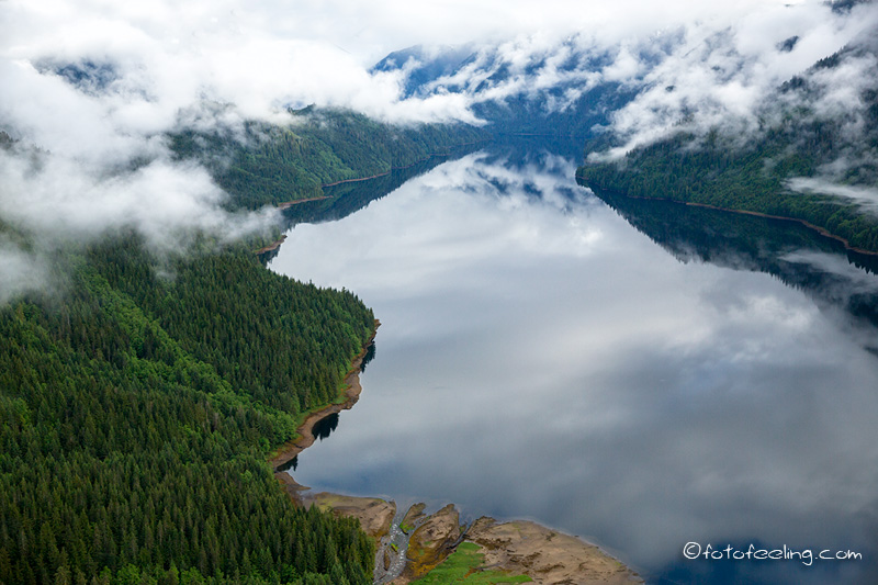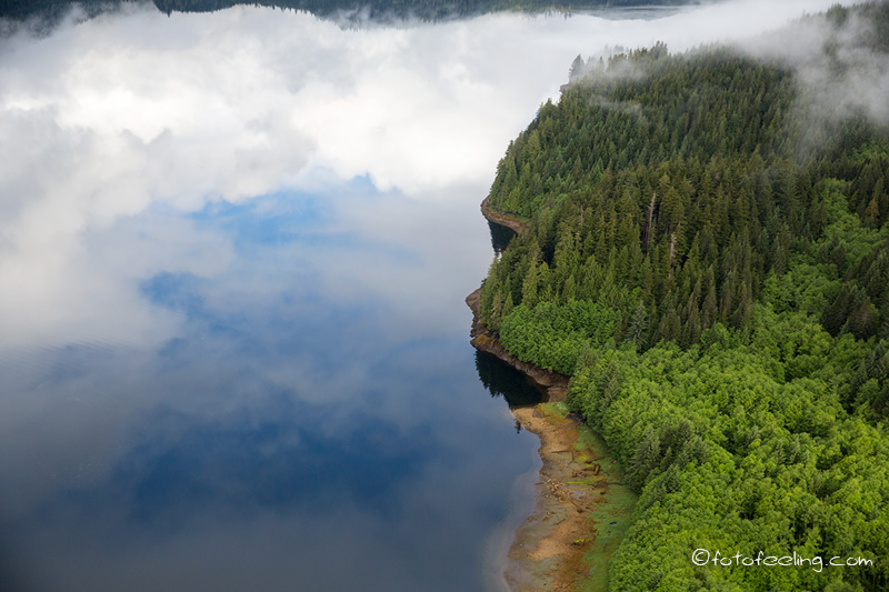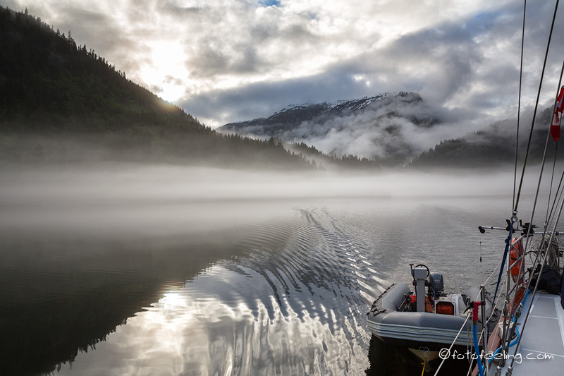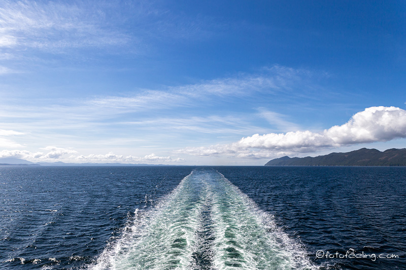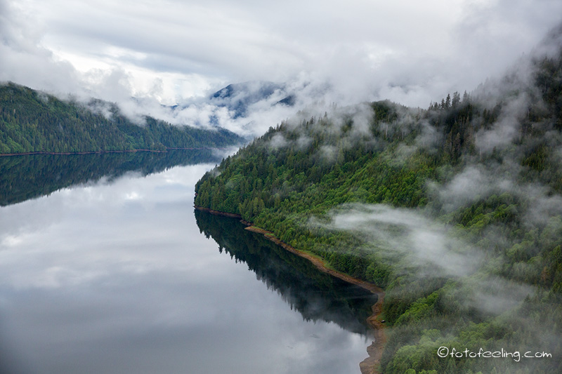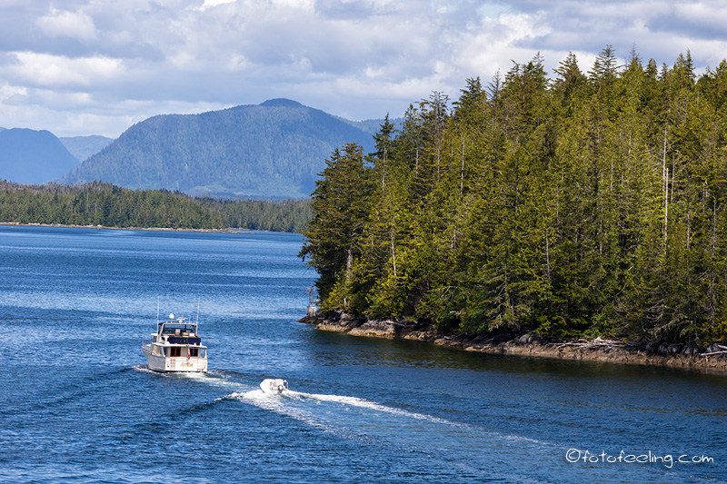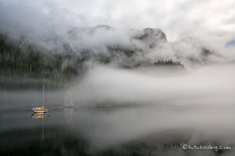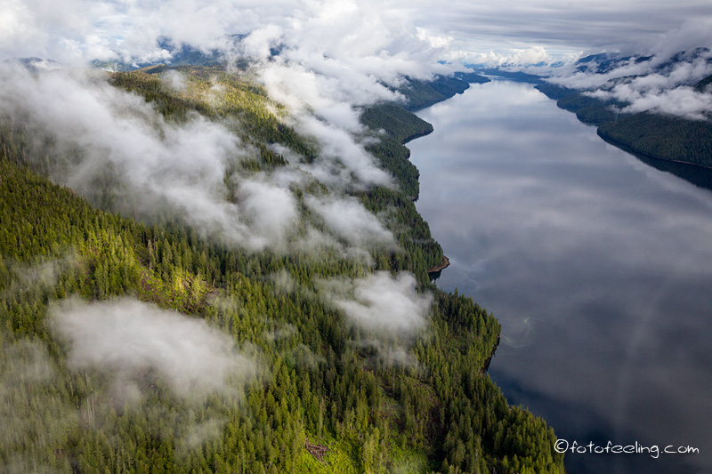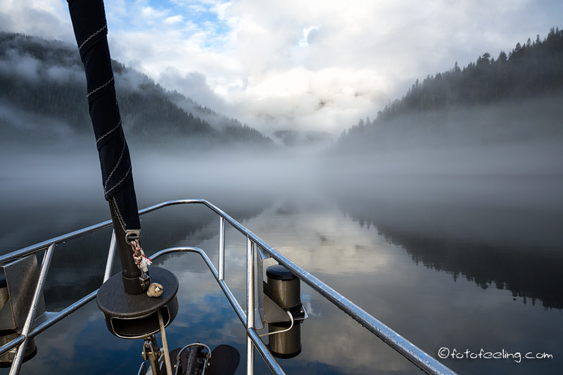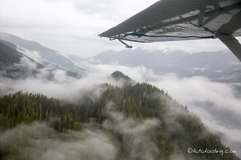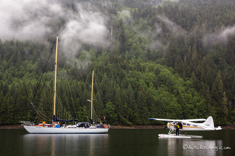 Unser Segelschiff fuhr langsam dem Ausgang des Parks entgegen, denn nur dort durften die Wasserflugzeuge landen. Insgeheim hofften wir, dass der Nebel zu dicht für die Flugzeuge wäre und wir noch einen Tag länger bleiben konnten, aber leider wurde nichts daraus. So schossen wir noch ein paar letzte Bilder als die Wasserflugzeuge landeten und warfen den Neuankömmlingen leicht neidische Blicke zu. Doch unser Besuch endete heute hier und so stiegen wir schweren Herzens aber auch mit Vorfreude auf unser nächstes Ziel in den Flieger, der uns zurück nach Prince Rupert brachte. Auch von oben war die Landschaft einfach zauberhaft mit dem Nebel unter uns. Viel zu kurz war der Flug und schon landeten wir wieder im Wasserflughafen. Wir verabschiedeten uns von Mehmet und Susanna. Nicci war einfach an Bord des Schiffes geblieben und würde dort noch drei weitere Nächte verbringen.