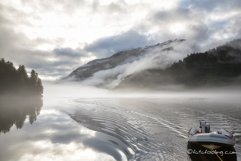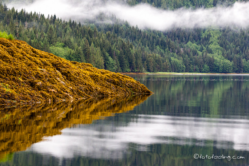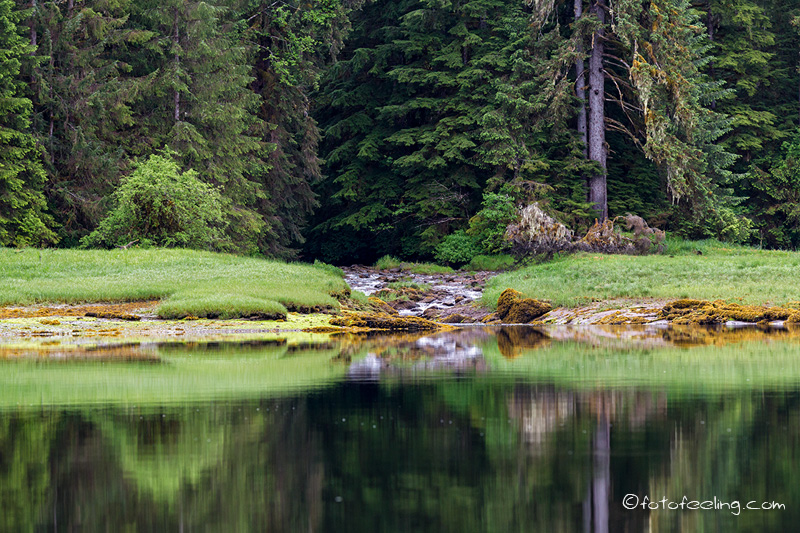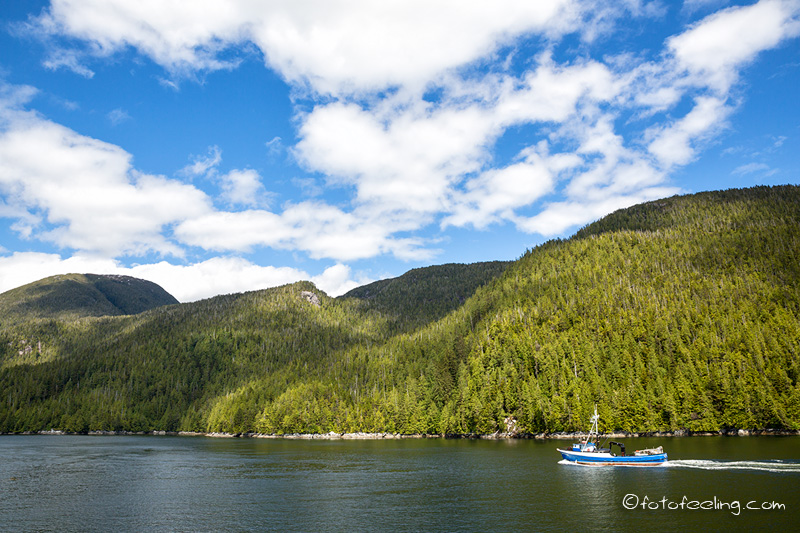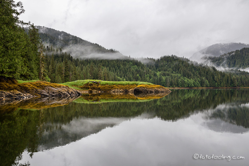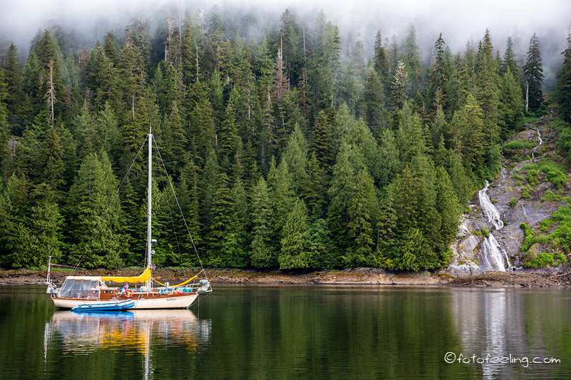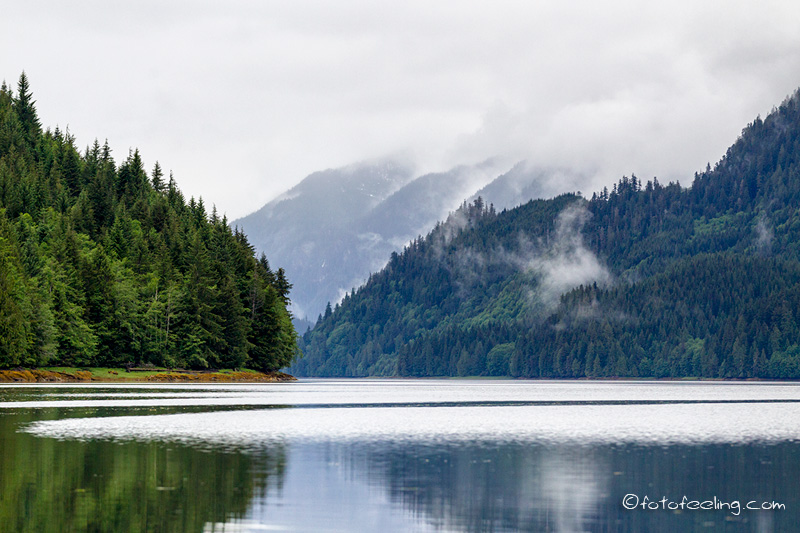 Nach einigen Stunden fuhren wir wieder zum Schiff zurück und tranken erst einmal einen heißen Kakao. Draußen war es fast windstill und die Landschaft spiegelte sich wunderschön im Wasser. Da machte Tom das Zodiac noch einmal klar und wir fuhren noch eine kleine Landschaftsrunde durch das Khutzeymateen Valley. Hohe Berge und eine ursprüngliche absolut unveränderte Landschaft lagen vor uns. Dichter Regenwald mit Farnen und Flechten wuchs üppig an den Berghängen. Hier gab es nur zwei Segelschiffe, eine kleine Rangerstation, Tiere und eine einzigartige naturbelassene Landschaft.