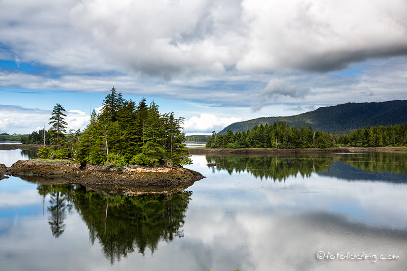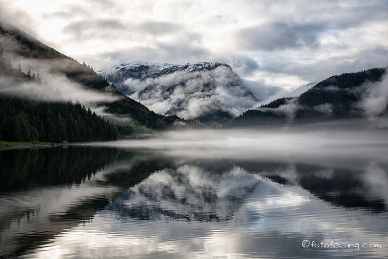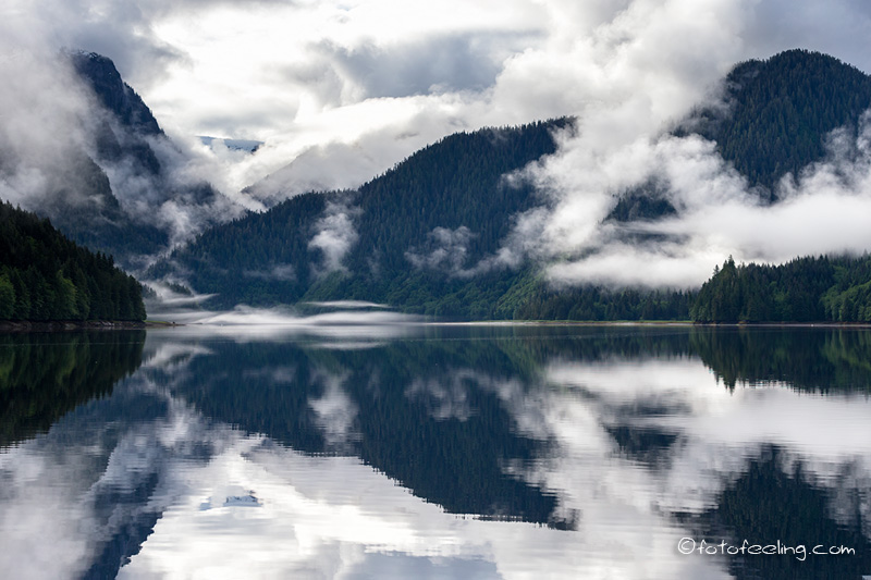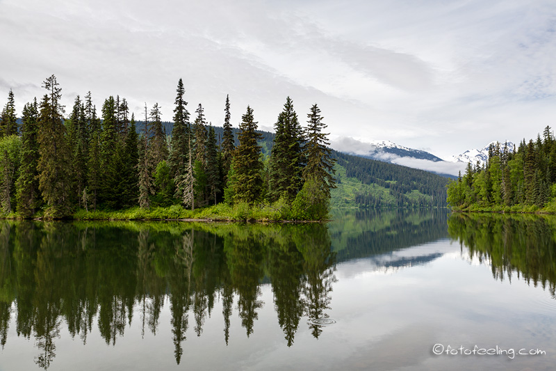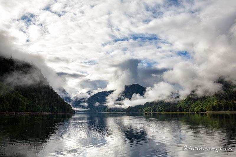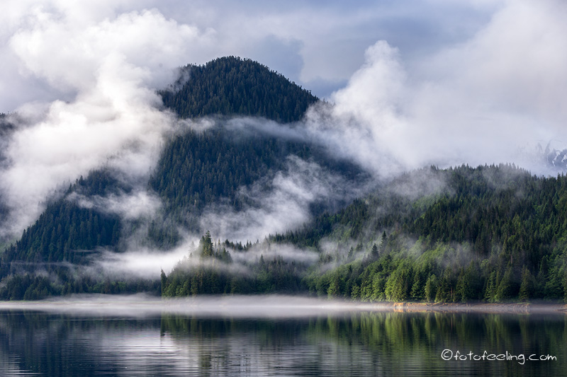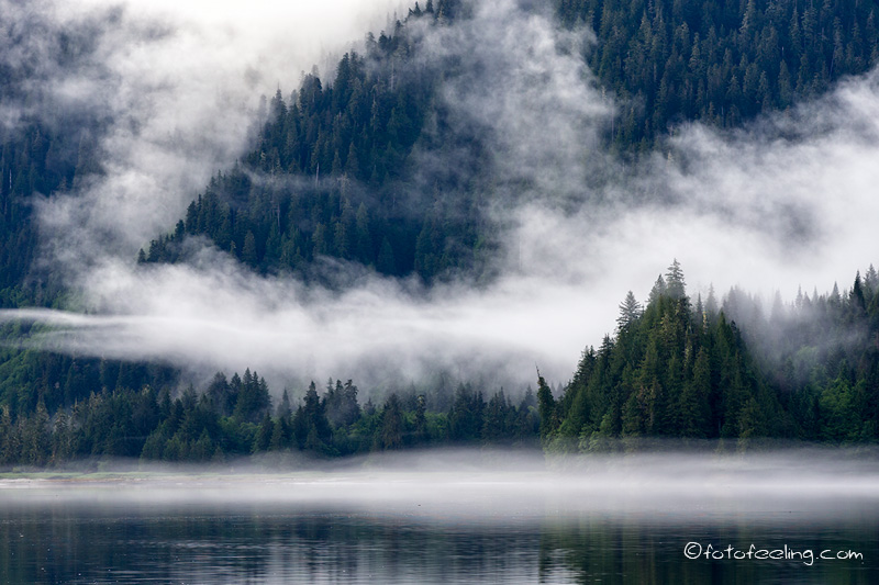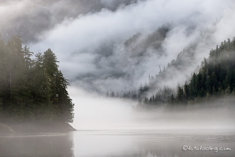 Nach einigen Stunden fuhren wir wieder zum Schiff zurück und tranken erst einmal einen heißen Kakao. Draußen war es fast windstill und die Landschaft spiegelte sich wunderschön im Wasser. Da machte Tom das Zodiac noch einmal klar und wir fuhren noch eine kleine Landschaftsrunde durch das Khutzeymateen Valley. Hohe Berge und eine ursprüngliche absolut unveränderte Landschaft lagen vor uns. Dichter Regenwald mit Farnen und Flechten wuchs üppig an den Berghängen. Hier gab es nur zwei Segelschiffe, eine kleine Rangerstation, Tiere und eine einzigartige naturbelassene Landschaft.