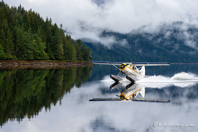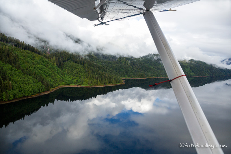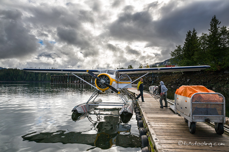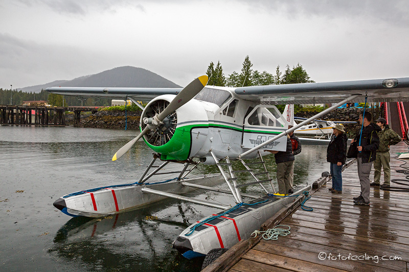 Nach dem guten Frühstück, das aus Müsli, Obst, Joghurt, Eiern mit Speck und Waffeln bestand, ging es los zum Wasserflughafen. Uns stand eine kleine Premiere bevor, denn wir würden zum ersten Mal in unserem Leben mit einem Wasserflugzeug fliegen und dementsprechend hibbelig waren wir. Am Wasserflugzeughafen konnten wir unser Auto direkt bei der Airline abstellen und hatten so wegen unserer zurückbleibenden Sachen ein besseres Gefühl. Dann wurden unsere Rucksäcke und Taschen gewogen. Eigentlich wollte Chris das 500er mitnehmen, aber alle anderen lächelten und sagten, dass wir weder ein Stativ noch das 500er brauchen würden, da wir sehr nah an die Bären heran kämen. Schweren Herzens entschied sich Chris dafür, das gute Stück im Auto zu lassen. Hoffentlich war das eine kluge Entscheidung – den Zwiespalt konnte man ihm so richtig ansehen. Doch für viele Gedanken war keine Zeit, denn schon wurden wir in zwei Gruppen eingeteilt und zu zwei Wasserflugzeugen gebracht. Leider regnete es an diesem Morgen.
