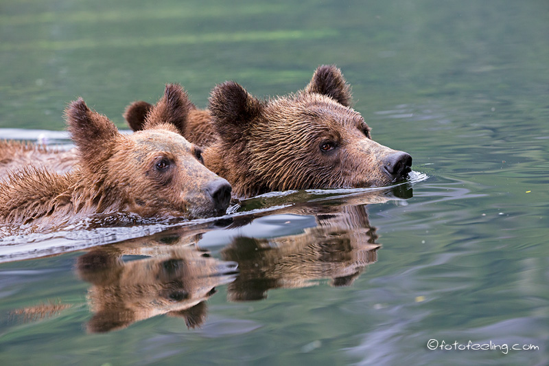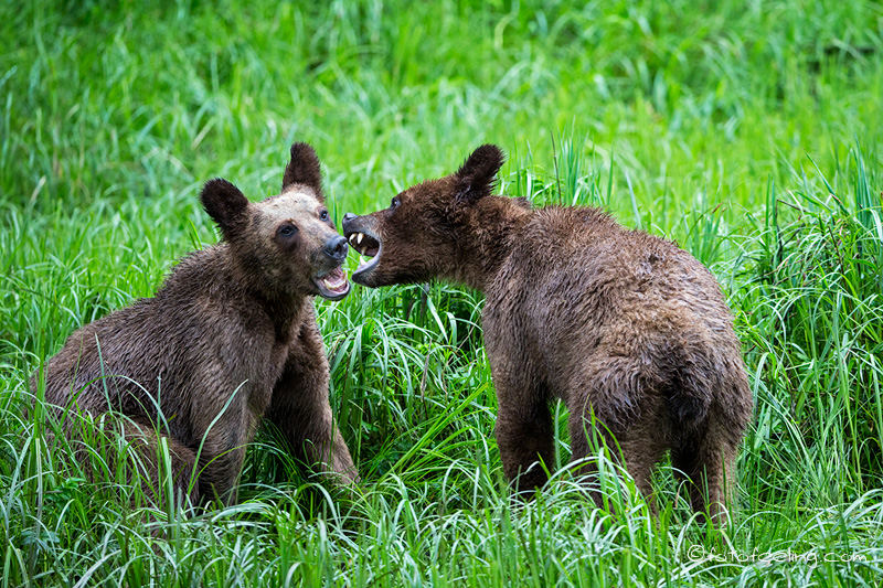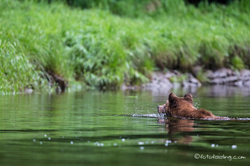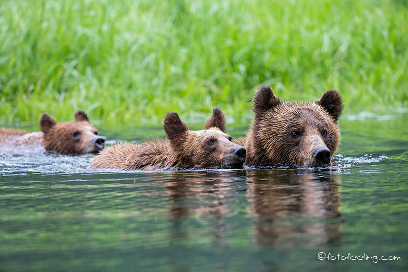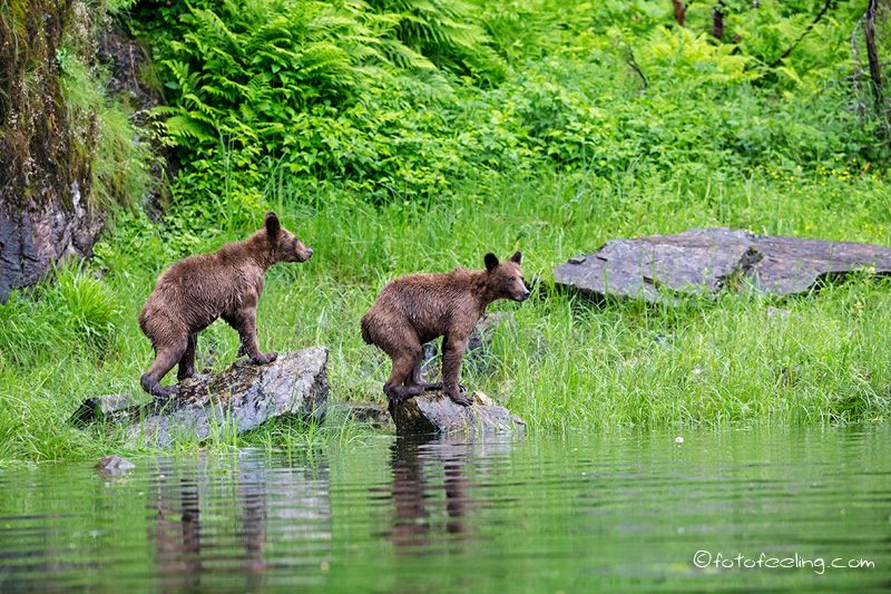 Am Nachmittag trafen wir noch einmal auf die Bärin mit den zwei Jungen. Wieder schwammen sie vor uns durch das Wasser. Die Kleinen fingen im Gras an zu raufen und überhörten das Rufen der Bärin. Die kam dann aufgeregt angelaufen und rief nach den Jungen.